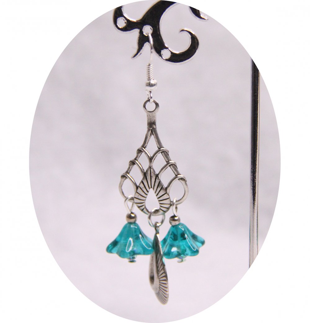 Pour ces boucles d'oreilles d'un style art nouveau j'ai associé deux fleurs bleues en verre tchèque à des estampes haute qualité de style art nouveau en laiton plaqué en coloris argent antique.