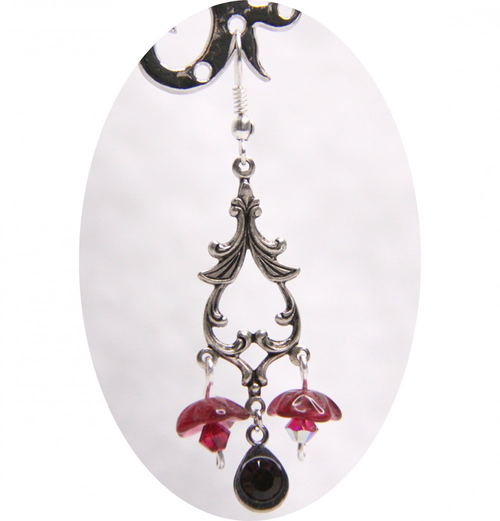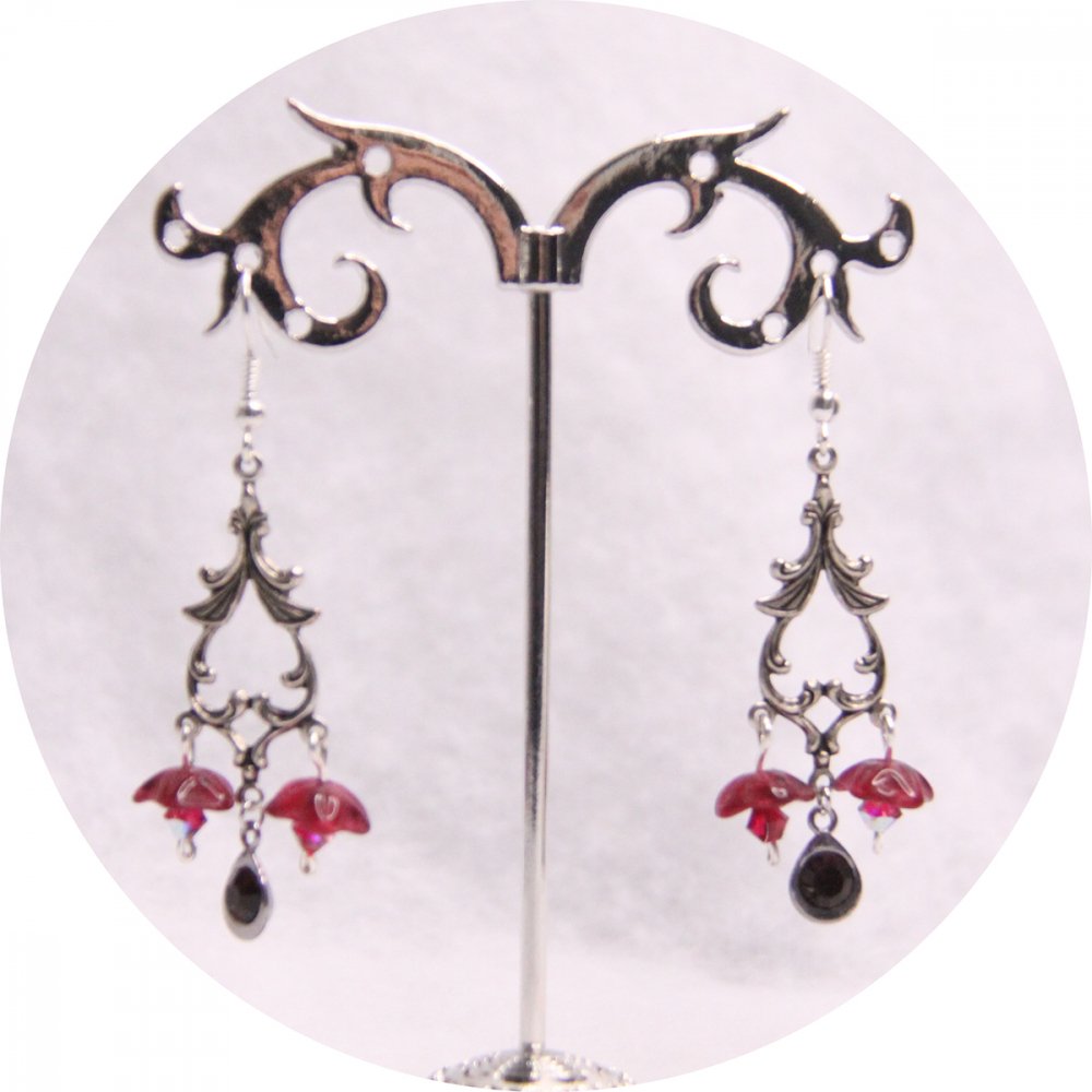 Pour ces boucles d'oreilles d'un style victorien j'ai associé deux fleurs rouge / rose foncé en verre tchèque à des estampes haute qualité de style victorien en laiton plaqué en coloris argent antique.