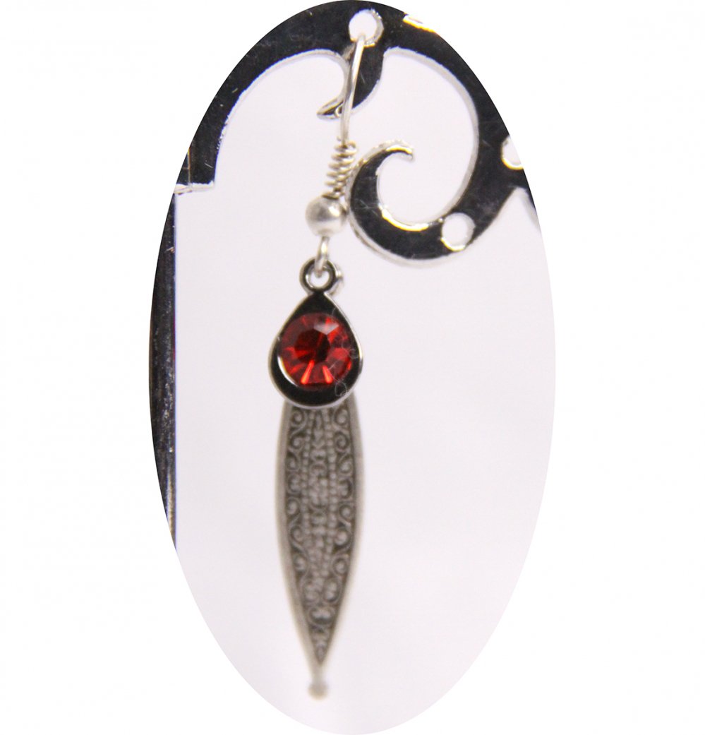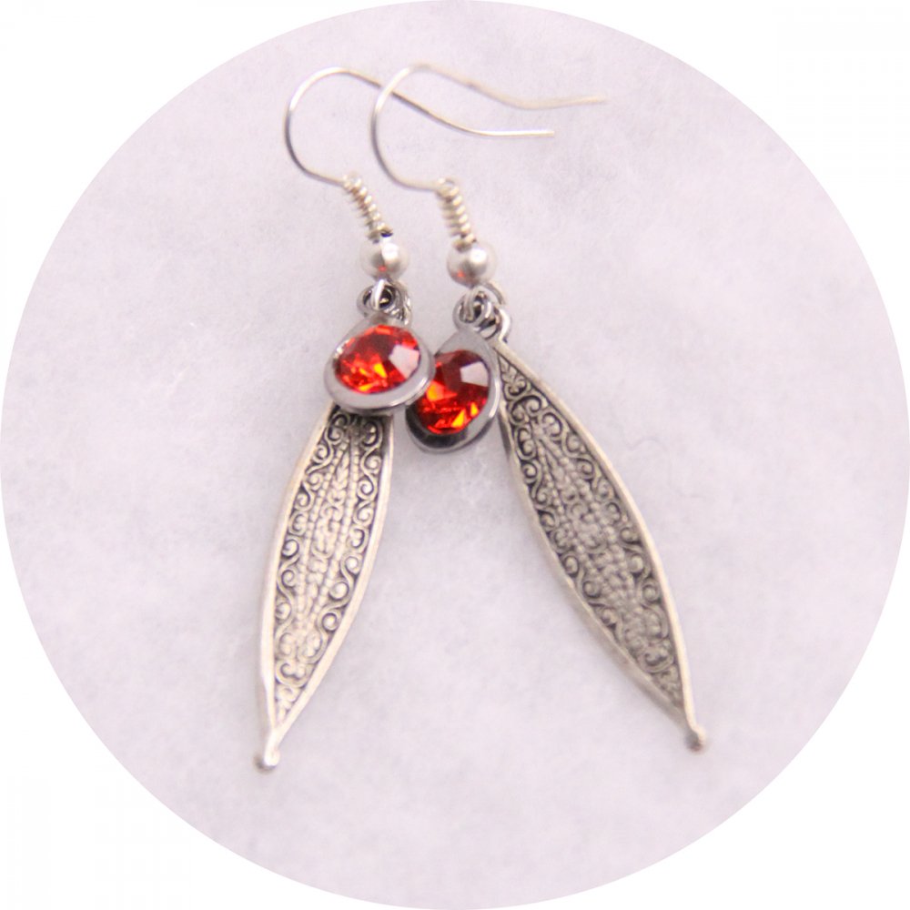 Pour ces boucles d'oreilles d'un style un peu médiéval j'ai associé de petits cristaux colorés rouges à des estampes haute qualité en laiton plaqué filigrané en coloris argent antique.