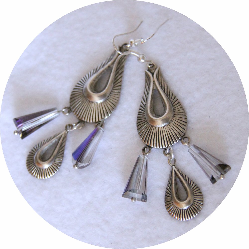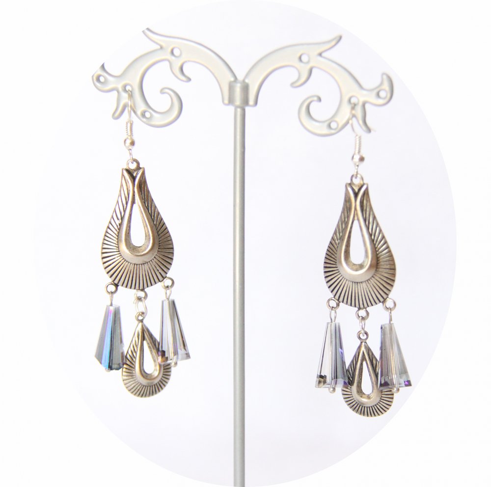 Boucles d'oreilles rétro art déco gouttes en cristal bleu avec pampilles art déco argentée