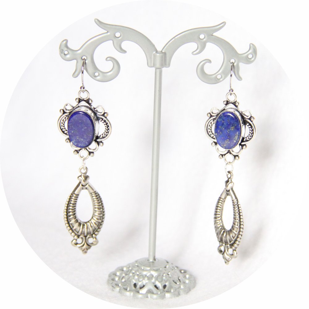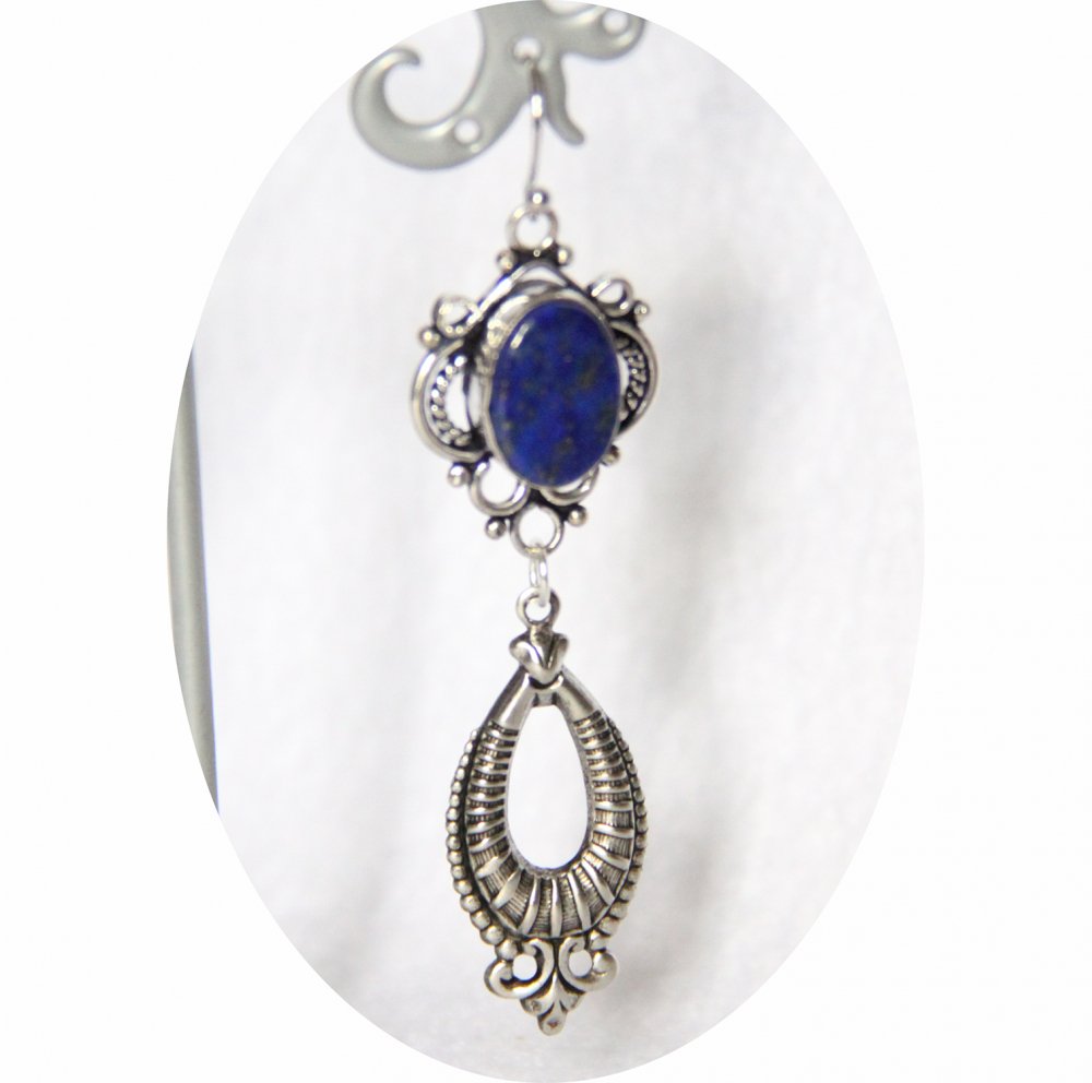 Boucles d'oreilles rétro baroque bleue en lapis lazuli avec pampille art déco argentée
