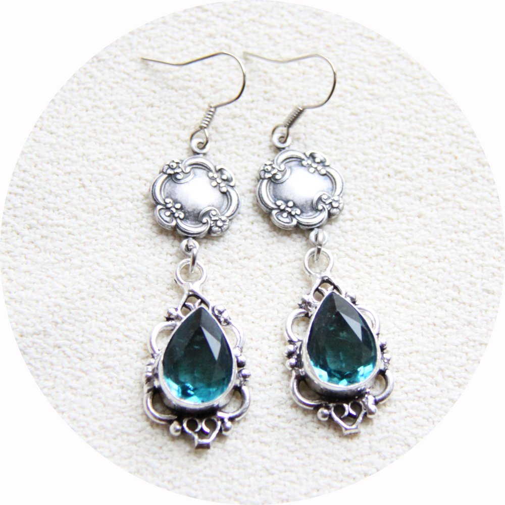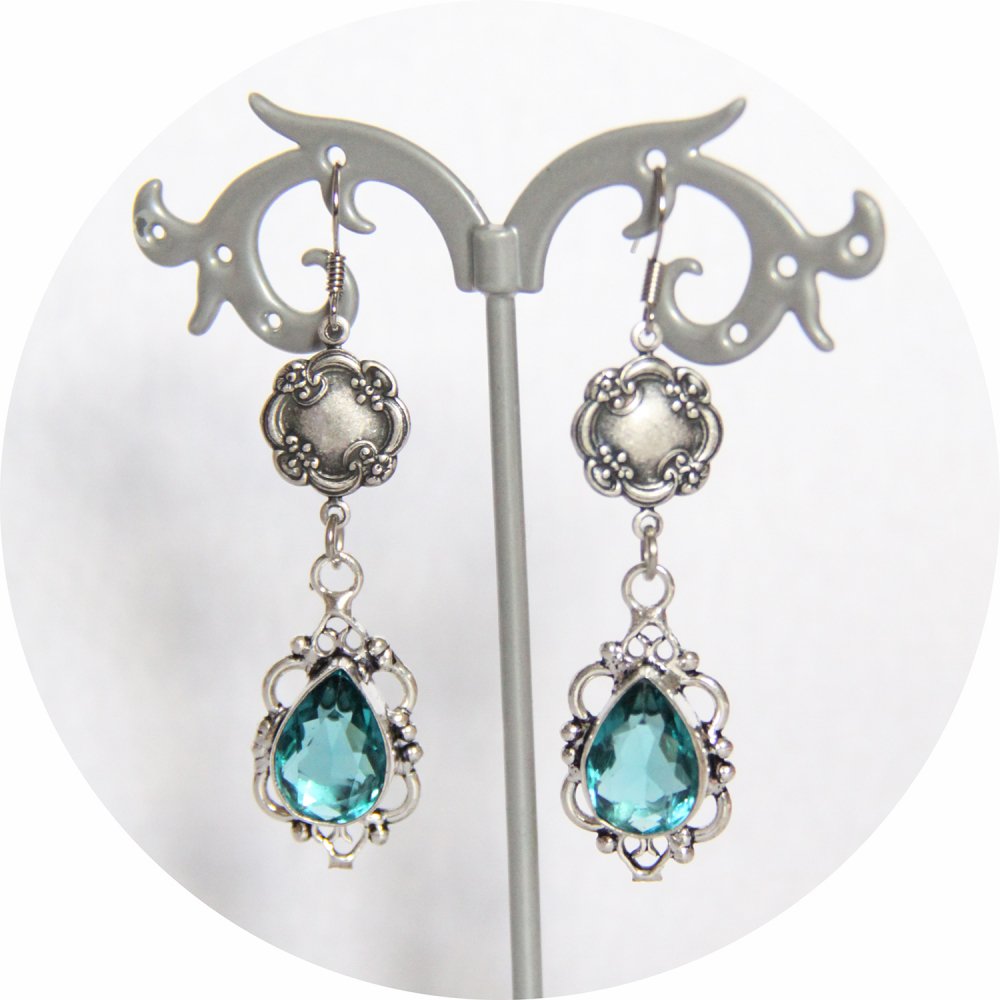 Pour ces boucles d'oreilles d'un style rétro j'ai associé un cabochon en verre vert bleu saphir sur une monture plaquée argent à des estampes haute qualité de style baroque en laiton plaqué en coloris argent antique.