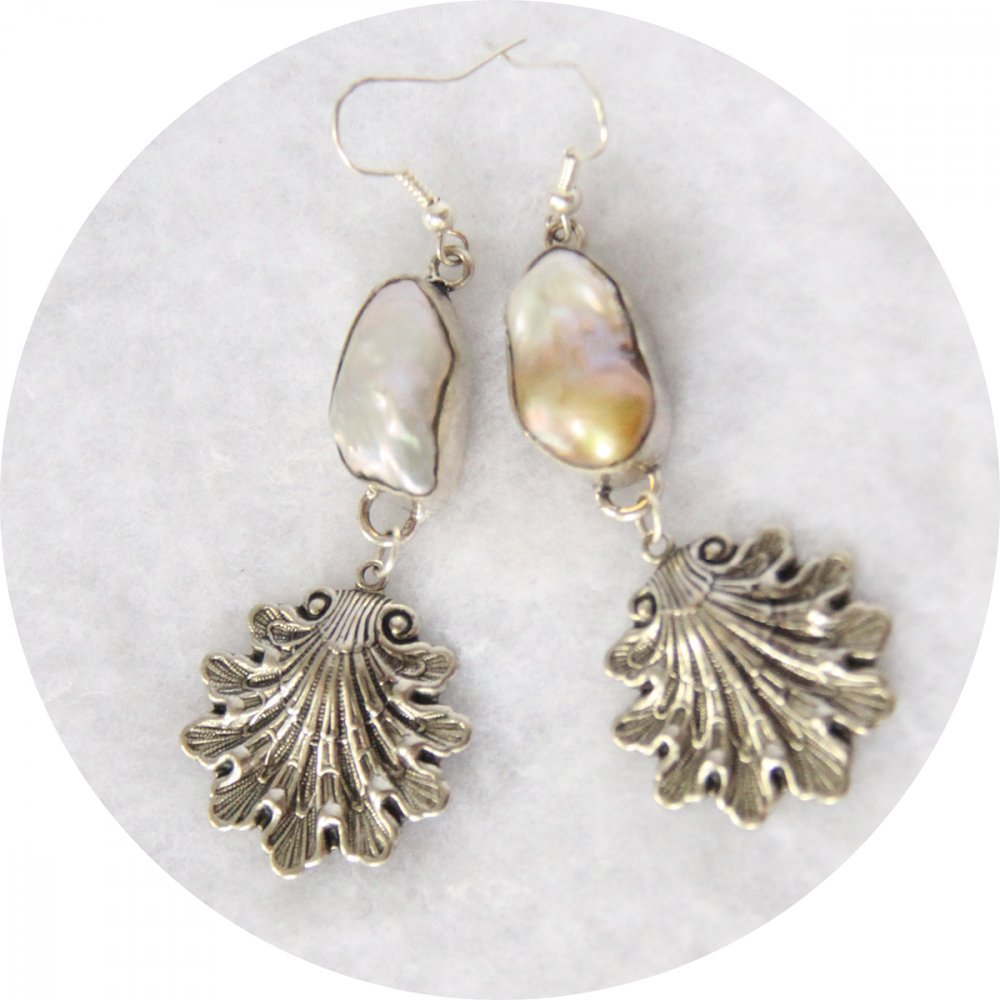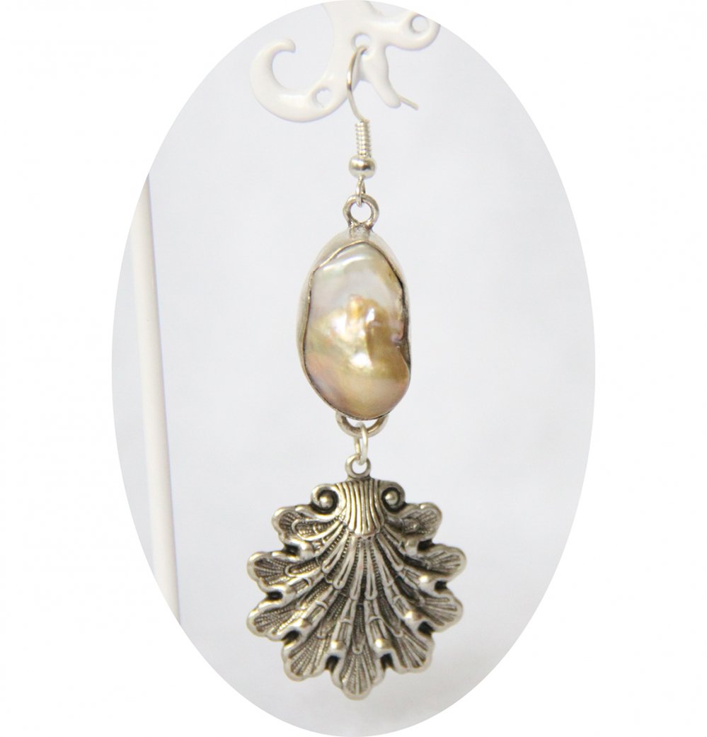 Pour ces boucles d'oreilles d'un style rétro j'ai associé un cabochon en nacre ivoire sur une monture plaquée argent à des estampes haute qualité en forme de coquillage en laiton plaqué en coloris argent antique.