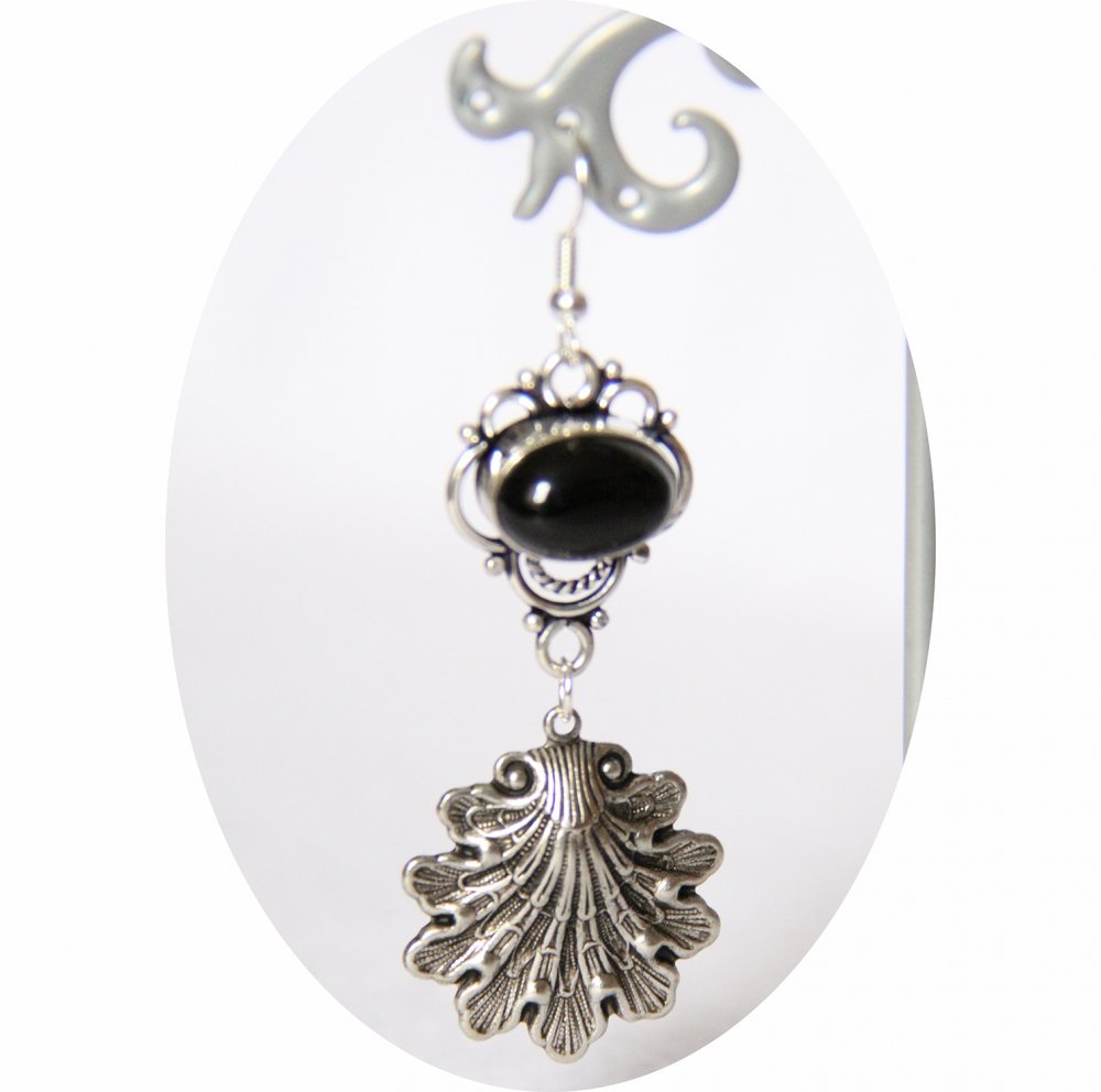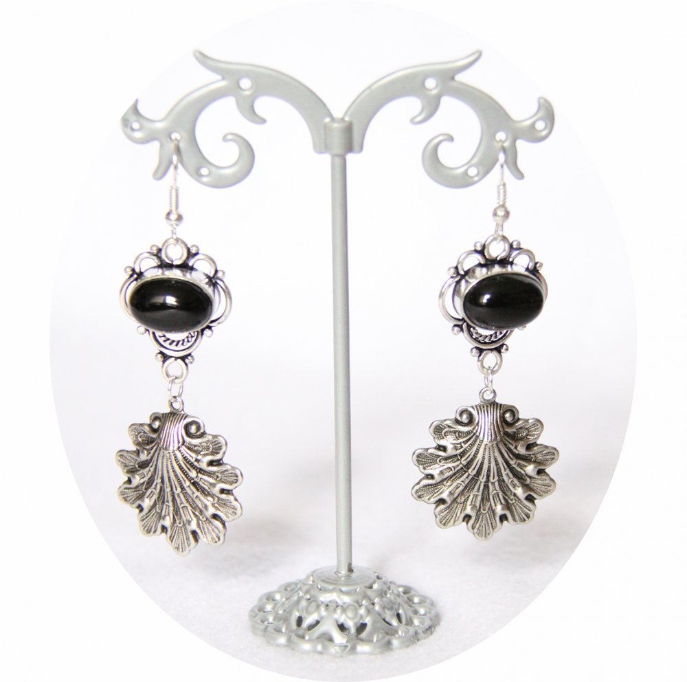 Pour ces boucles d'oreilles d'un style rétro j'ai associé un cabochon en onyx noir sur une monture plaquée argent à des estampes haute qualité en forme de coquillage en laiton plaqué en coloris argent antique.