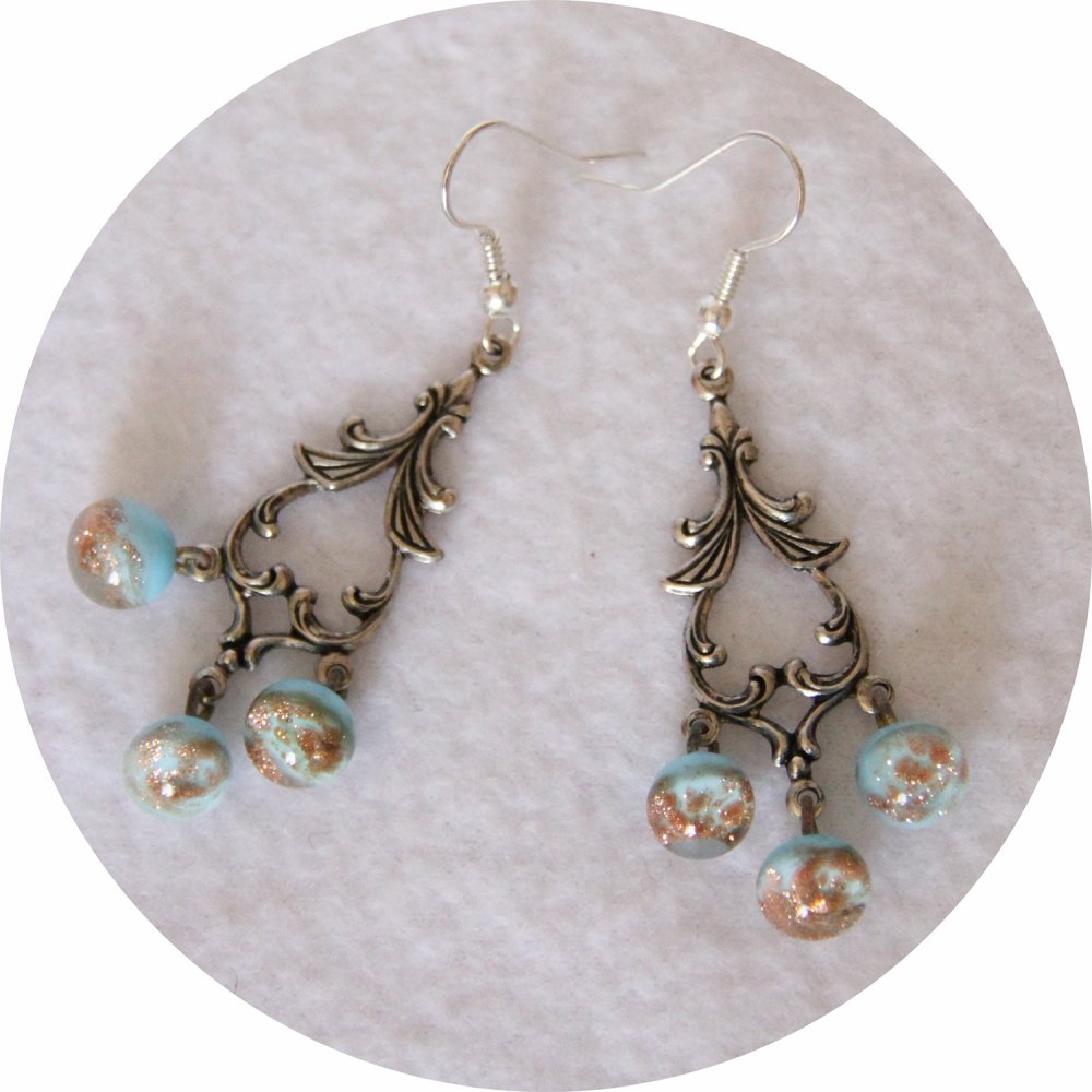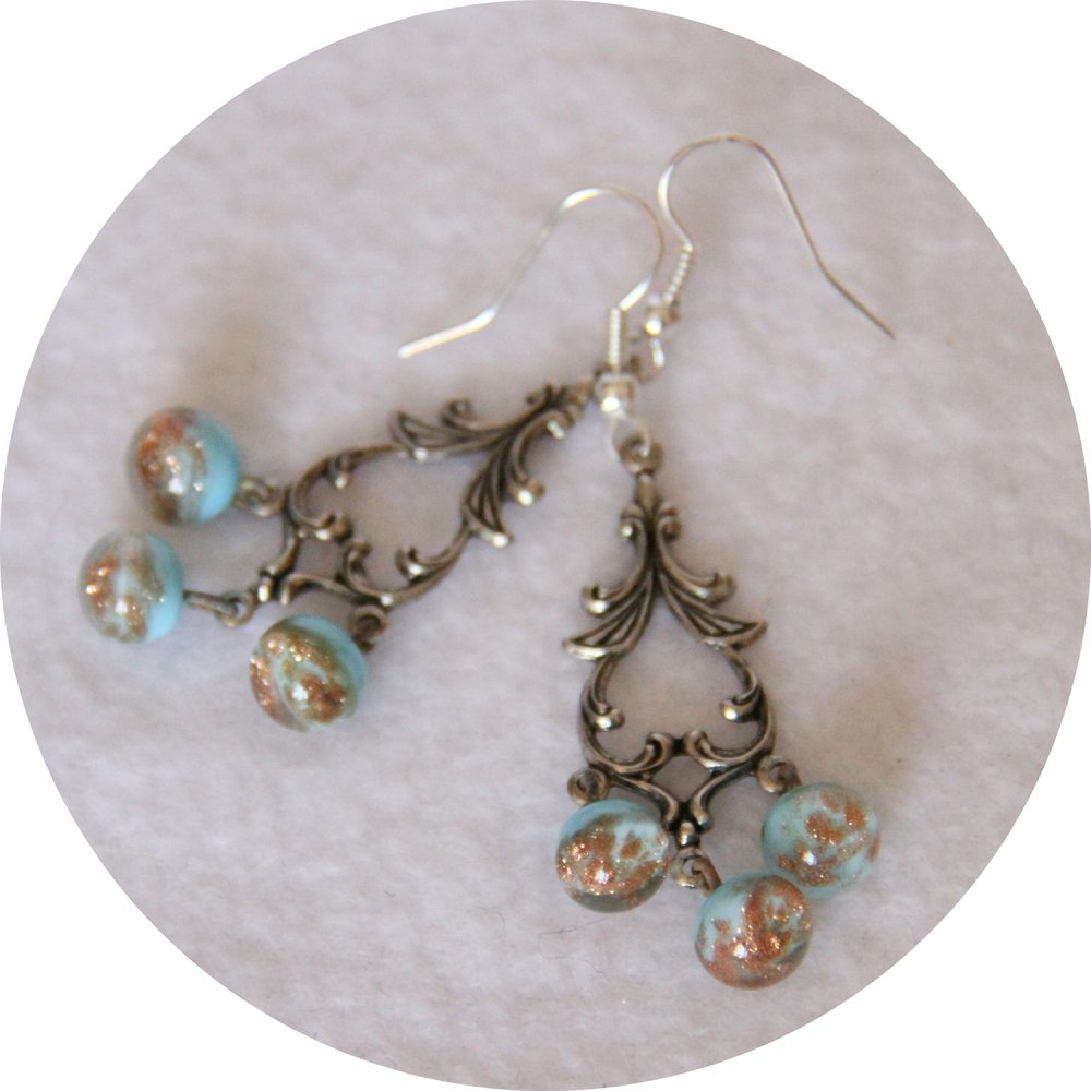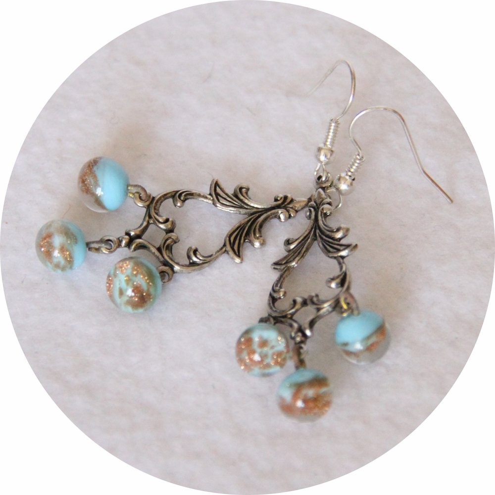 Pour ces boucles d'oreilles d'un style rétro j'ai associé des petits boutons perles en verre bleu turquoise et paillettes dorés à des estampes haute qualité de style baroque en laiton plaqué en coloris argent antique.