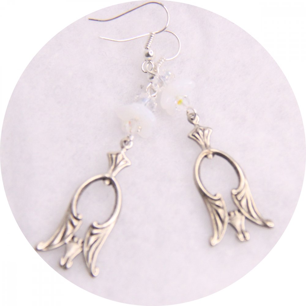 Pour ces boucles d'oreilles d'un style rétro j'ai associé des perles fleur blanche en verre tchèque à des estampes haute qualité de style baroque en laiton plaqué en coloris argent antique.