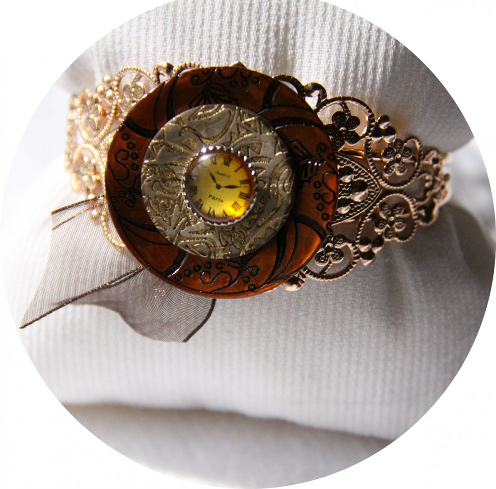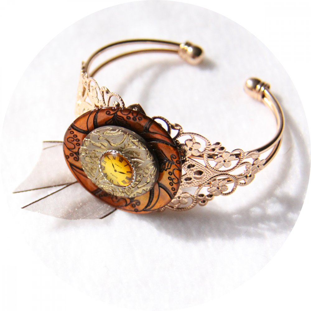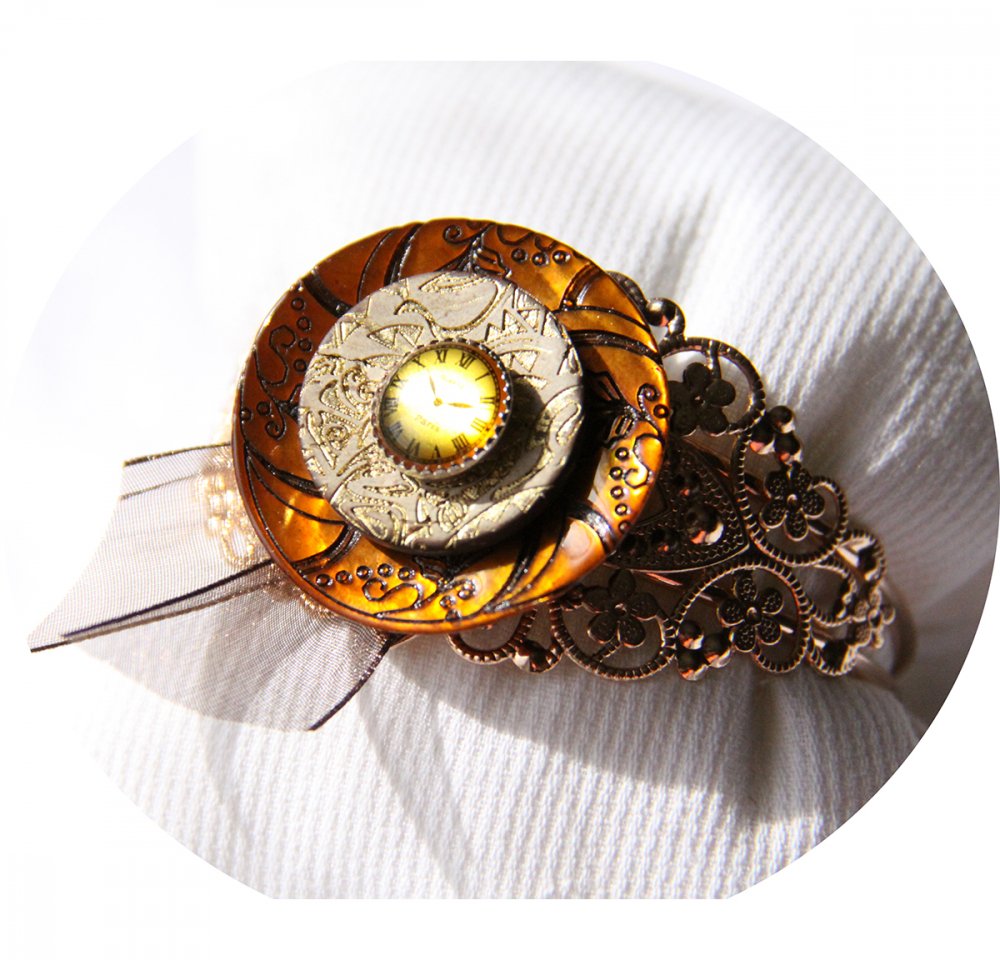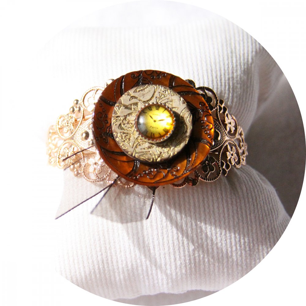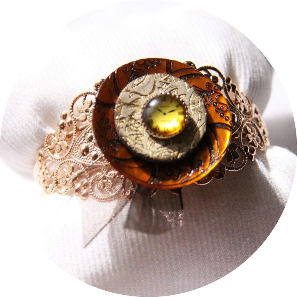 Pour ce bracelet inspiré par l'univers Steampunk j'ai associé un grand bouton de nacre orangée avec des dessins noirs, un bouton de coco ouvragé doré et un mini cadran de montre dans les tons ocre. L'ensemble est monté sur un bracelet en métal doré rigide et ajustable.