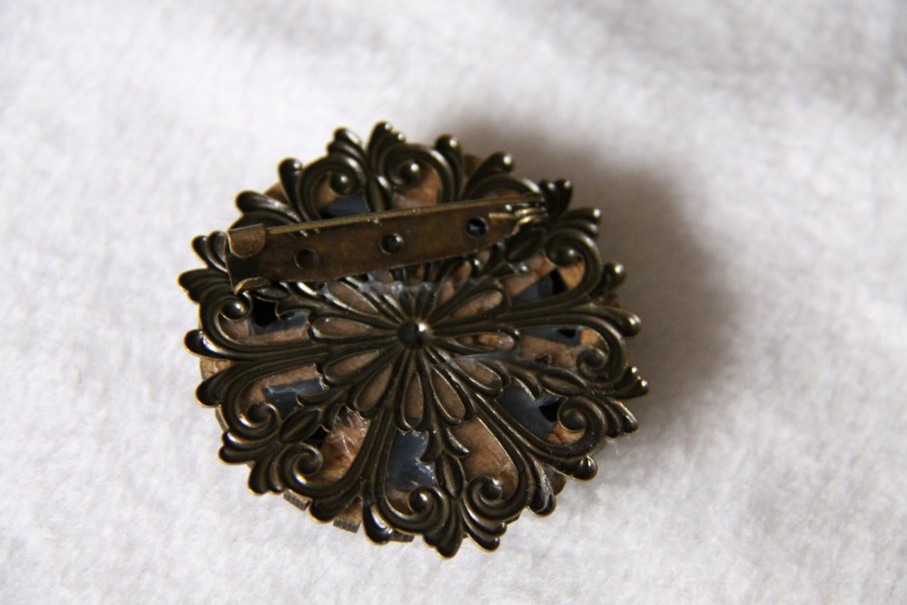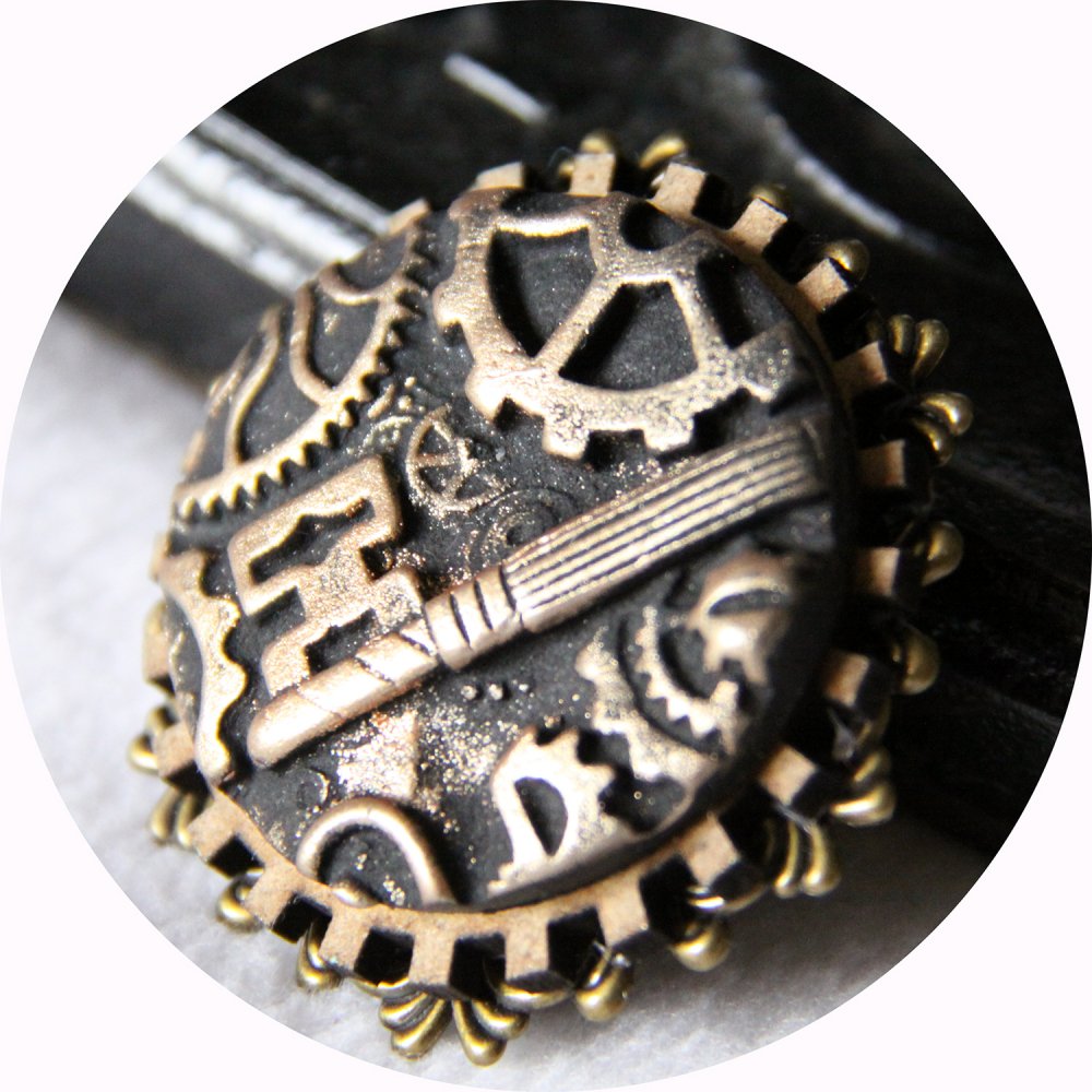 Broche ronde noir, or et bronze thème Steampunk. Pour cette broche j'ai réalisé un cabochon en argile polymère noire avec des motifs engrenages et clé en relief mis en valeur par de la poudre de mica dorée. J'ai fixé ce cabochon sur une estampe engrenage en bois montée avec une attache broche au dos. Dimensions de la broche : 5cm de diamètre