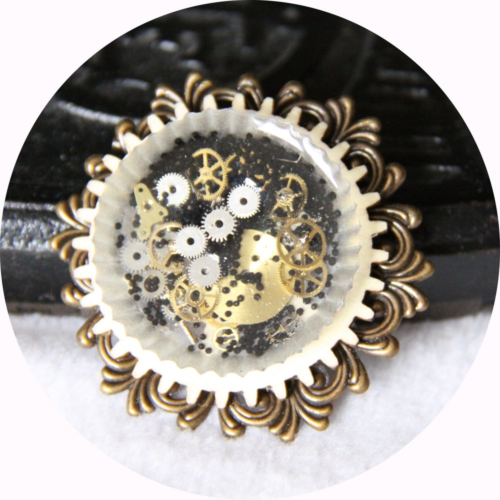 Pour cette broche j'ai réalisé un cabochon en résine dans laquelle j'ai incrusté des engrenages de montre dorés et argentés et des microbilles noires.