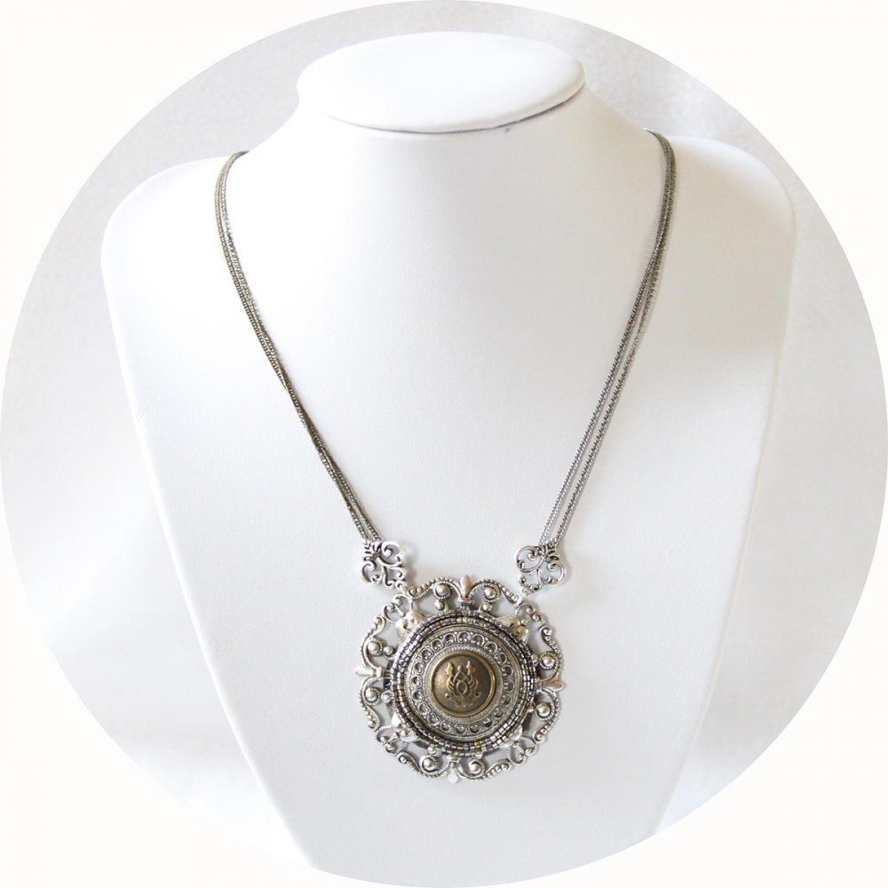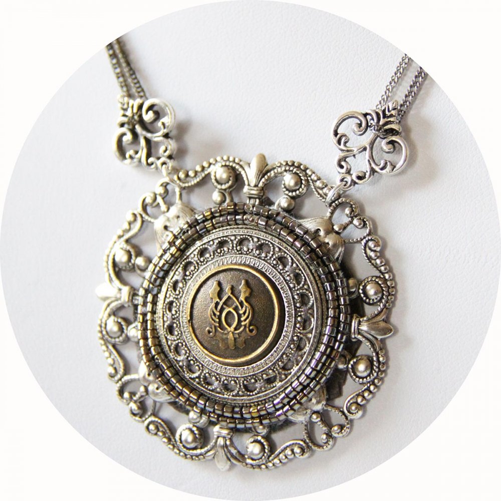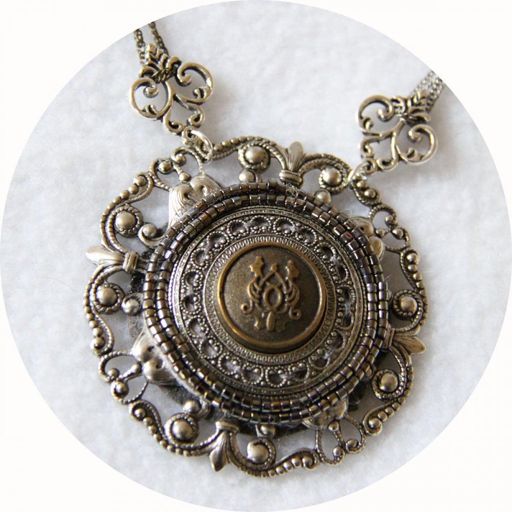Collier Esprit Antique avec un médaillon brodé de perles monté sur une estampe en métal argent ancien et fines chaines argent et bronze