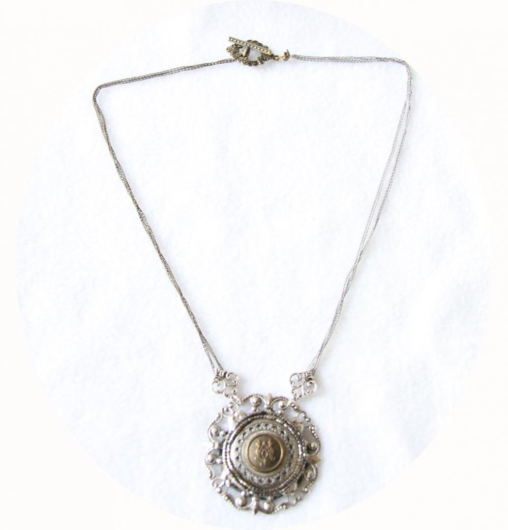 Pour ce collier inspiré par les bijoux antiques (Rome, Byzance, bijoux vikings...) j'ai choisi un bouton coloris bronze que j'ai serti d'une estampe en laiton plaqué en coloris argent antique.