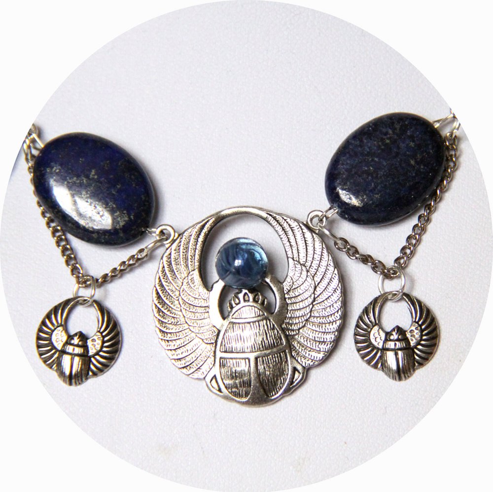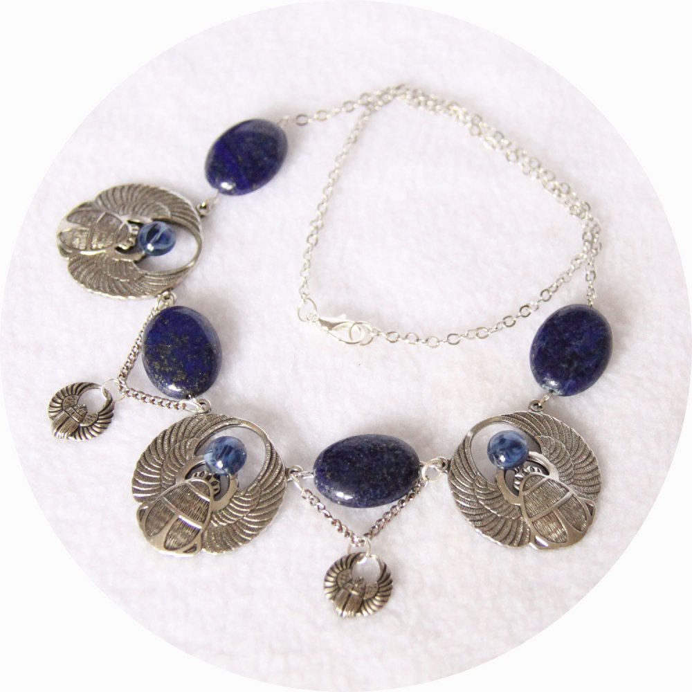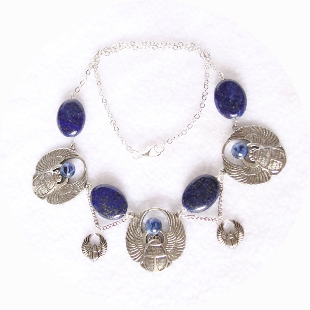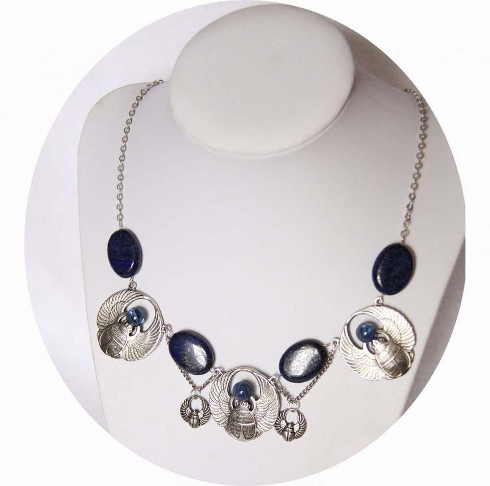 Collier d'inspiration Egyptienne composés d'estampes scarabée en laiton plaqué coloris argent et de perles de lapis lazuli bleu.