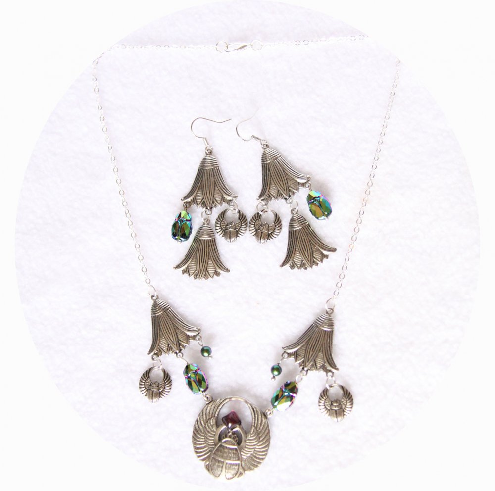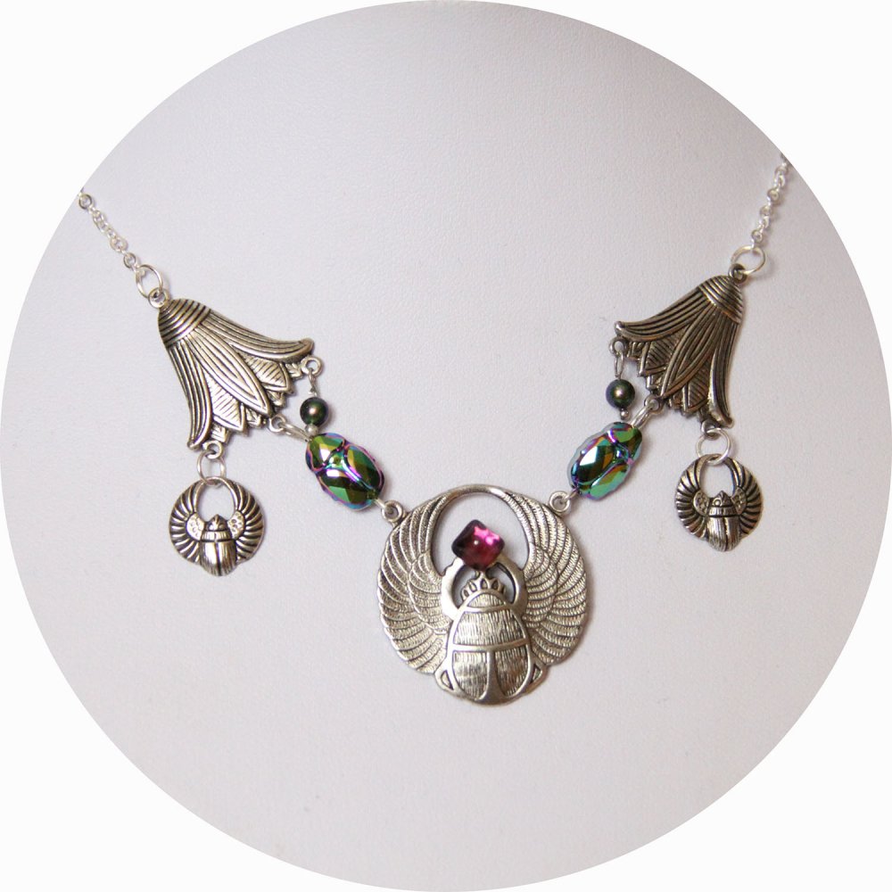 Collier d'inspiration Egyptienne composés d'estampes scarabée et fleur de lotus en laiton plaqué coloris argent et de perles de cristal Swarovski..