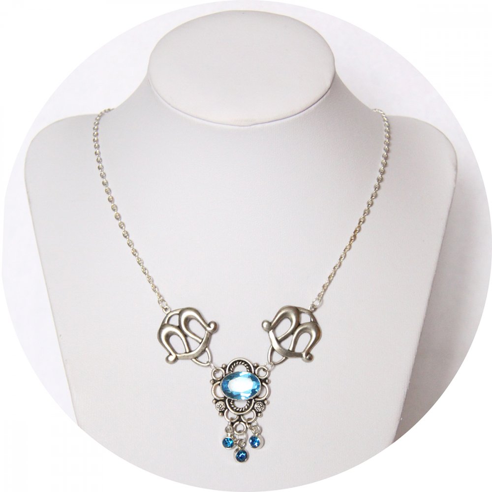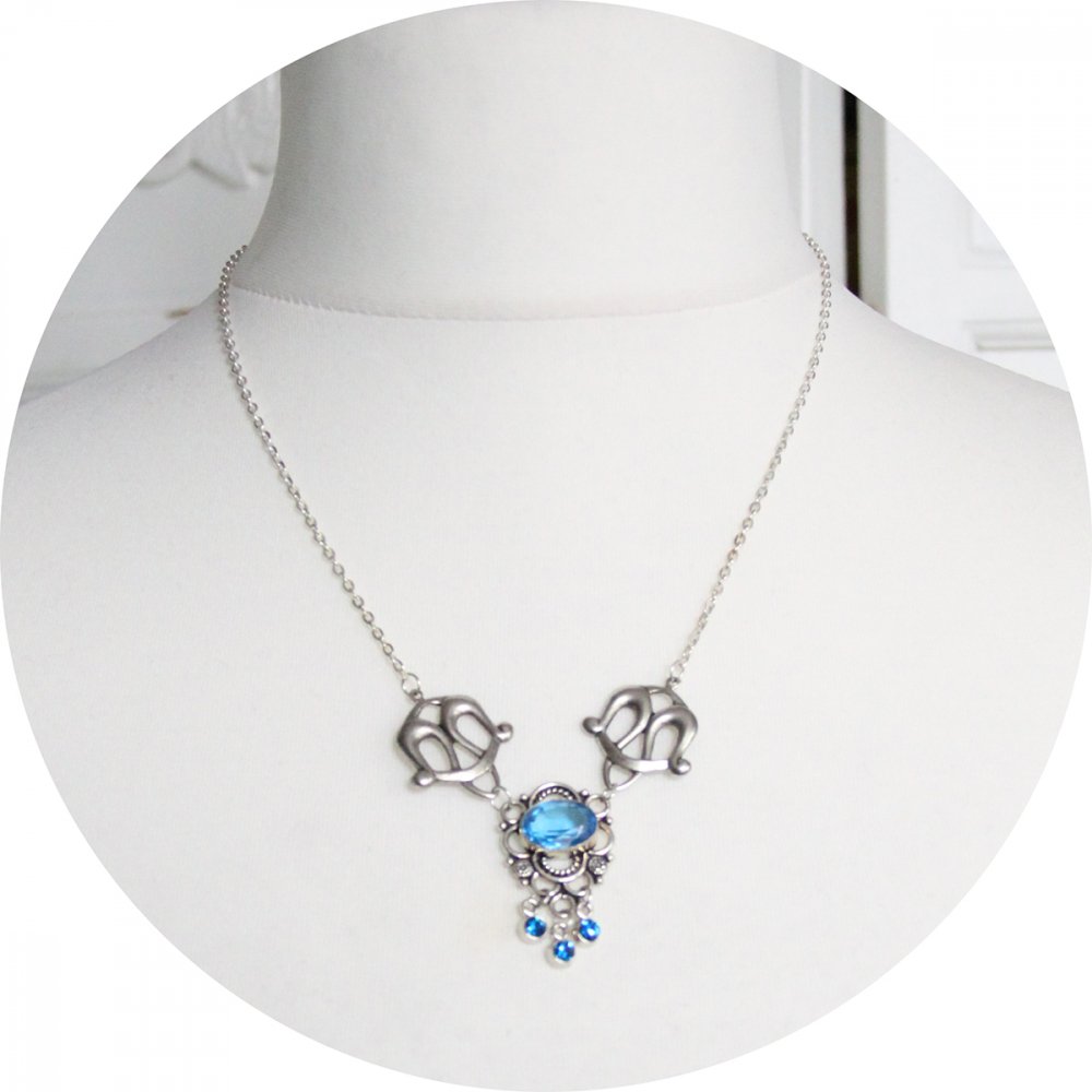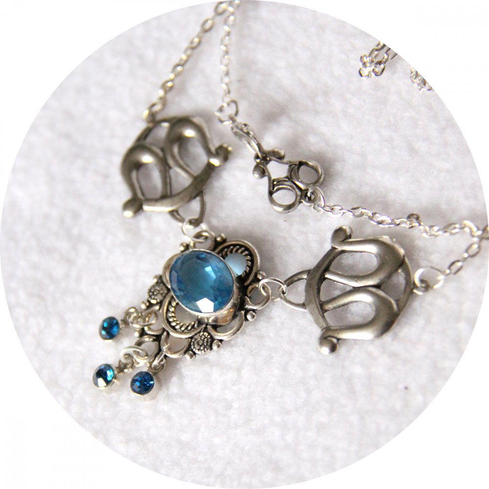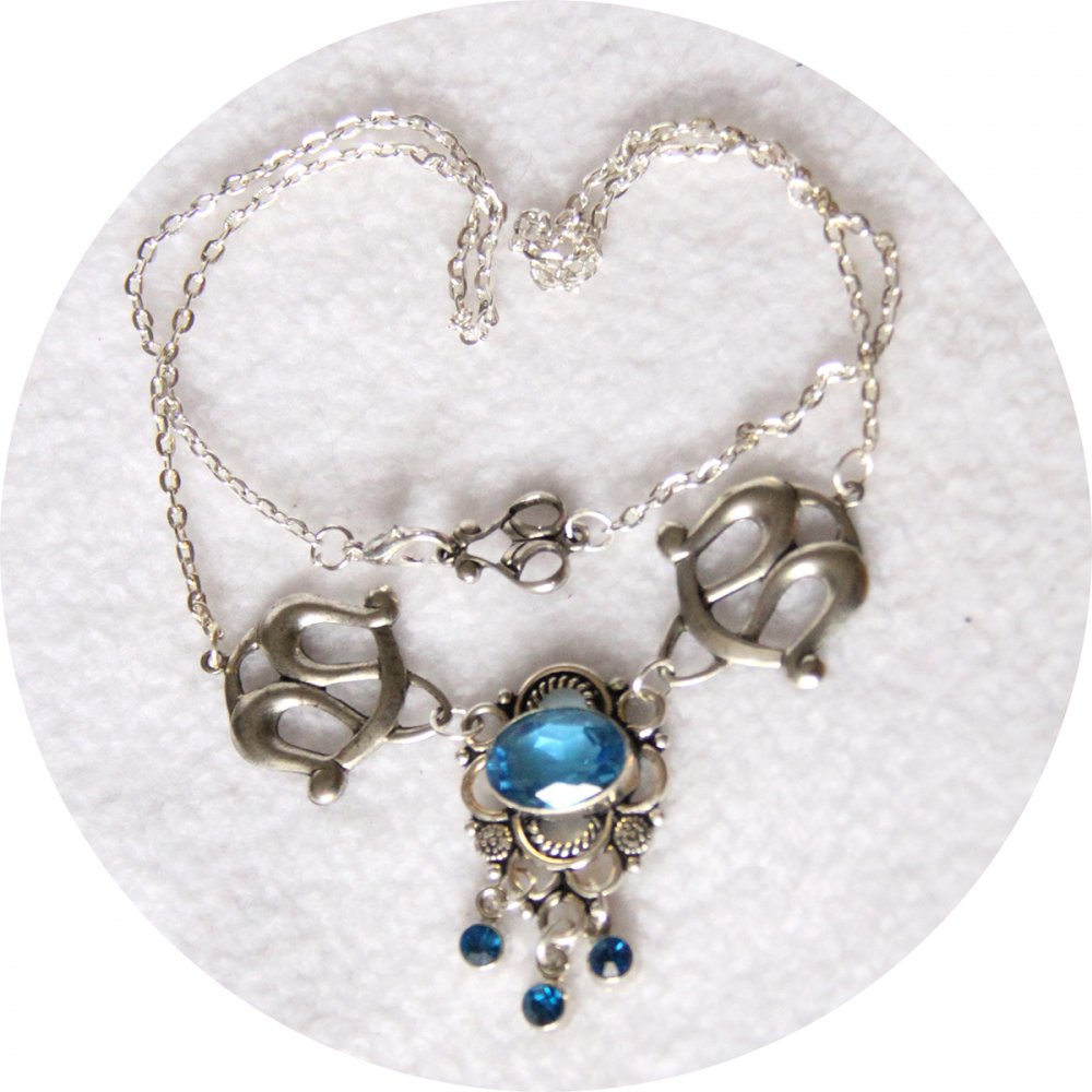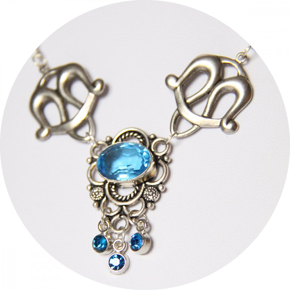 Collier arabesque argent antique et cabochon en cristal bleu.