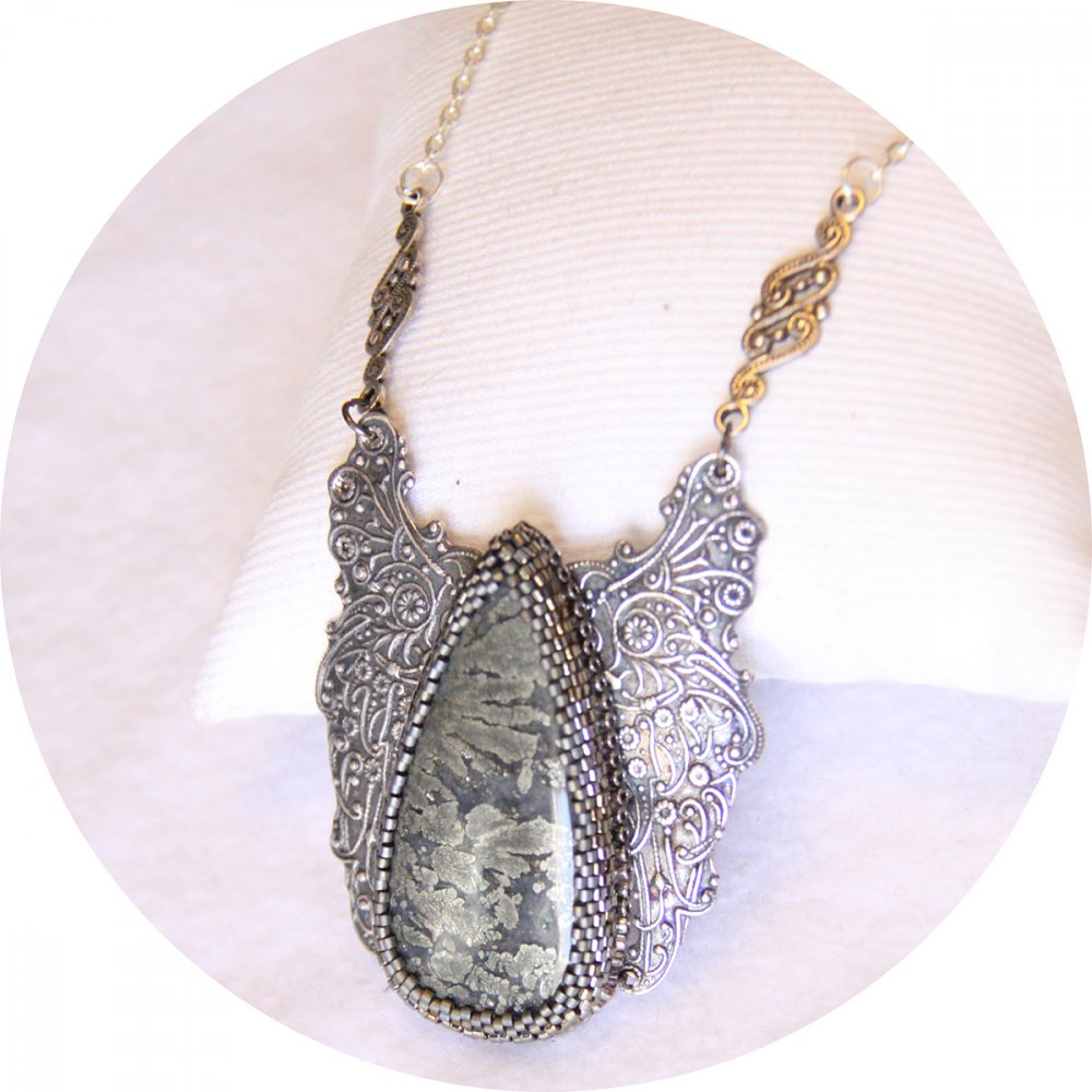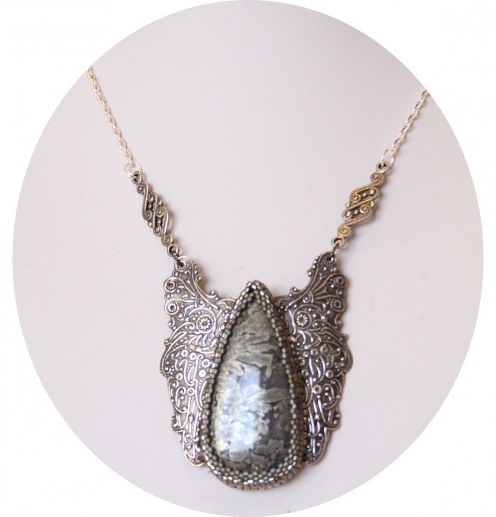 Pour ce collier je suis partie d'un cabochon goutte en marcassite, que j'ai serti avec un tissage de perles miyuki, sur une pièce de suédine grise.