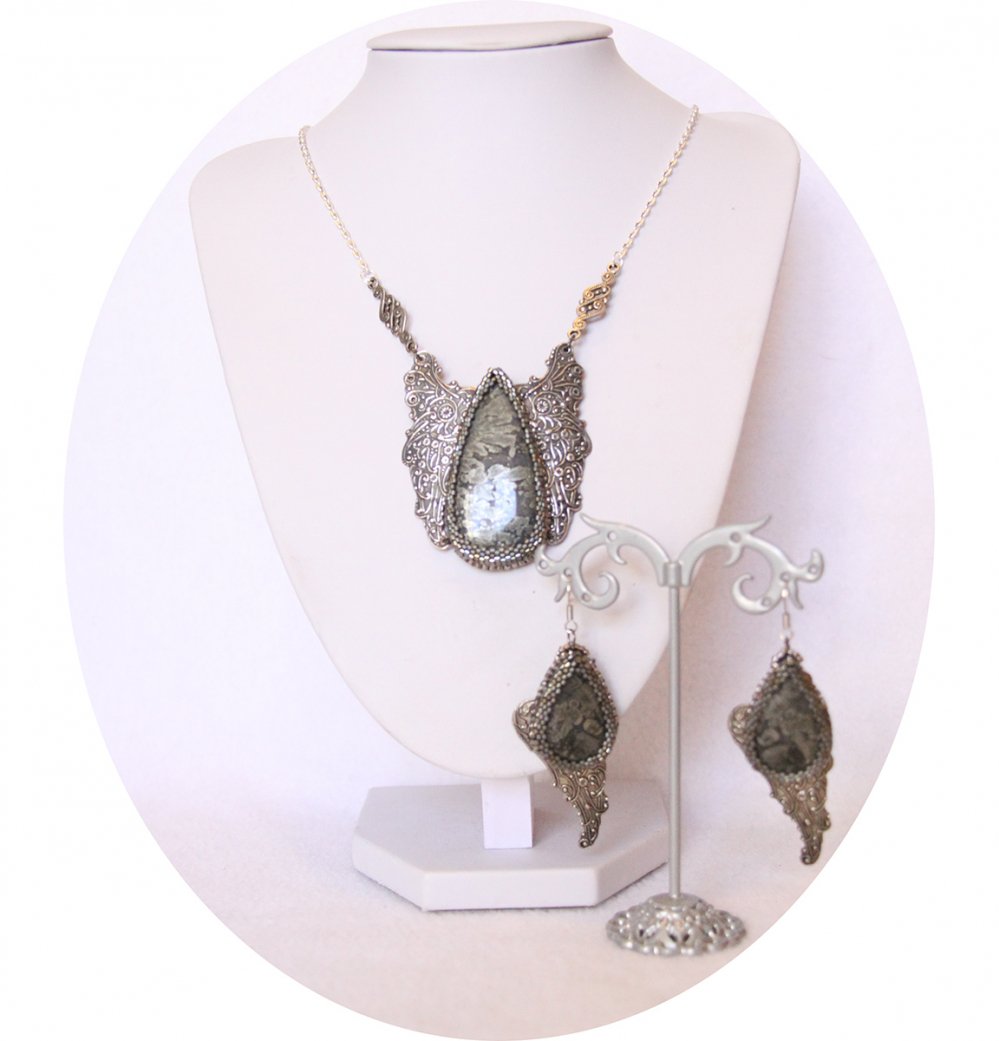 Collier goutte de marcassite dans les tons argent et gris anthracite.