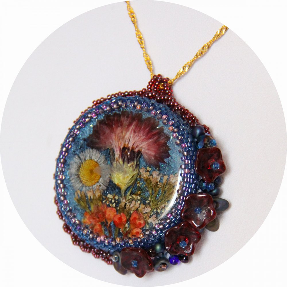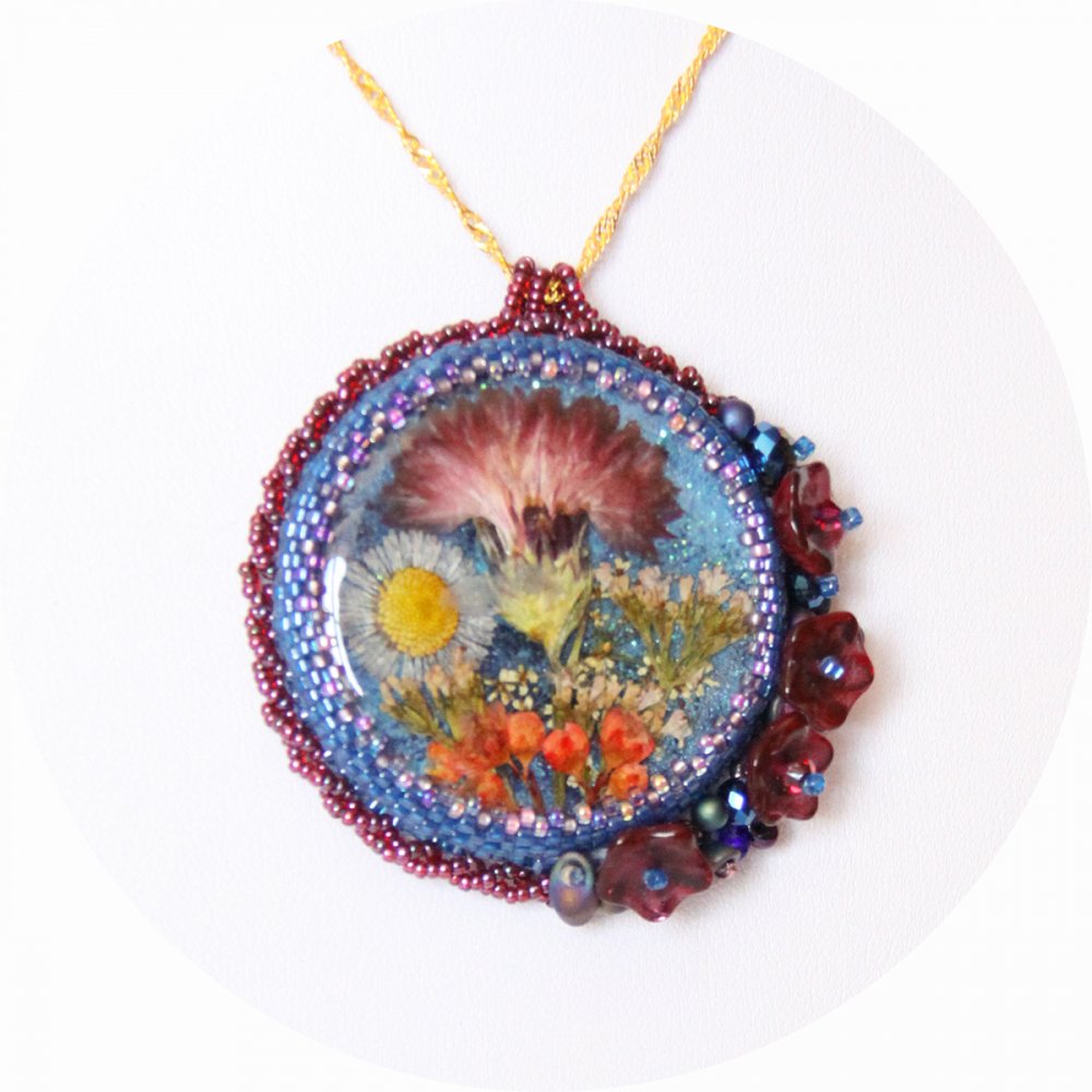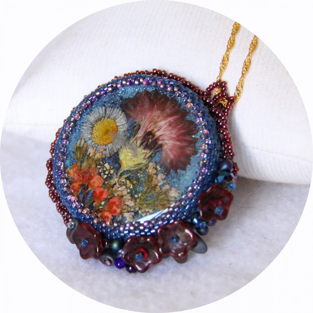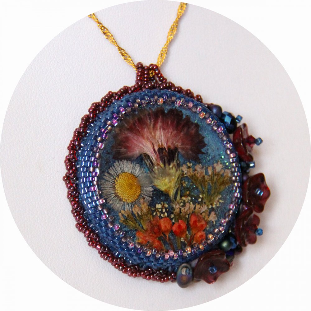 Collier médaillon fleurs séchées brodé de perles miyuki et perles fleurs en verre Tchèque.