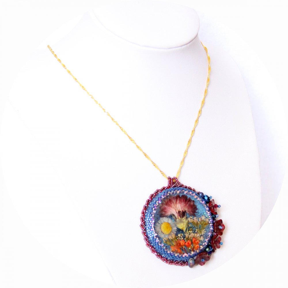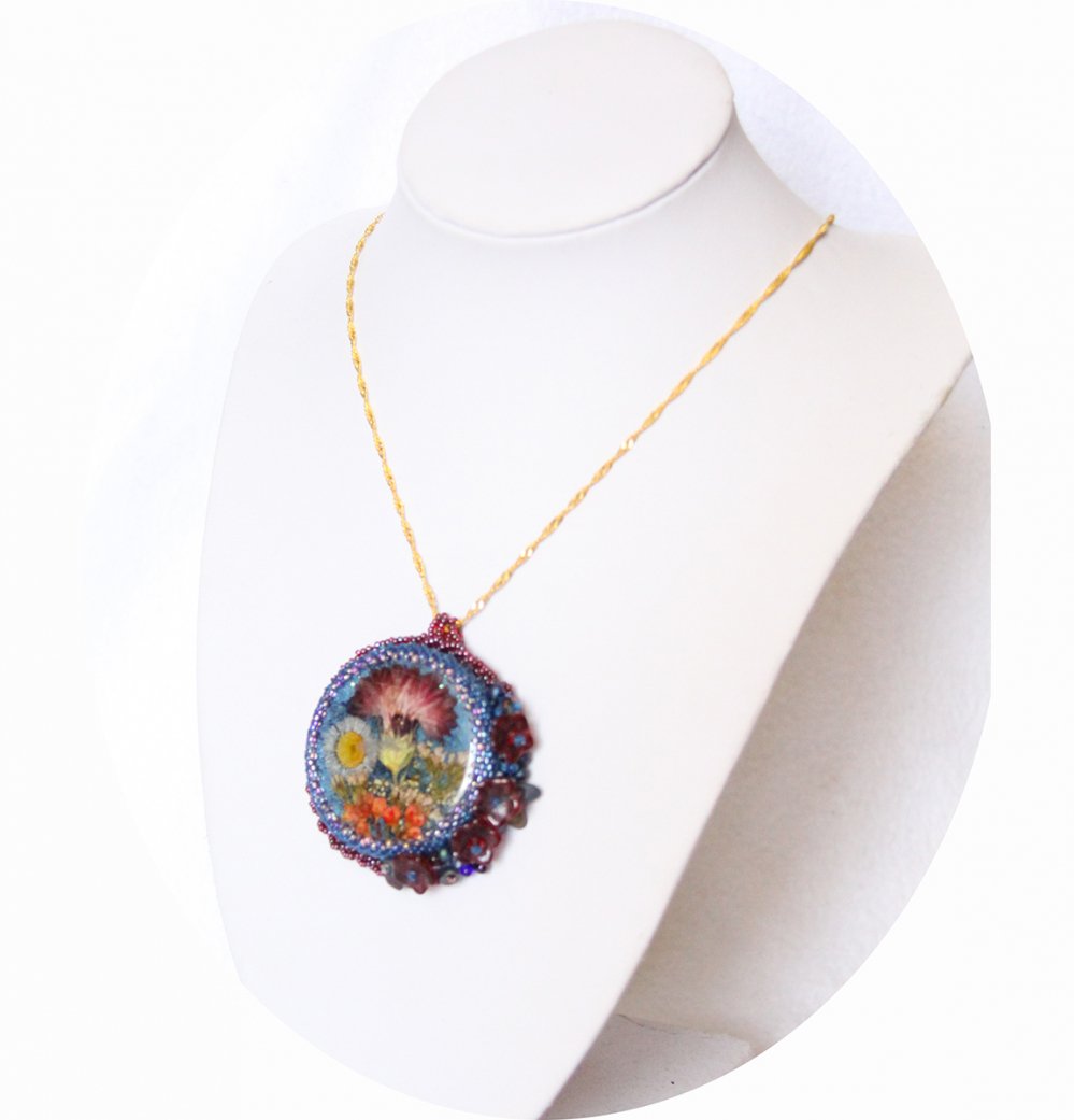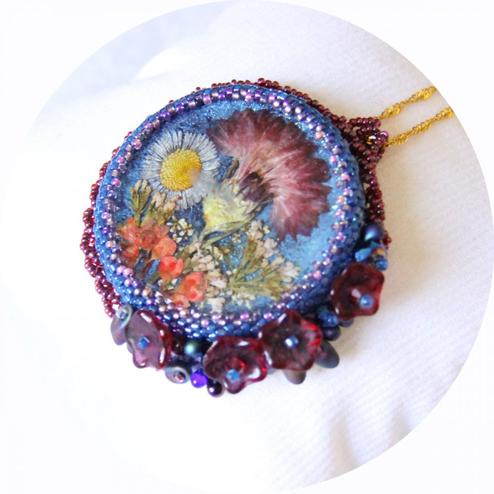 Collier médaillon fleurs séchées brodé de perles miyuki et perles fleurs en verre Tchèque.