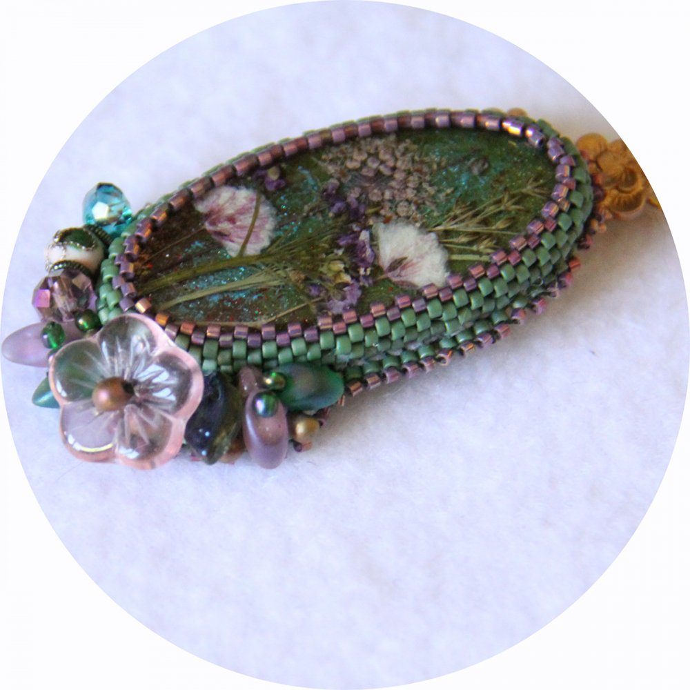 Pour ce collier je suis partie d'un cabochon vert et rose de fleurs séchées en résine artisanal, que j'ai serti avec un tissage de perles miyuki vert émeraude.