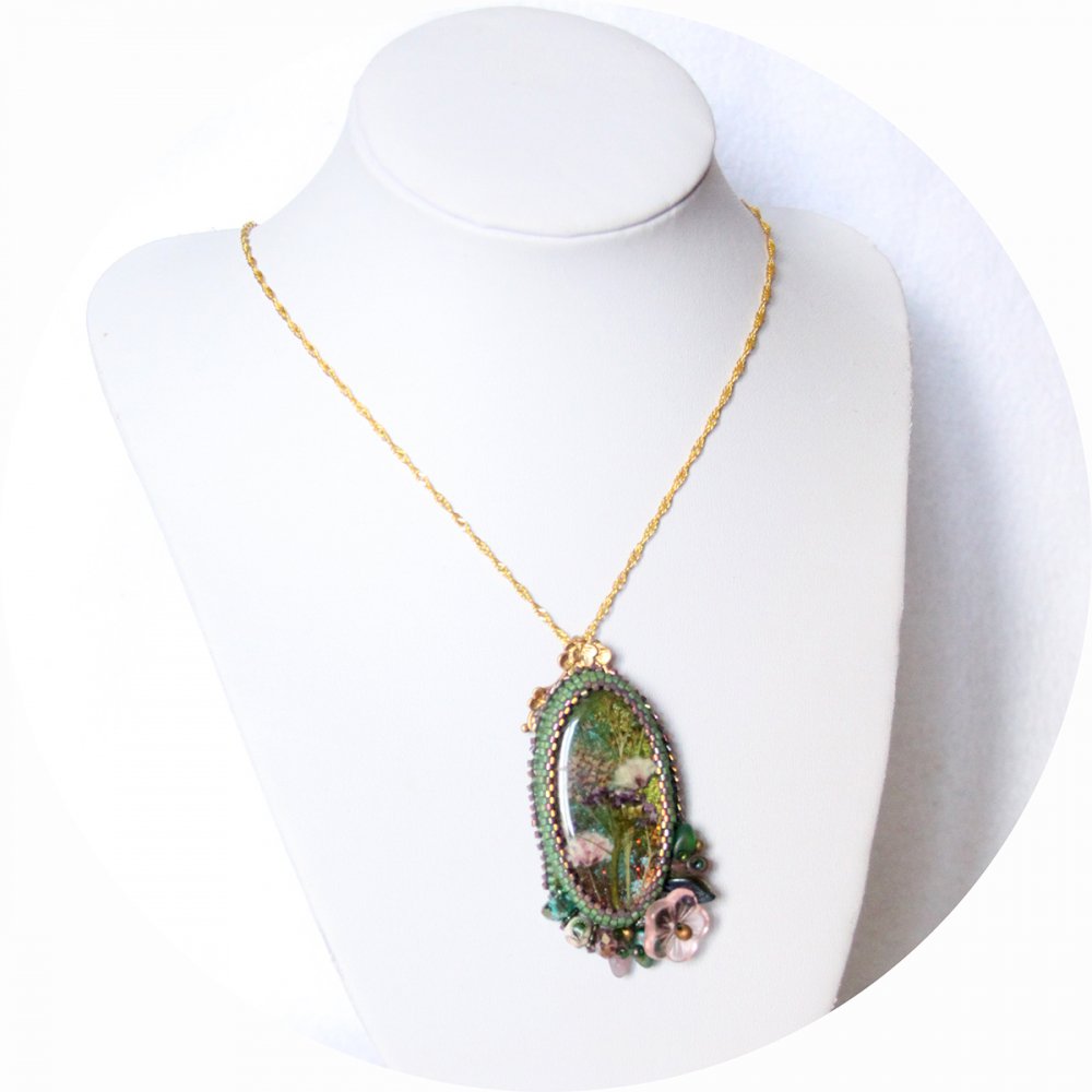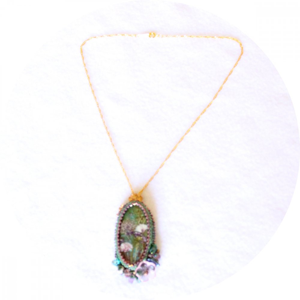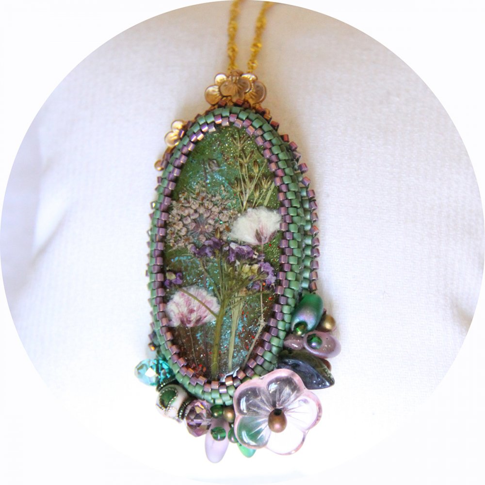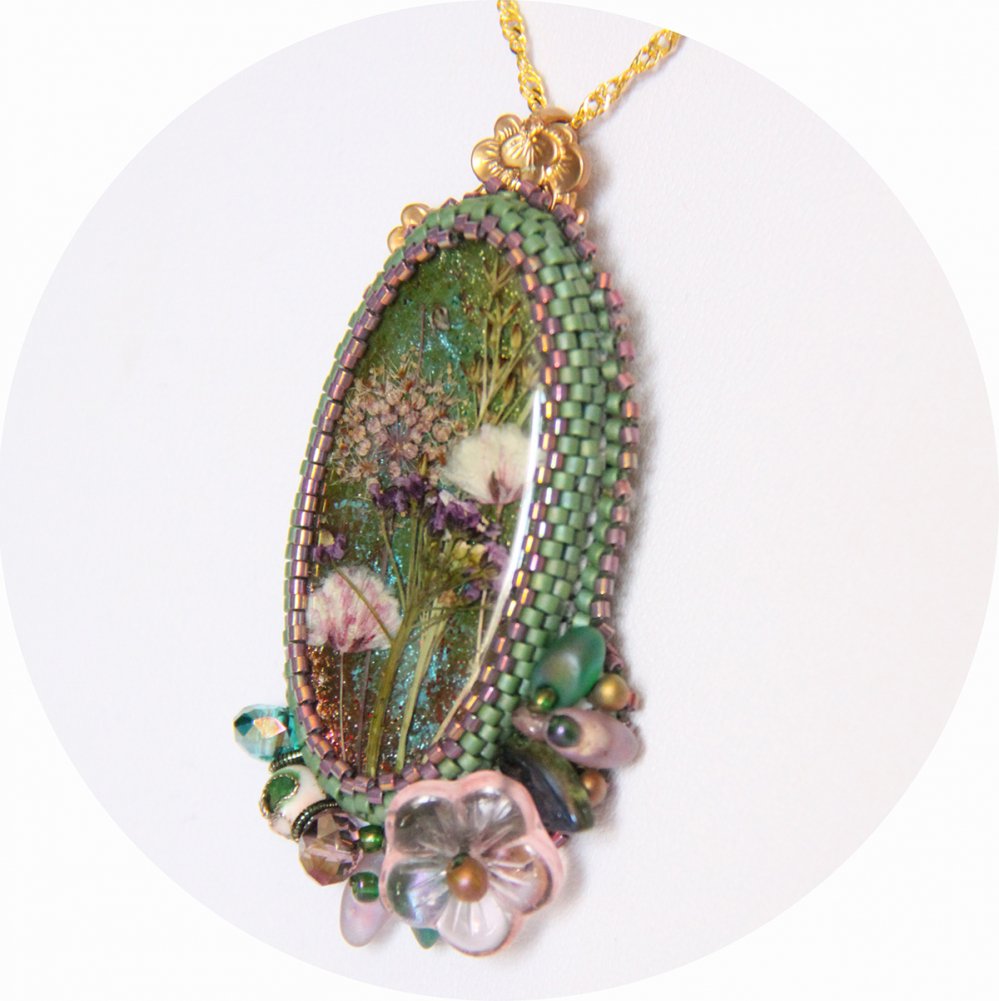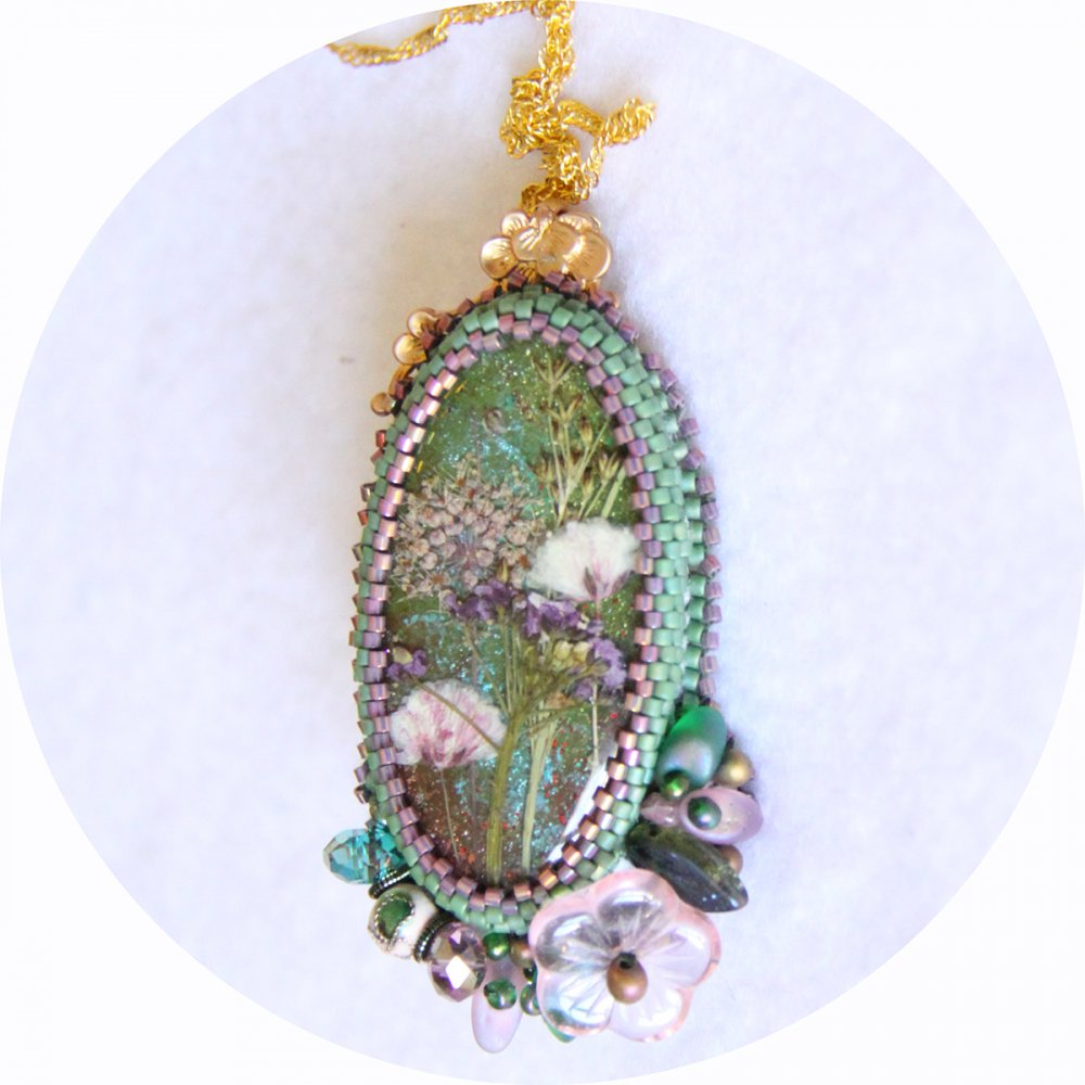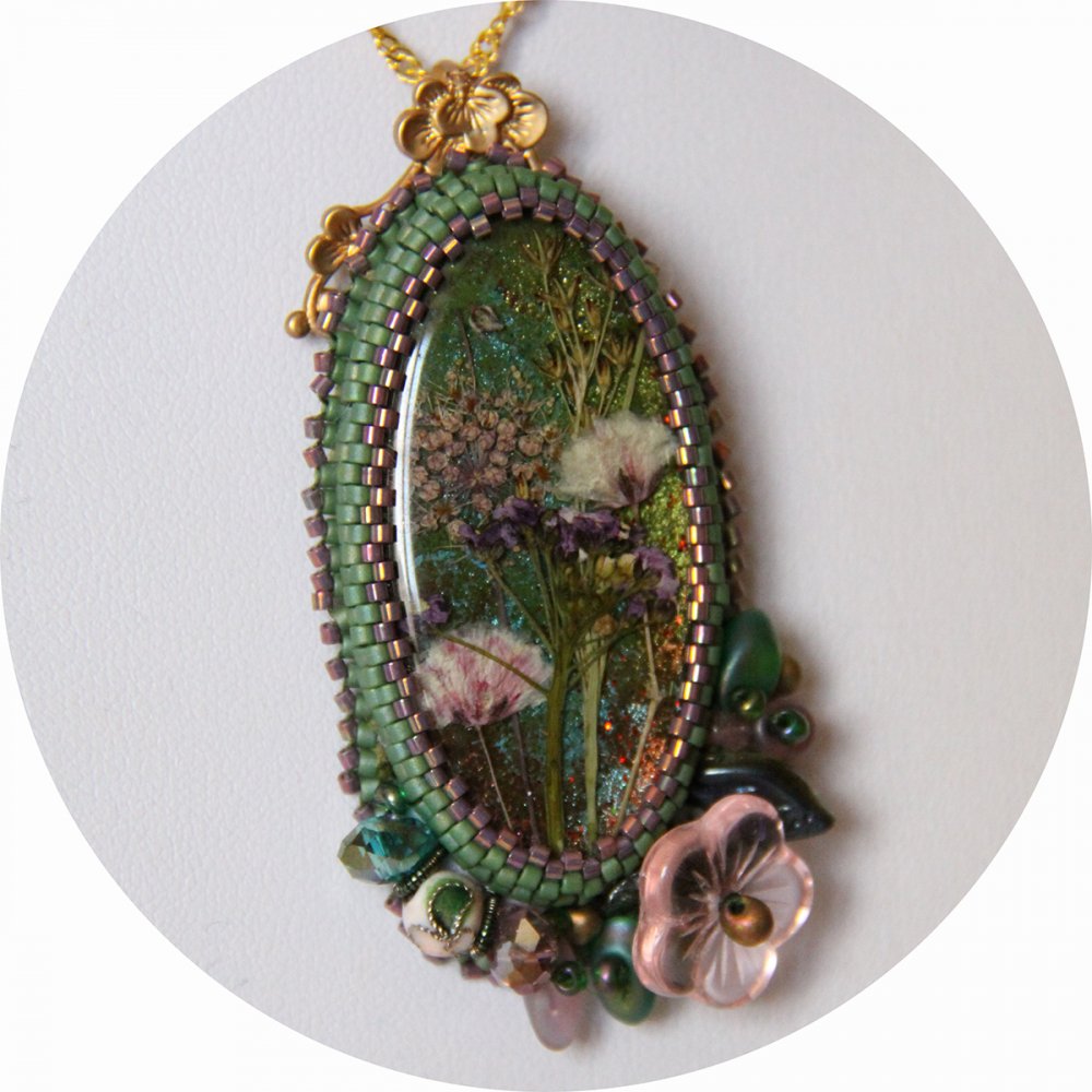 Collier médaillon vert et rose fleurs séchées brodé de perles miyuki et de perles fleur en verre Tchèque