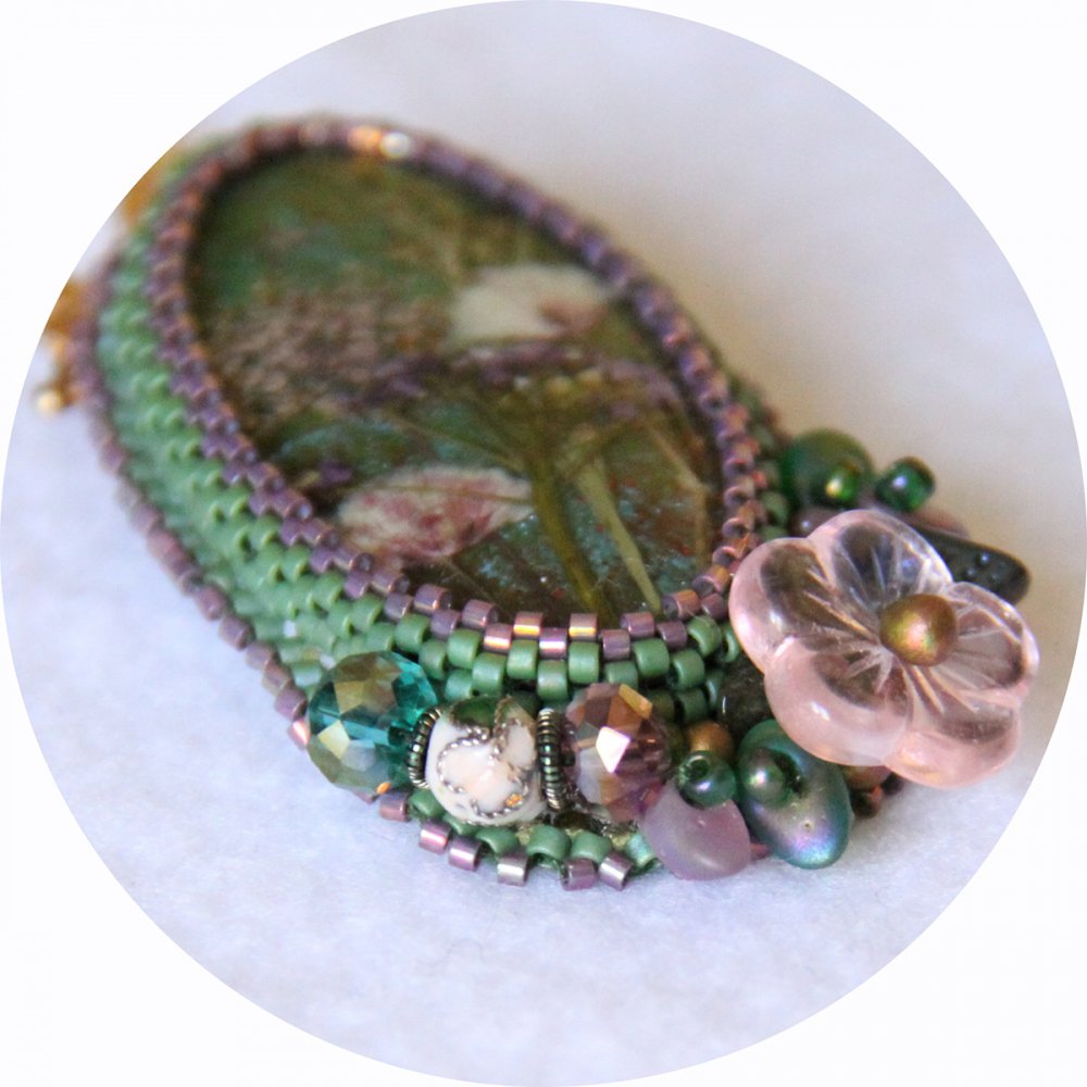 J'y ai ajouté un contour de perles japonaises, de perles fleurs en verre Tchèque, de cristal et de petites perles cloisonnées.