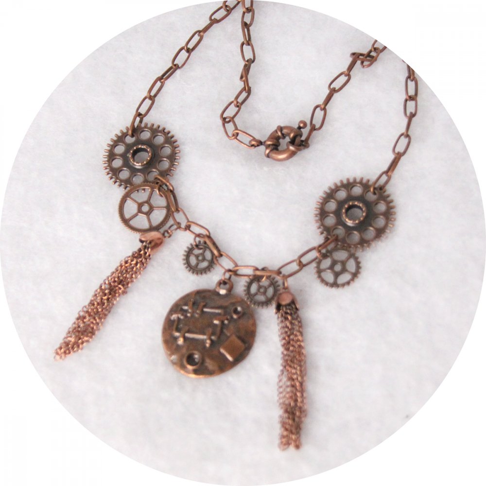 Collier long avec un médaillon central rond en métal cuivré, effet martelé. Le médaillon cuivre est monté sur une chaine à large maillons assortie, et entouré de pompons et engrenage en métal cuivré.