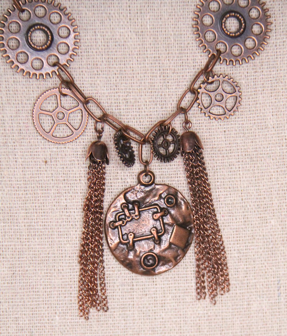 Collier Steampunk sautoir avec engrenages et médaillon cuivre.