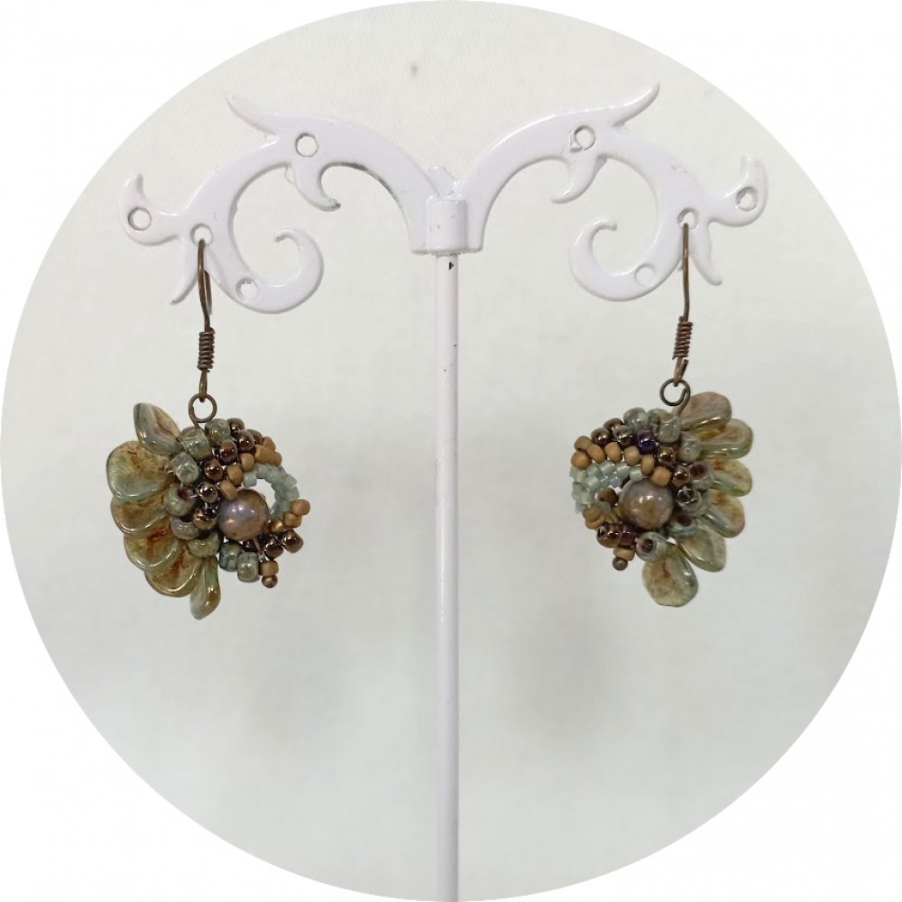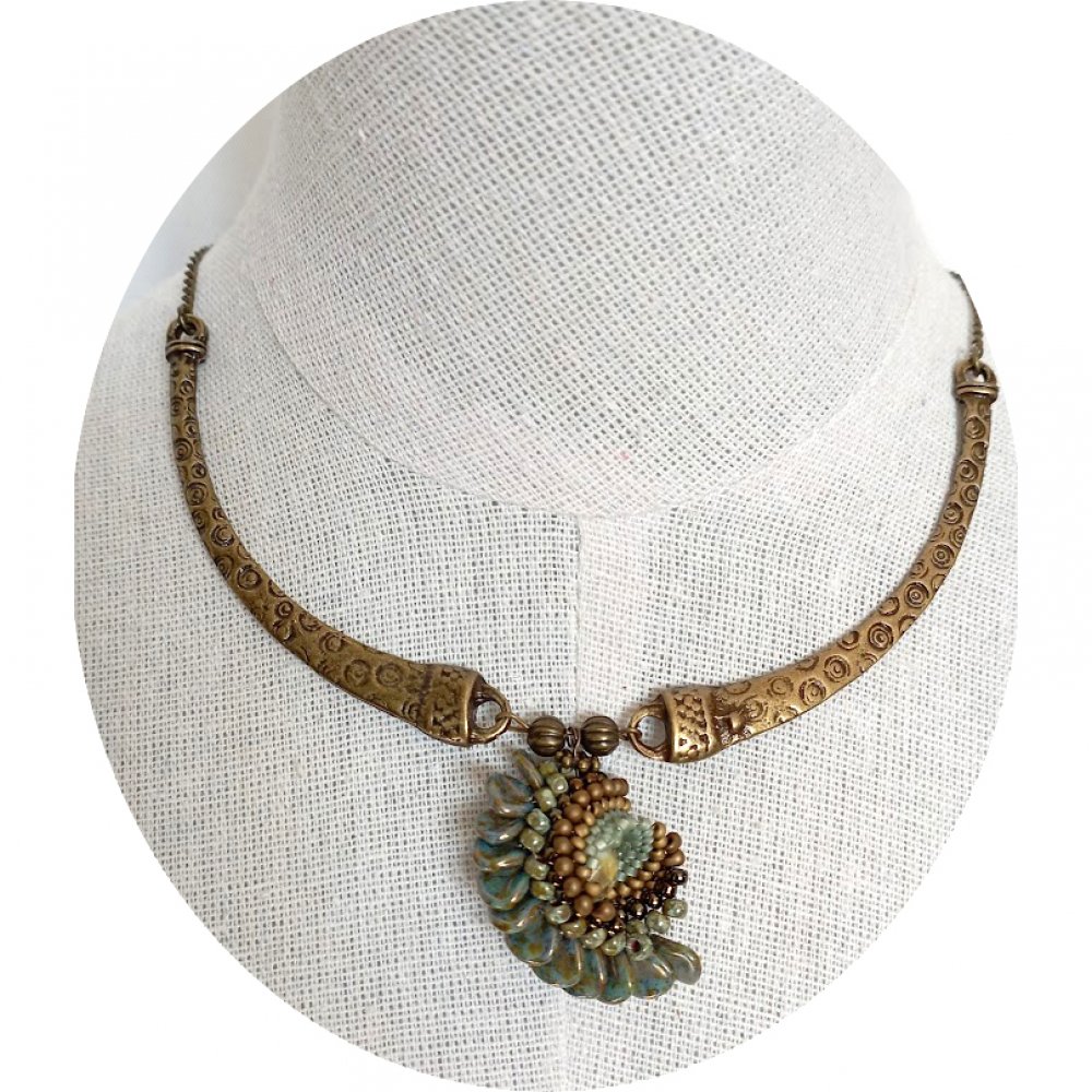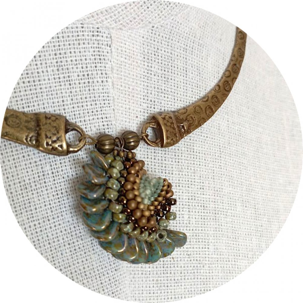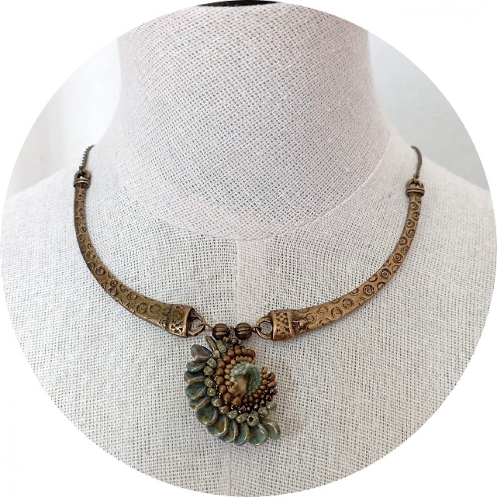 Ces collier ovales en coloris vert et bronze est composée d'une spirale de perles Miyuki de plusieurs tailles, ce qui leur donne cet aspect si original avec une crète de perles pétales plus longues. Je leur trouve un petit coté Steampunk, mais chacun est libre d'y projeter son propre imaginaire!