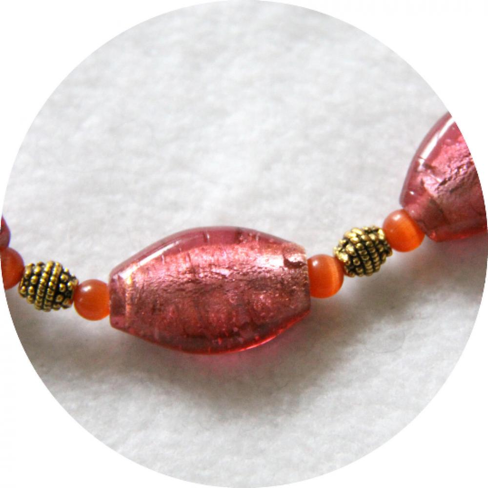 Pour ce collier d'esprit antique j'ai choisi de jolies perles en pâte de verre silver foiled rose/orange, de perles oeil de chat en coloris orange doux et des perles en métal doré, et un médaillon central qui reprend un bouton fleur en céramique sur un support bronze.