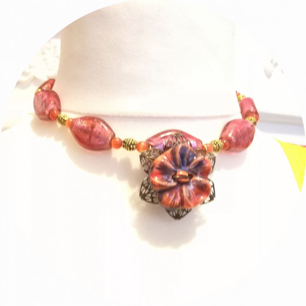 Collier rang de perles rose, orange et doré avec médaillon fleur en céramique