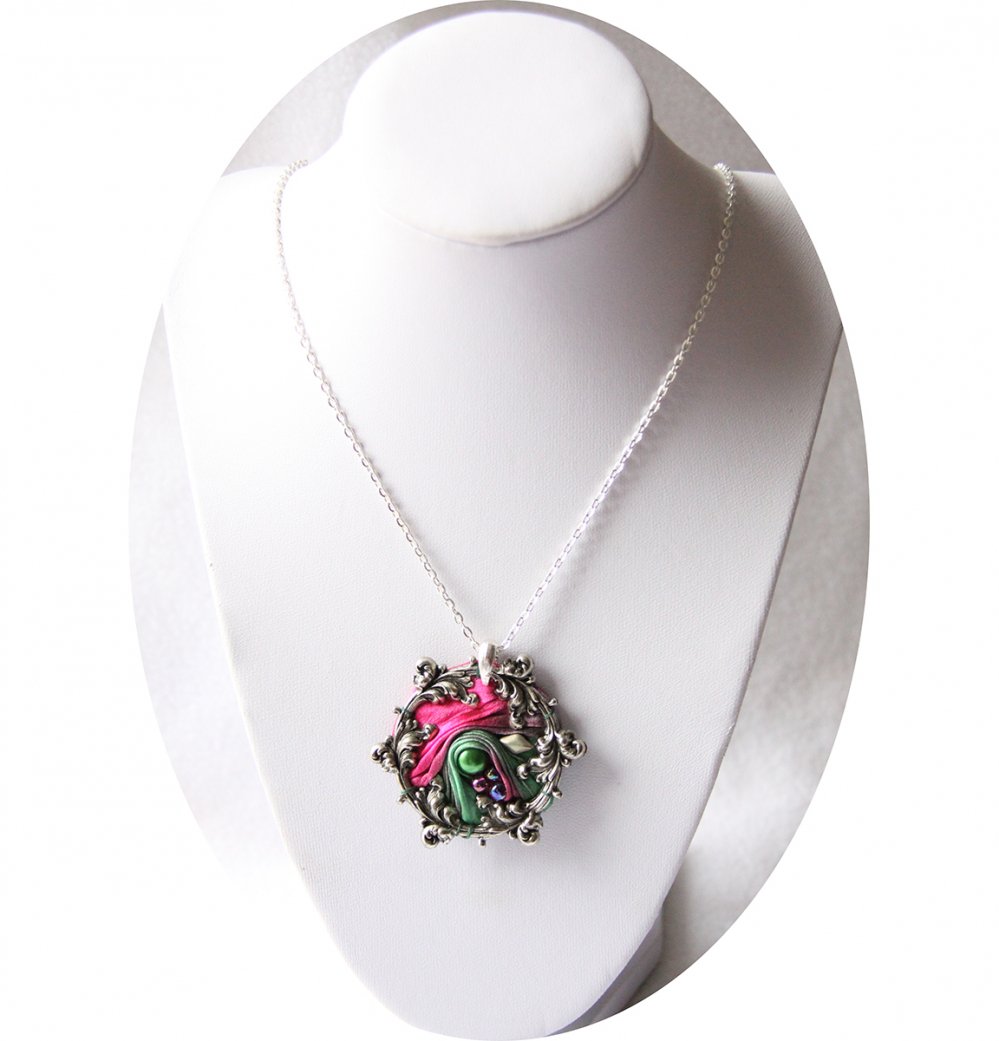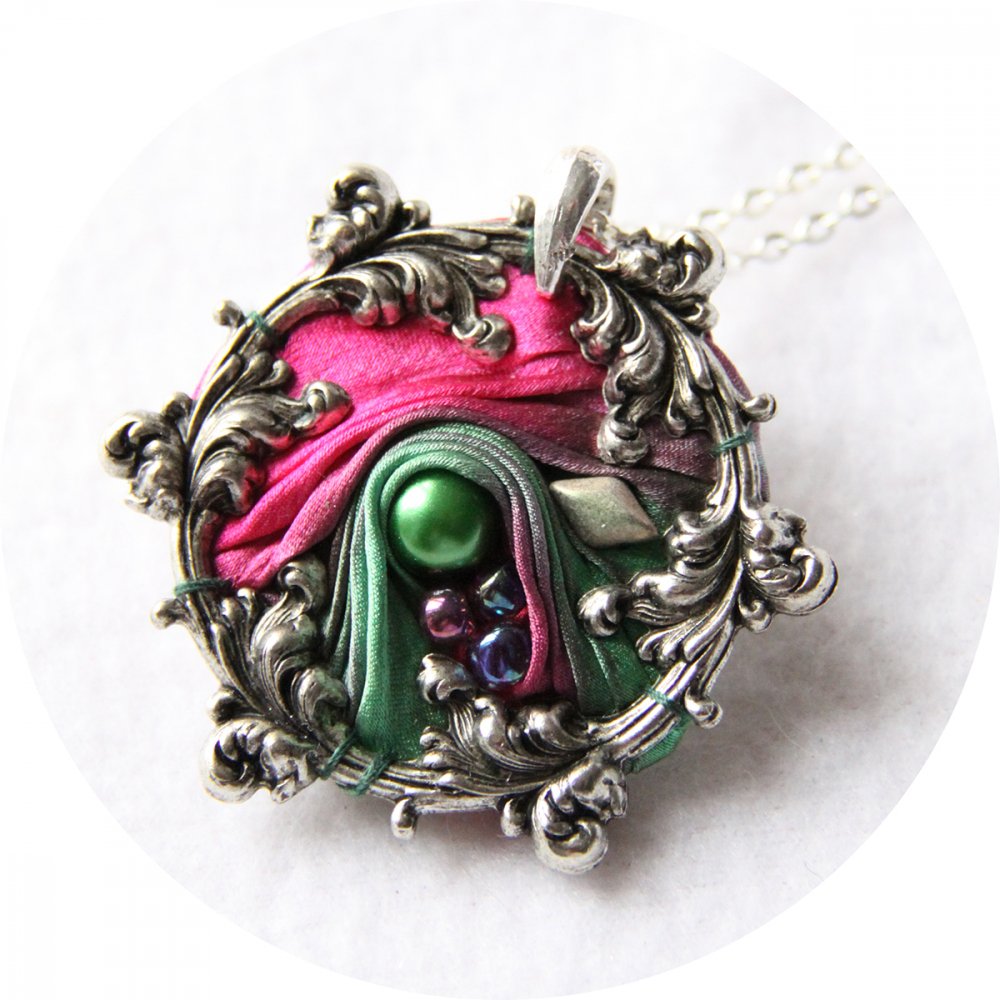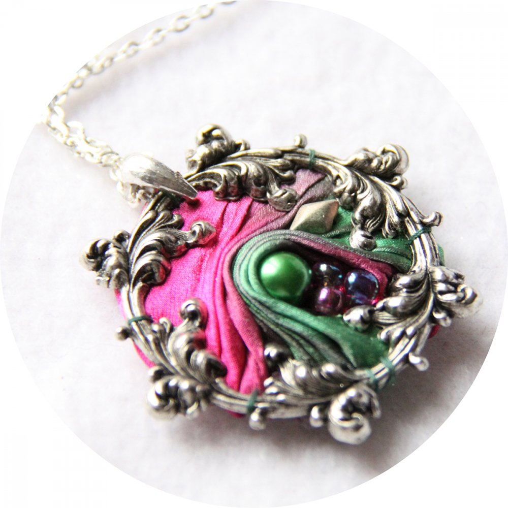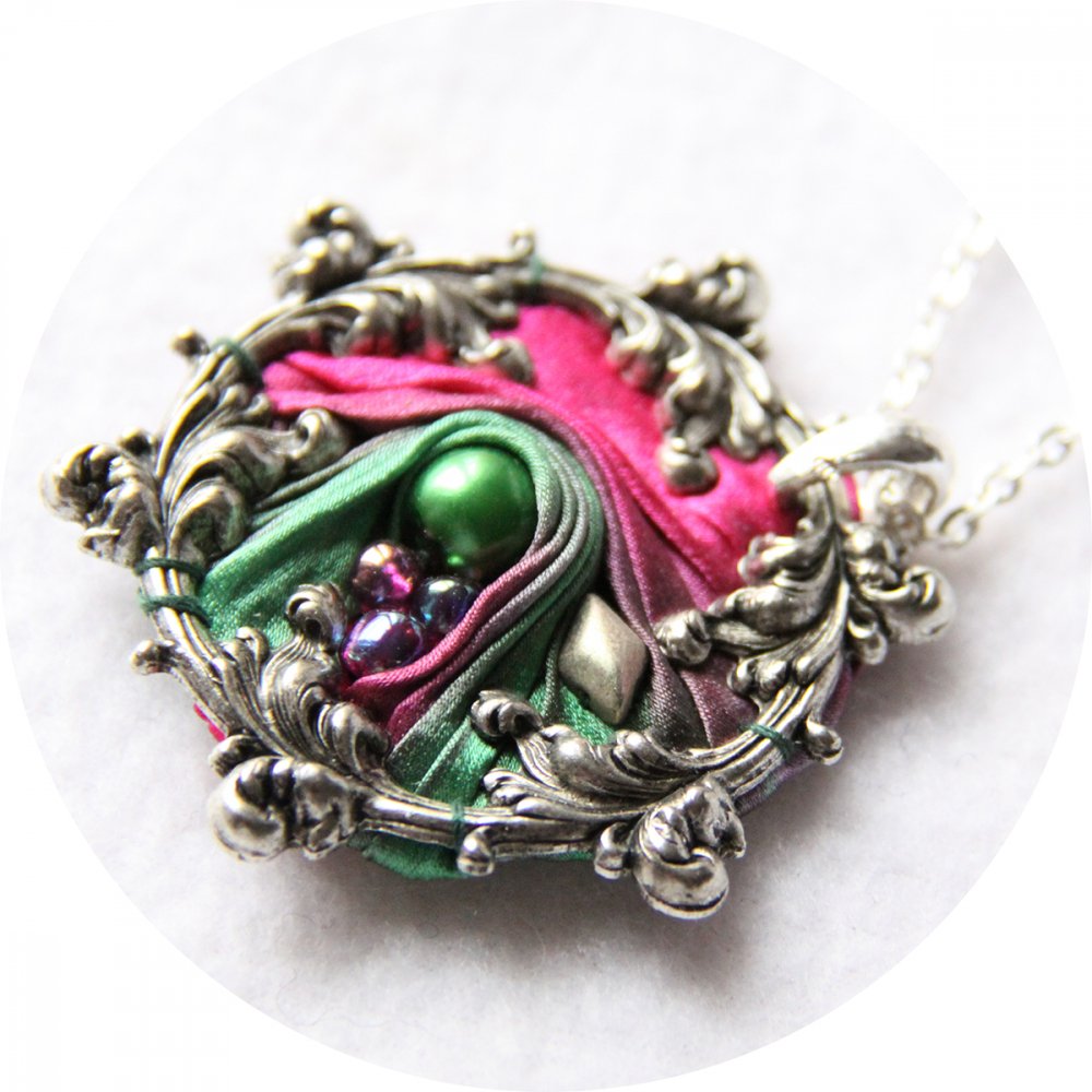 Collier victorien médaillon en ruban de soie shibori rose fuchsia et vert et cadre argenté à volutes arabesques brodé de perles vertes et roses.