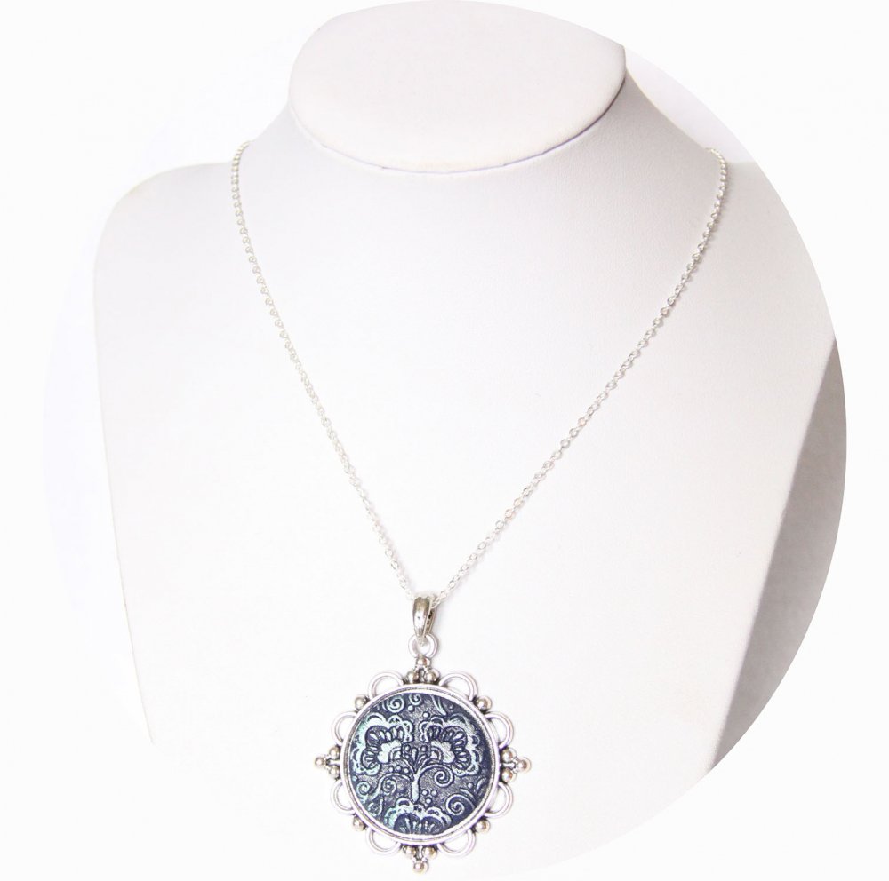 - pour le pendentif, un support argent de 4.5cm de diamètre total sur une chaine argentée de 44cm.