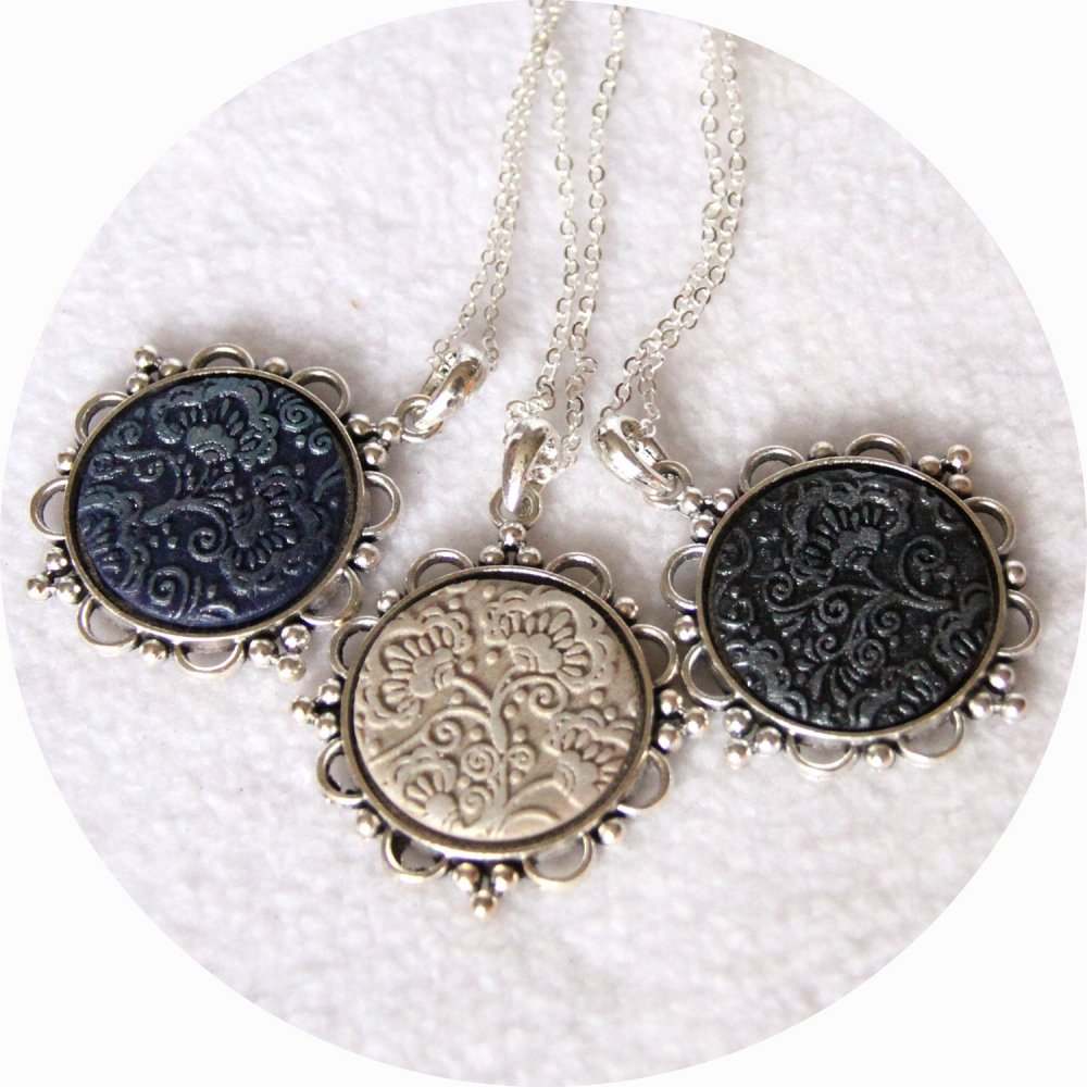 Des cabochons en pâte polymère bleu marine avec des motifs en relief argenté/bleuté réalisés par mes soins sont montés sur :