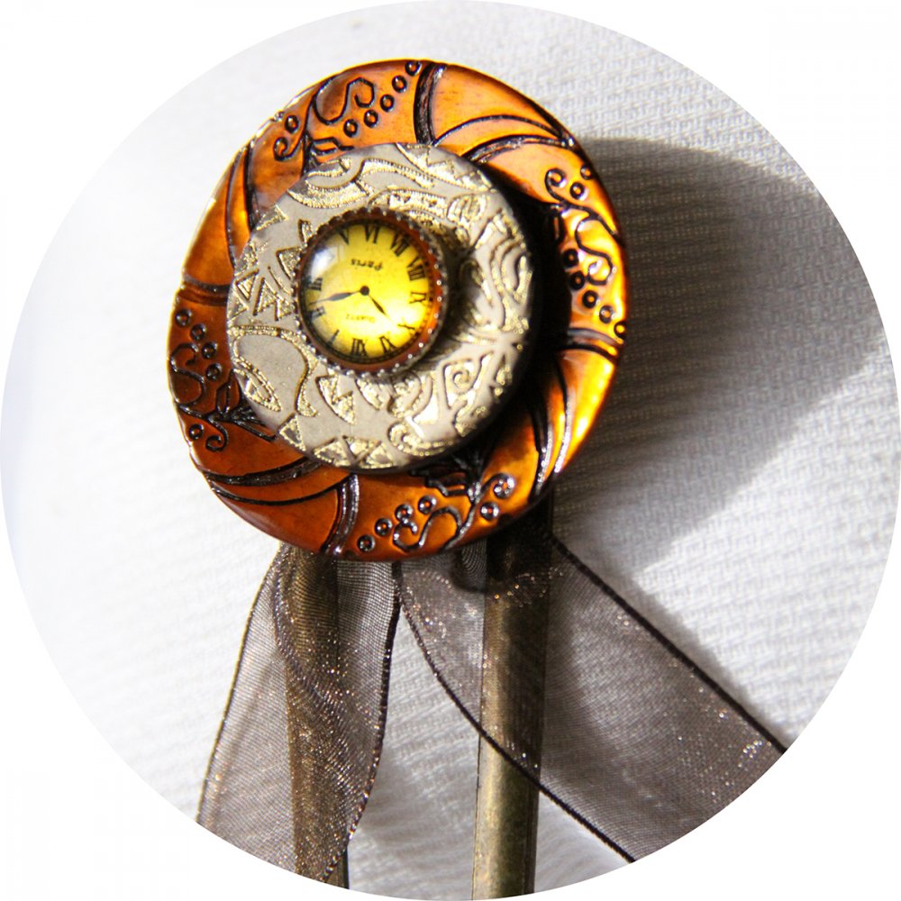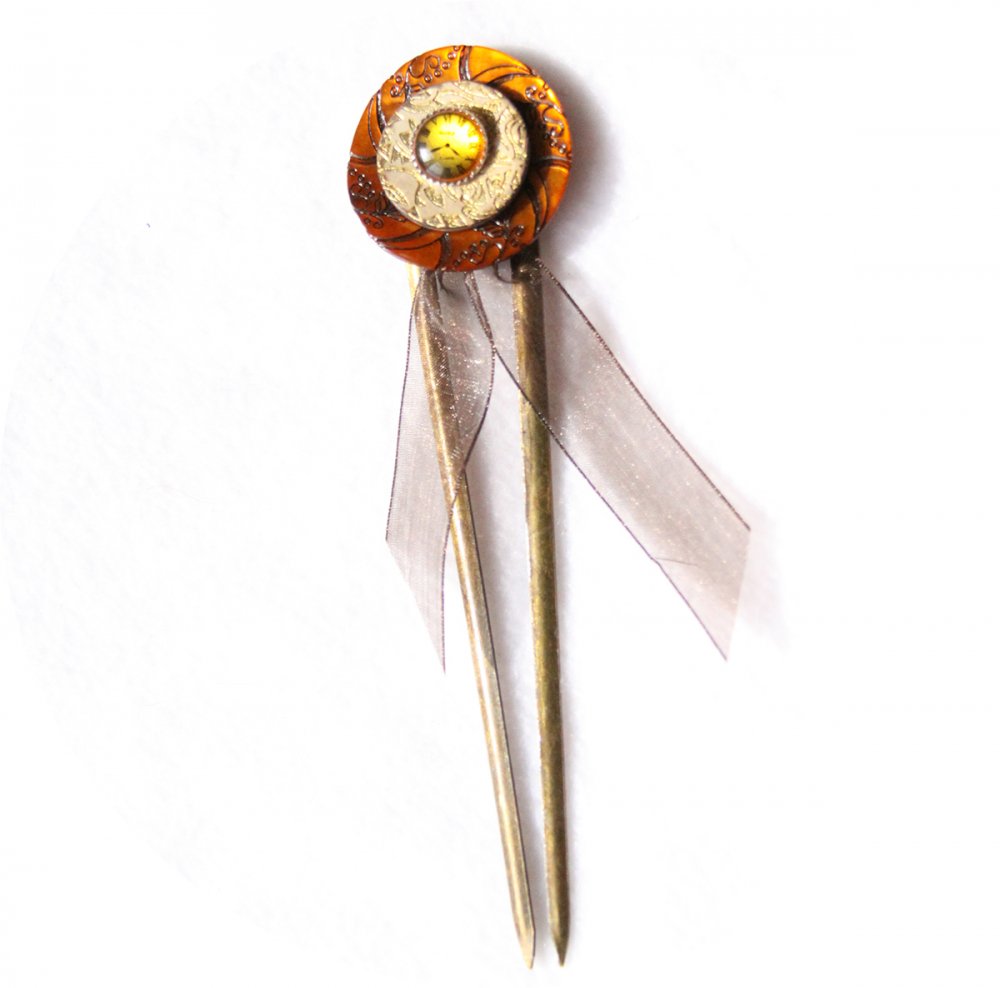 Pic à cheveux ou chignon de style steampunk en coloris bronze, orange et ocre.