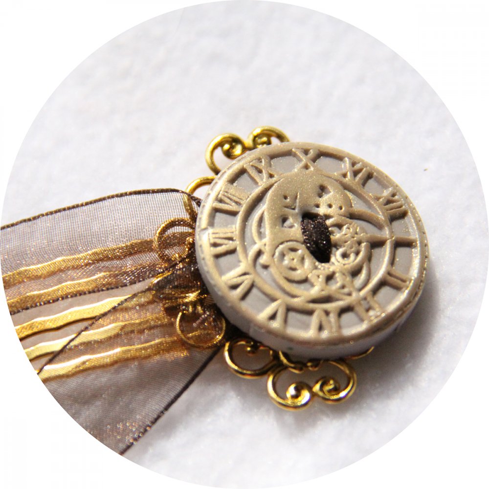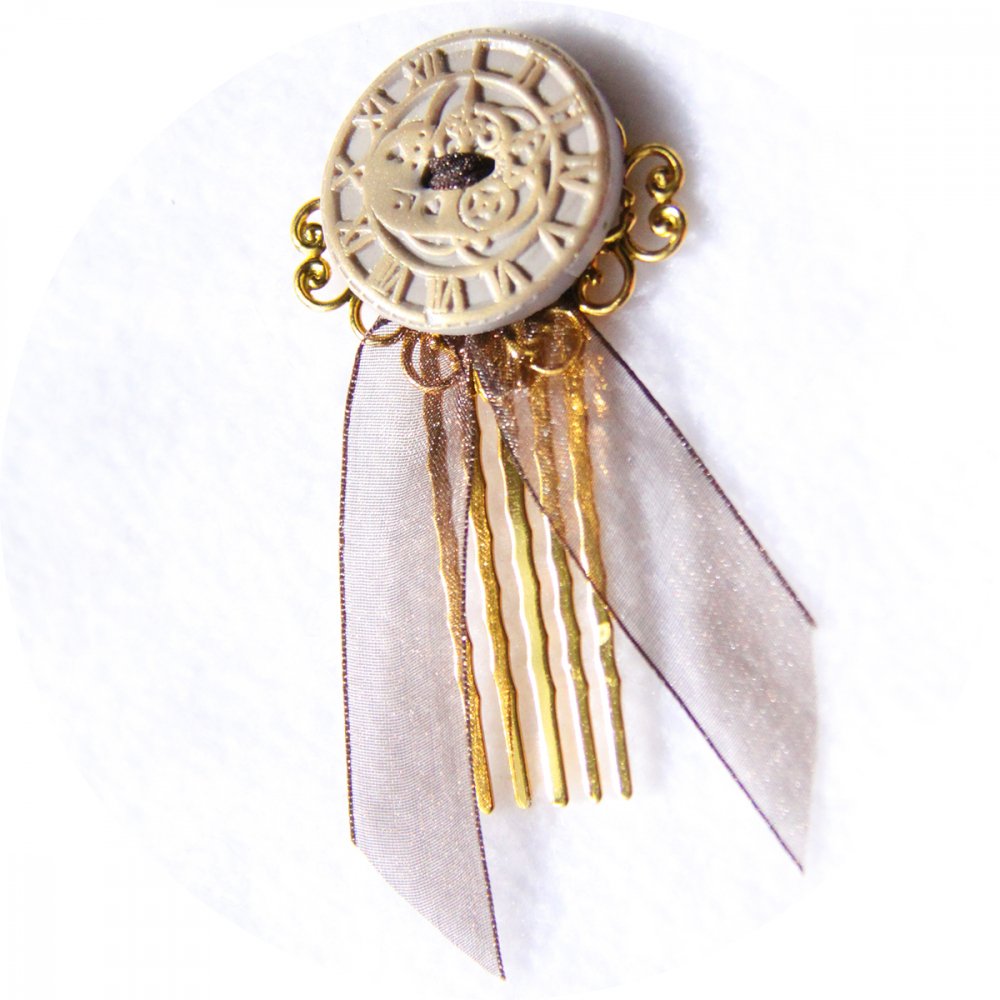 Pour cet accessoire de coiffure Steampunk j'ai choisi un bouton beige clair à motif de mécanisme de montre doré, réalisé par mes soins.