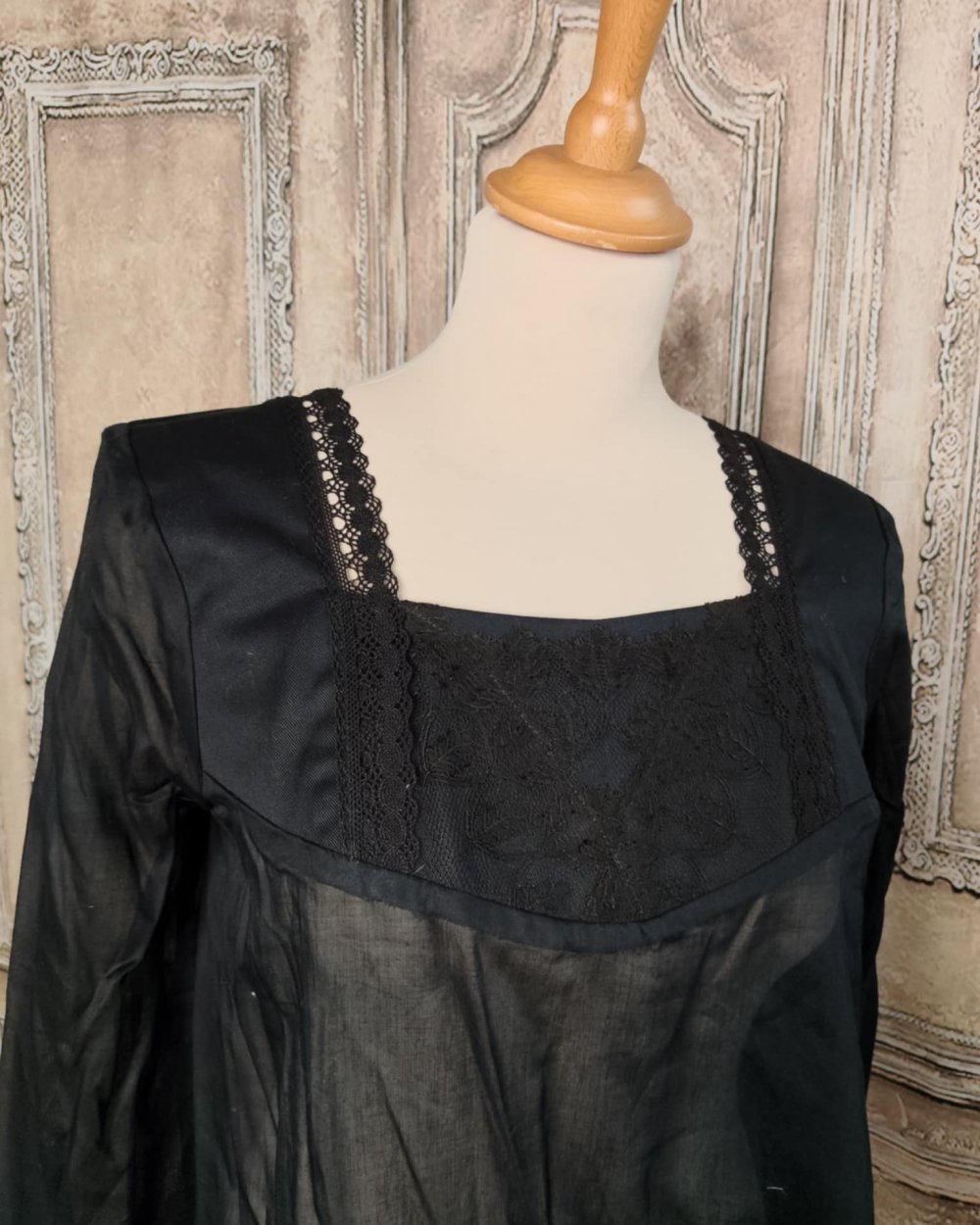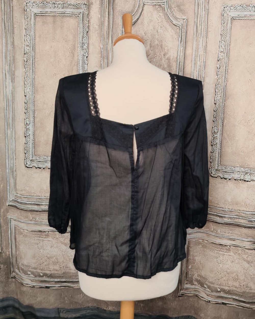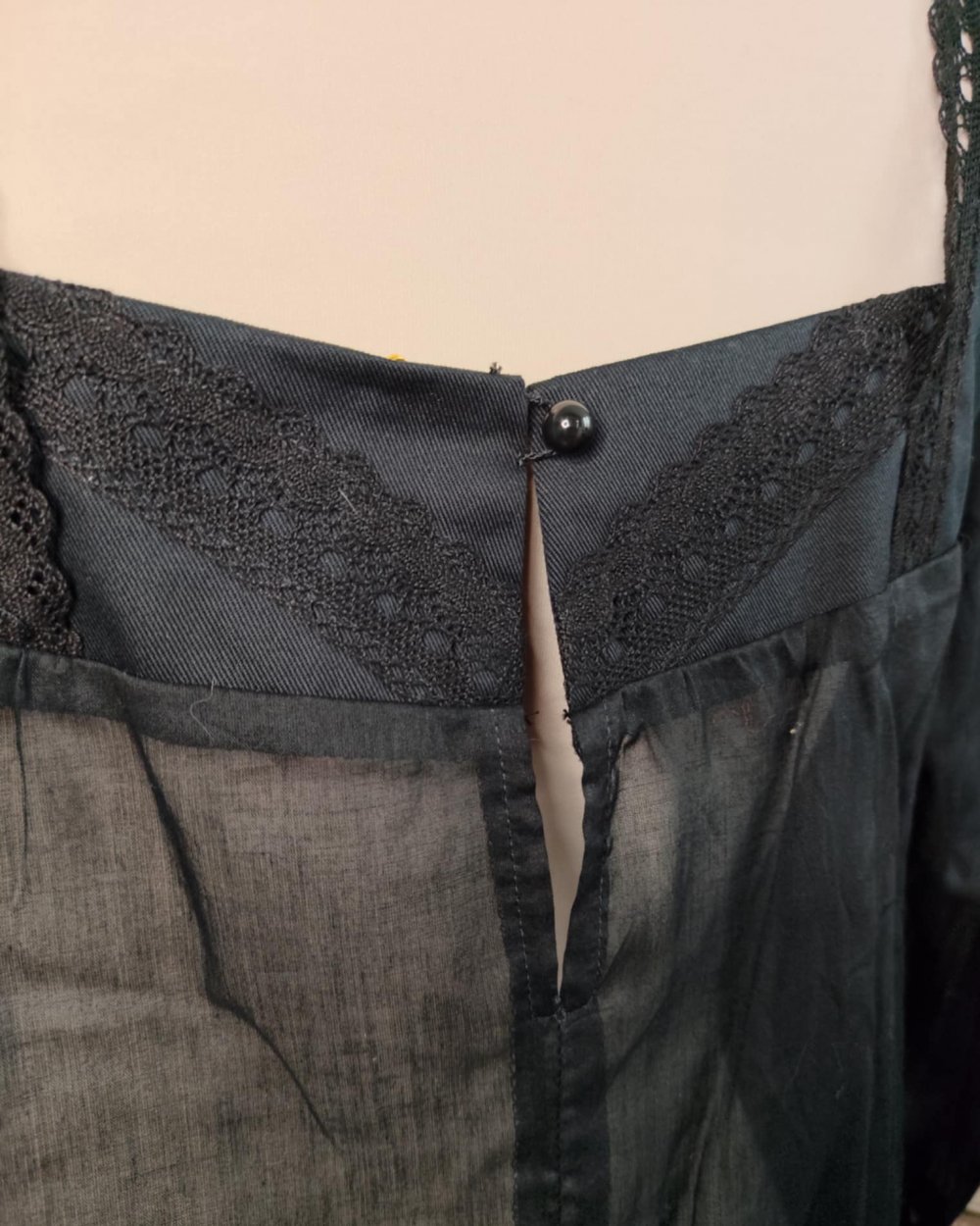 Pour cette blouse j'ai travaillé un patron avec un empiècement en plastron sur le devant et le dos, ornés broderies anciennes. Le bas de la blouse est coupé en trapèze dans un voile de coton et soie noir. Un petit bouton noir ferme l'empiècement du dos.