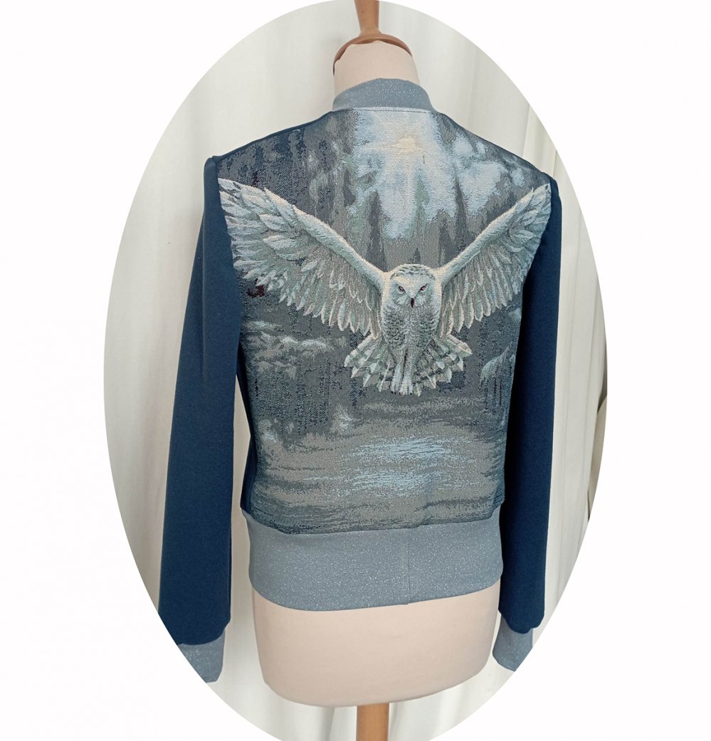 Blouson court style Bomber en maille bleue et carré Jacquard motif de chouette blanche.