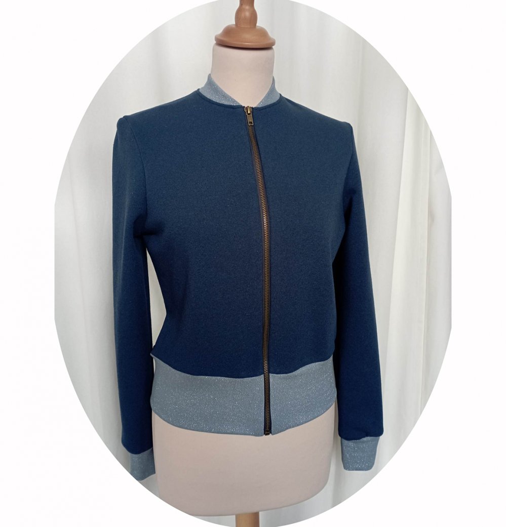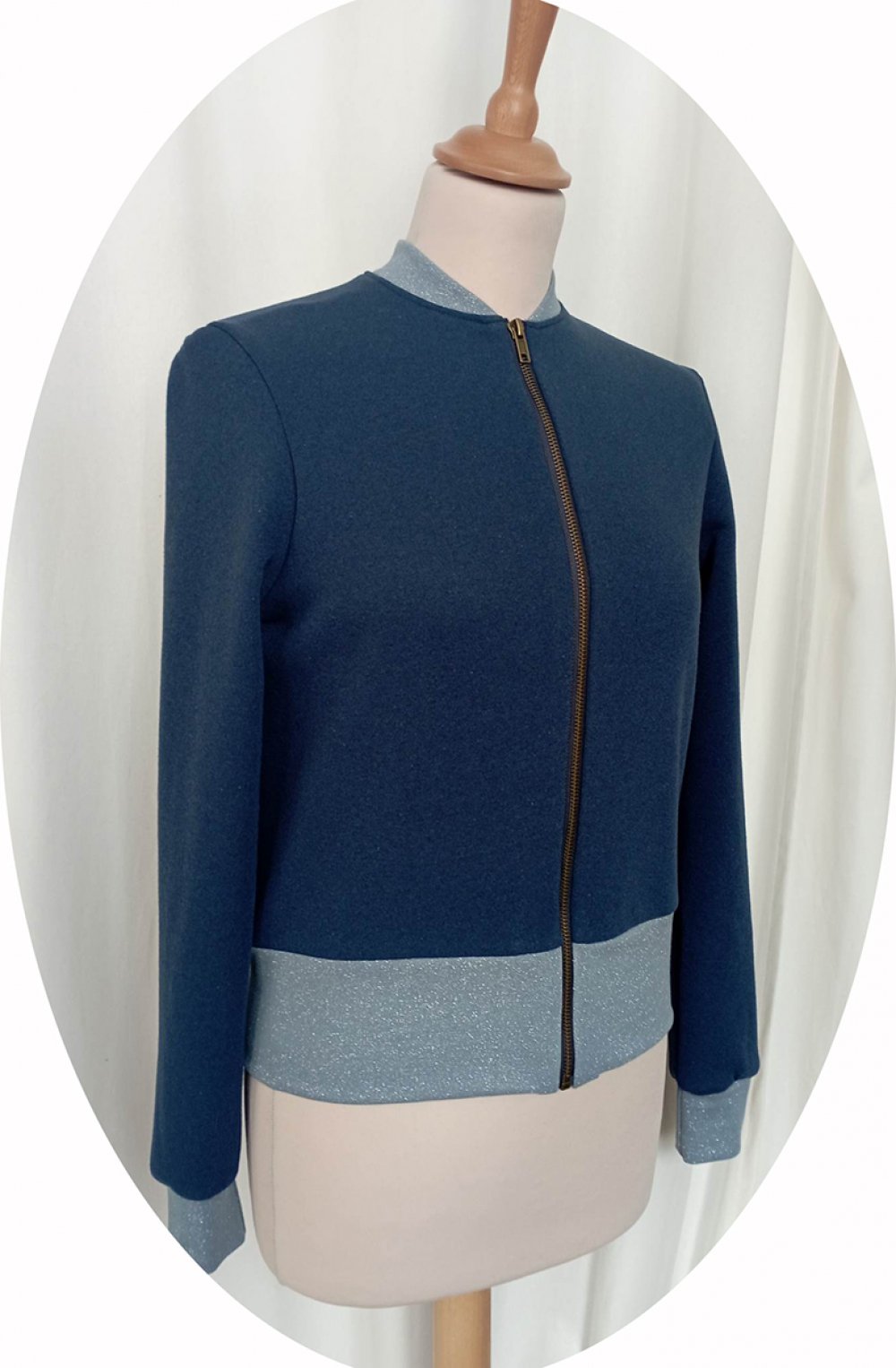 Pour ce bomber court, j'ai choisi une maille molleton gratté, c'est un sweat bleu marine. C'est une maille (donc souple et extensible) un peu épaisse dans un beau coloris bleu marine, en coton et polyester recyclés. Il est associé à un bord côte bleu clair à paillettes.