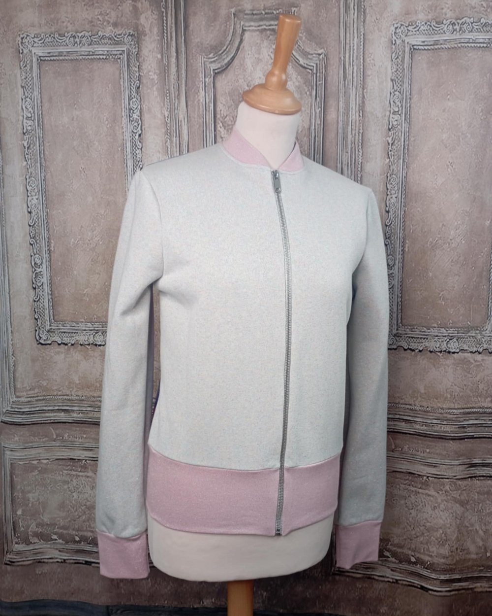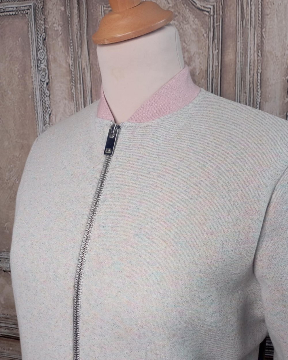 Pour ce bomber court, j'ai choisi une maille molleton gratté à fil lurex multicolore, c'est une maille de typesweat, d'une très bonne qualité. C'est une maille (donc souple et extensible) un peu épaisse avec un fil métallisé multicolore pour un effer licorne. Il est associé à un bord côte rose à paillettes argent.