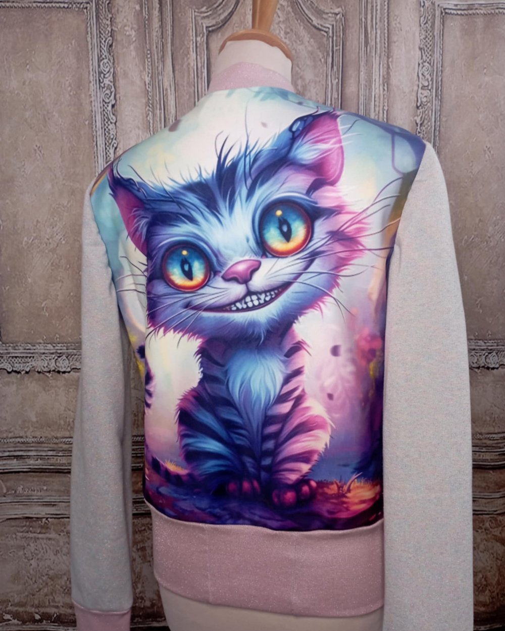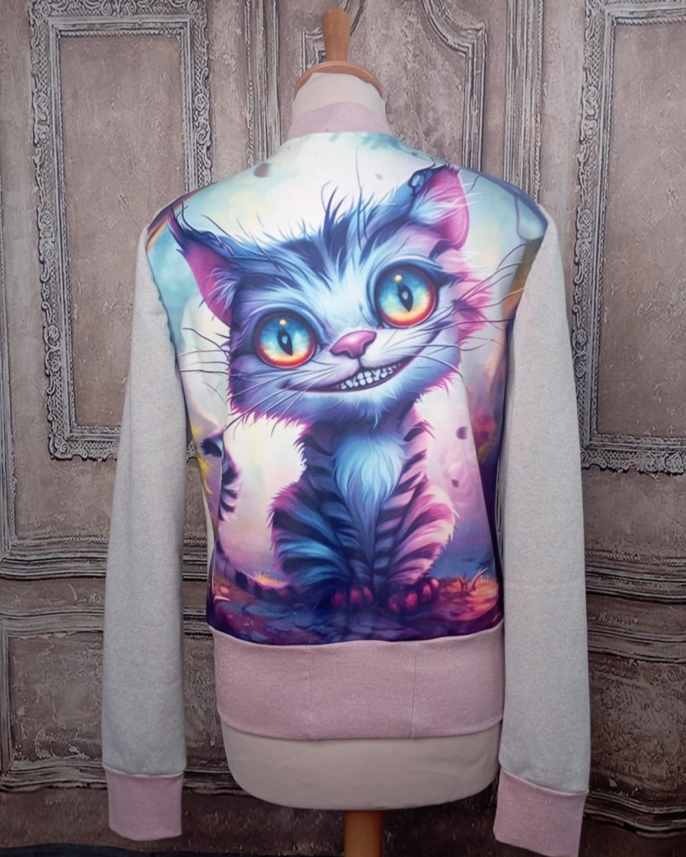 Blouson court style Bomber en maille sweat à fil lurex et carré velours motif Chat du Cheshire.