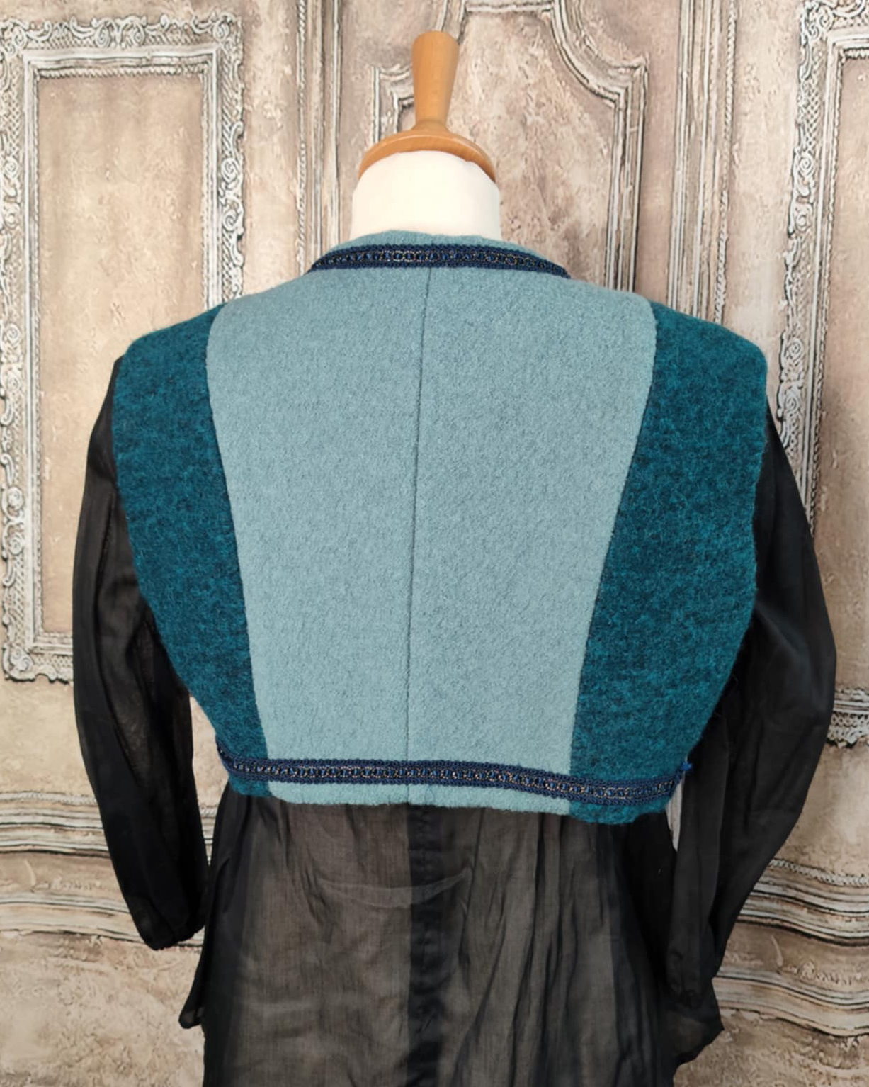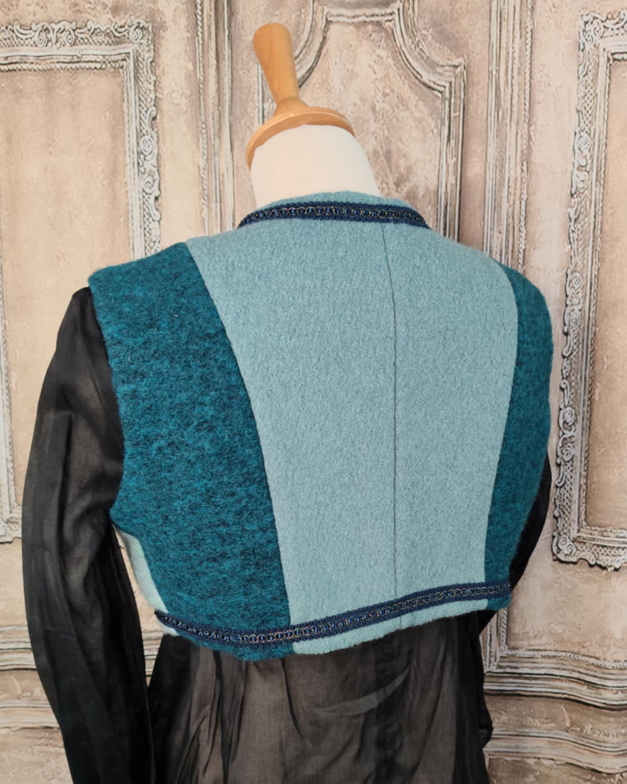 Ce boléro est coupé dans trois lainages bleus. Il se porte ouvert, le tour du boléro est souligné d'un galon de passementerie bleu marine.