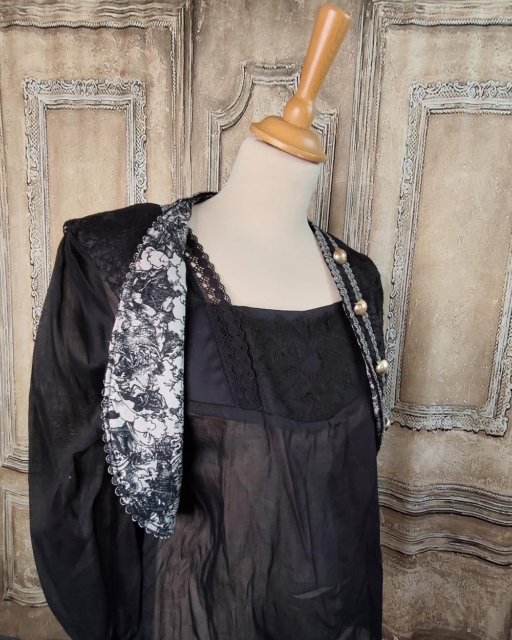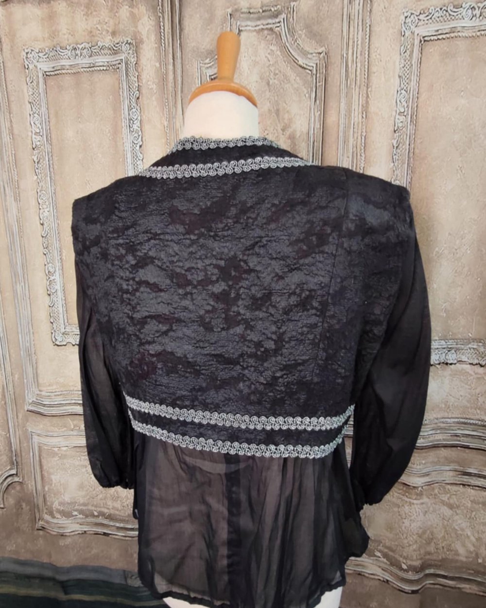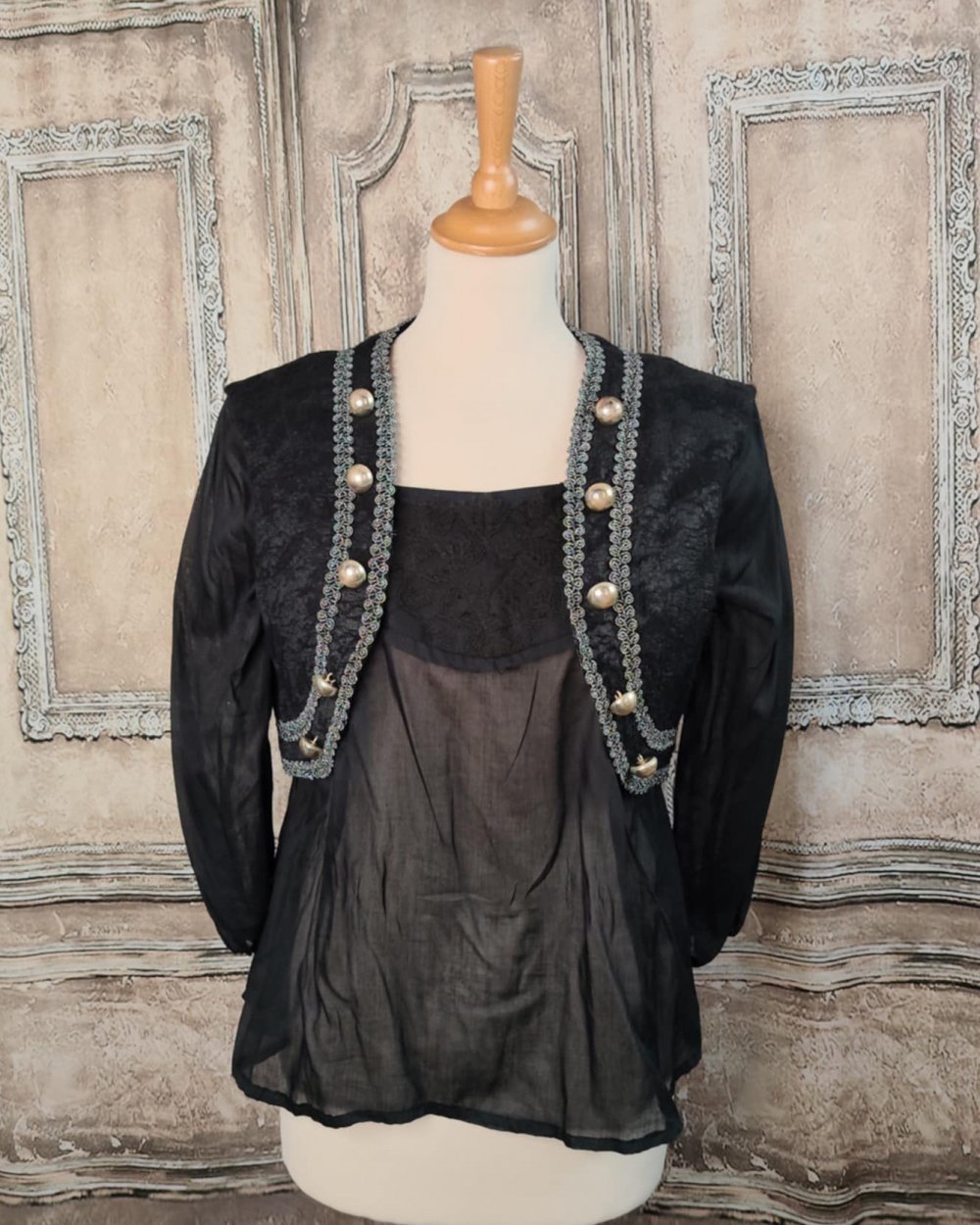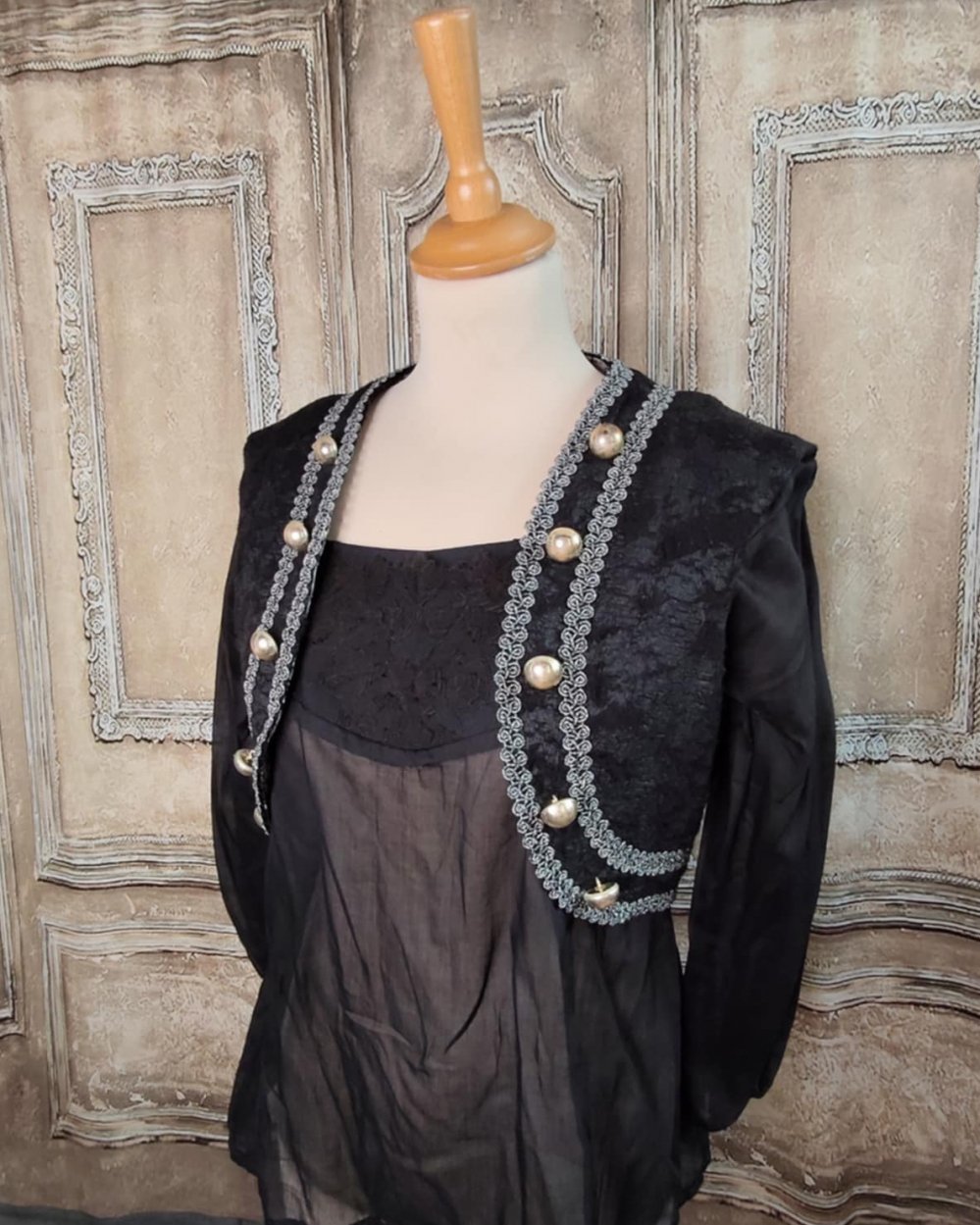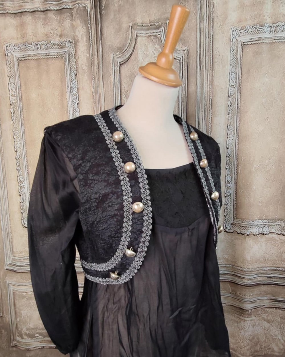 Ce boléro est coupé dans un drap de laine noire. Il se porte ouvert, le tour du boléro est souligné d'une double bande d'un galon de passementerie argent et de boutons argentés.