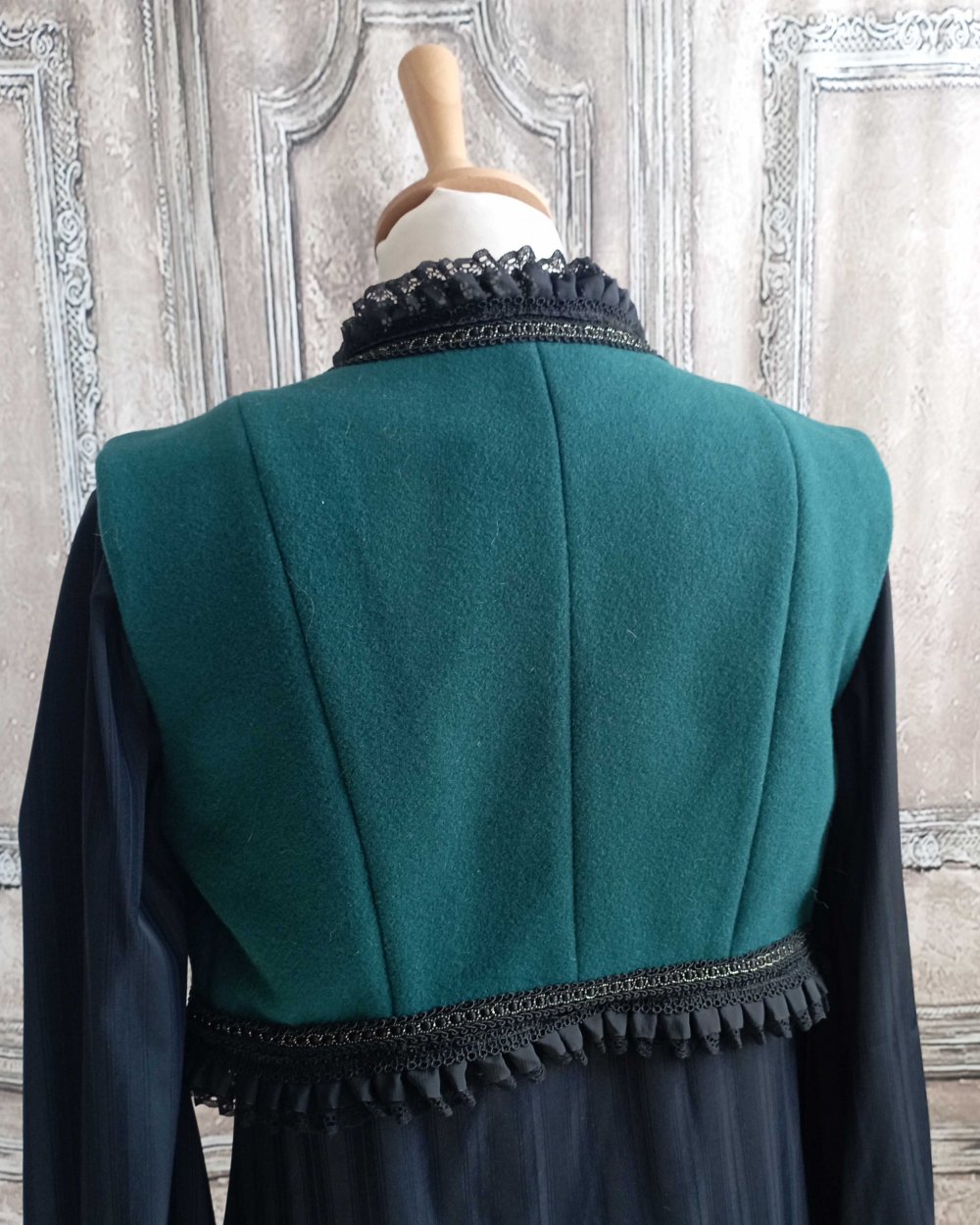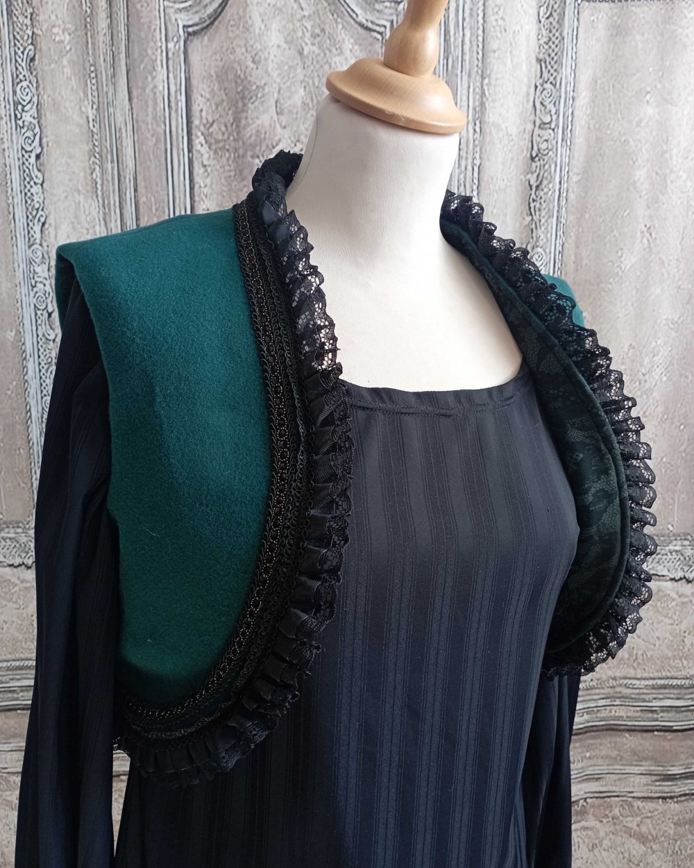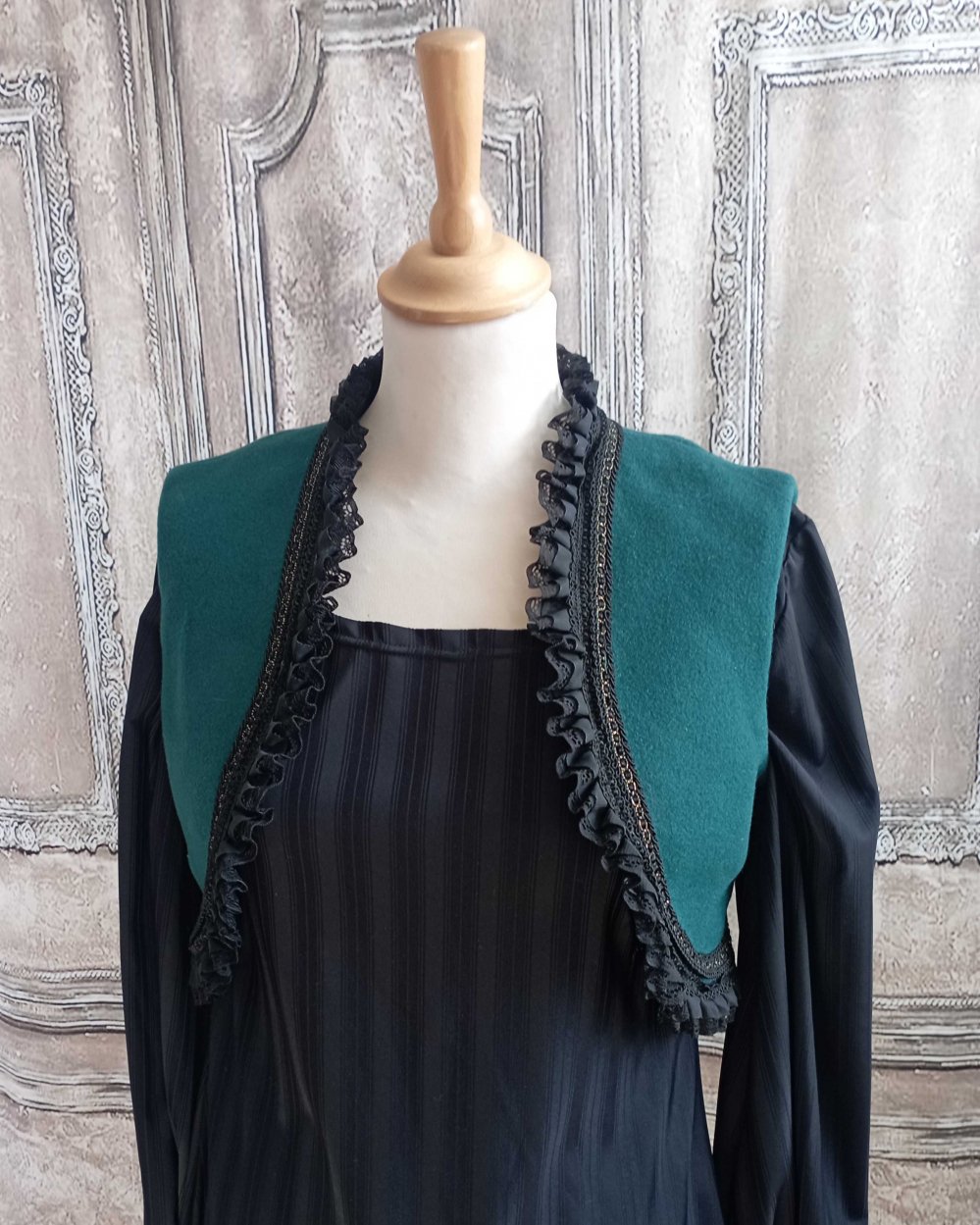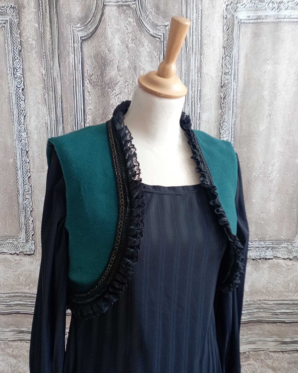 Ce boléro est coupé dans un drap de laine vert émeraude. Il se porte ouvert, le tour du boléro est souligné d'une bande d'un galon de passementerie noir et doré et d'un ruban volanté noir.