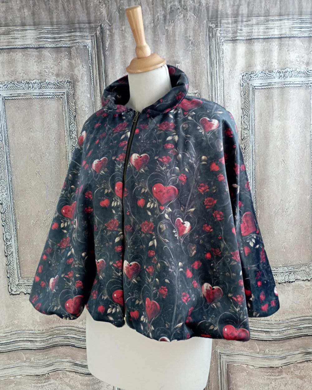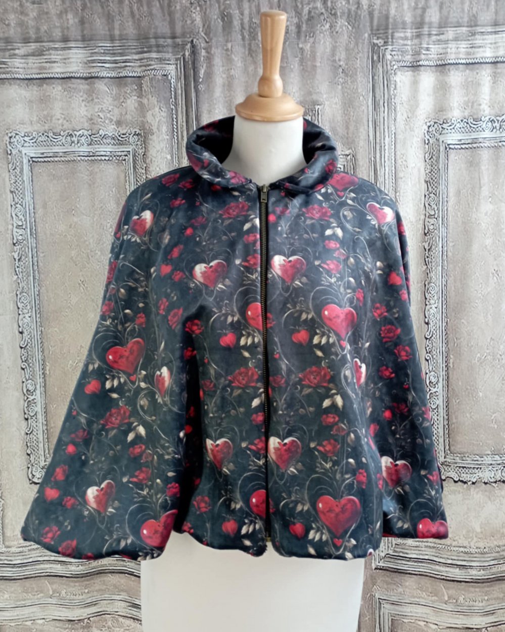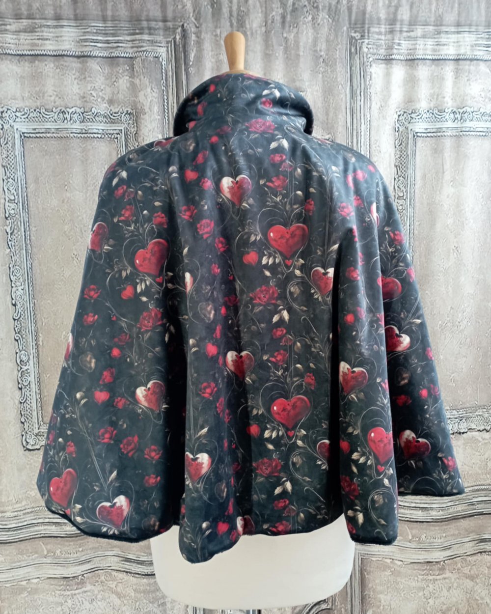 Cape Reine de Coeur en velours noir imprimé coeurs rouges