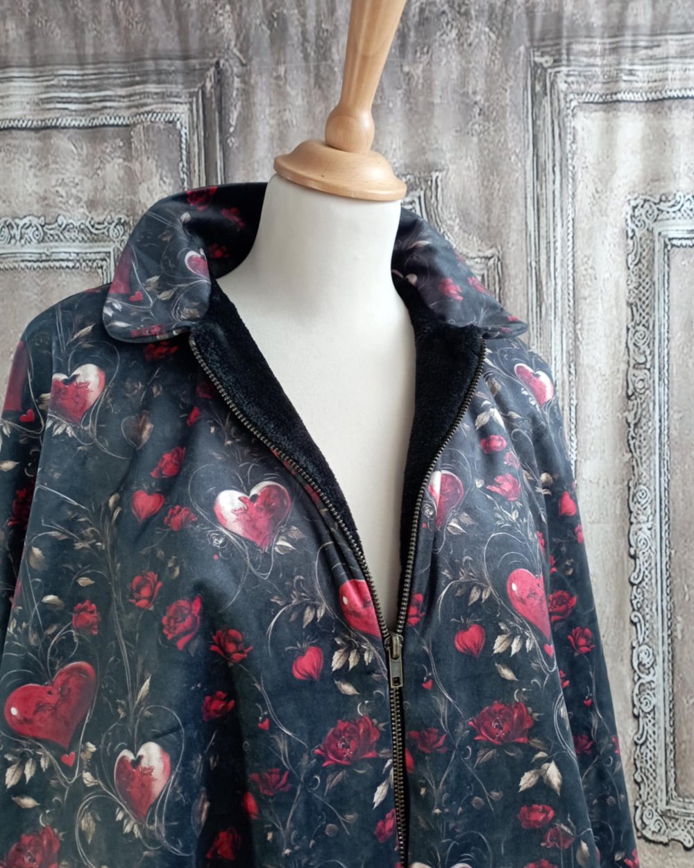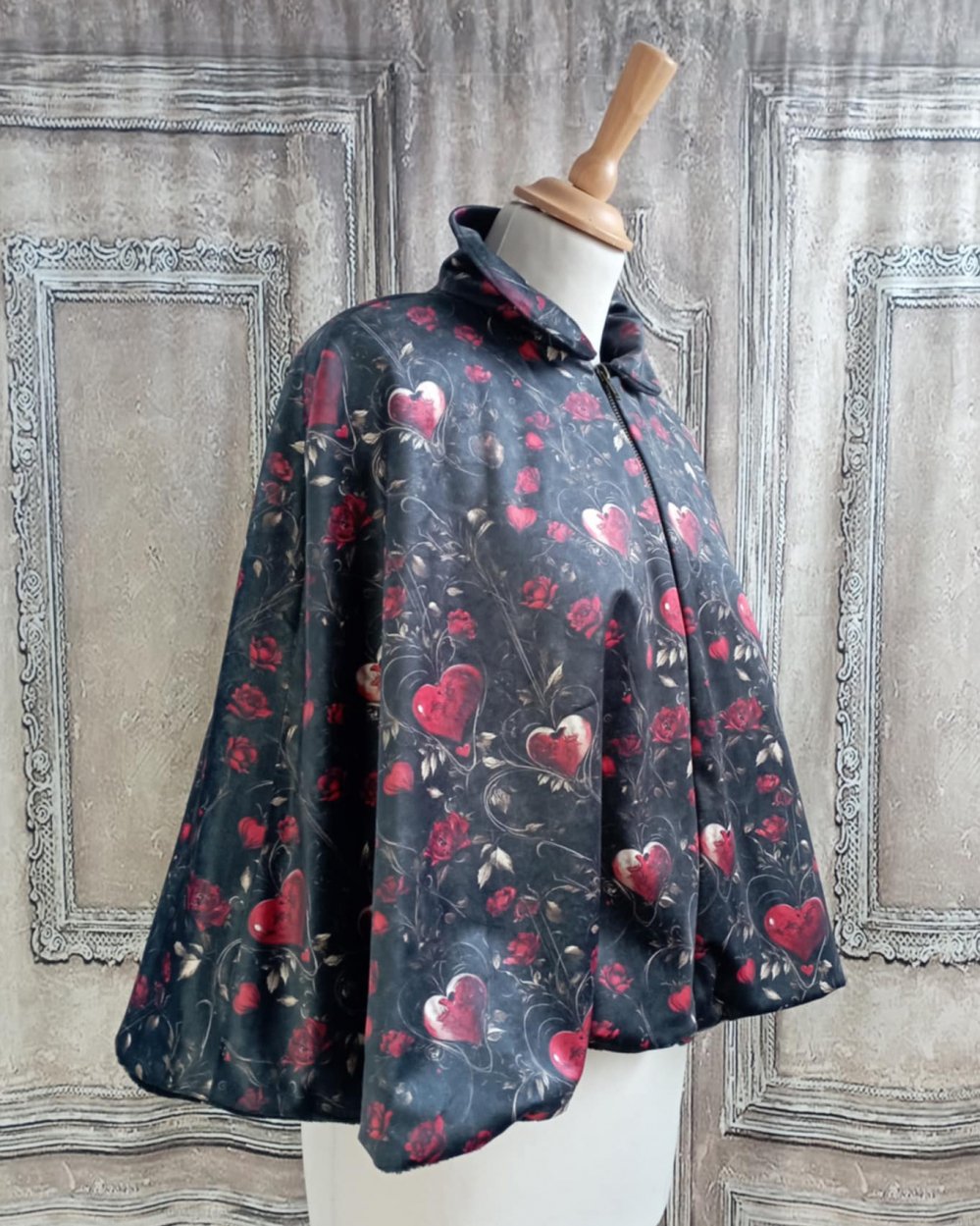 Cape noire et rouge à col montant en velours imprimé coeurs rouges et polaire noire.