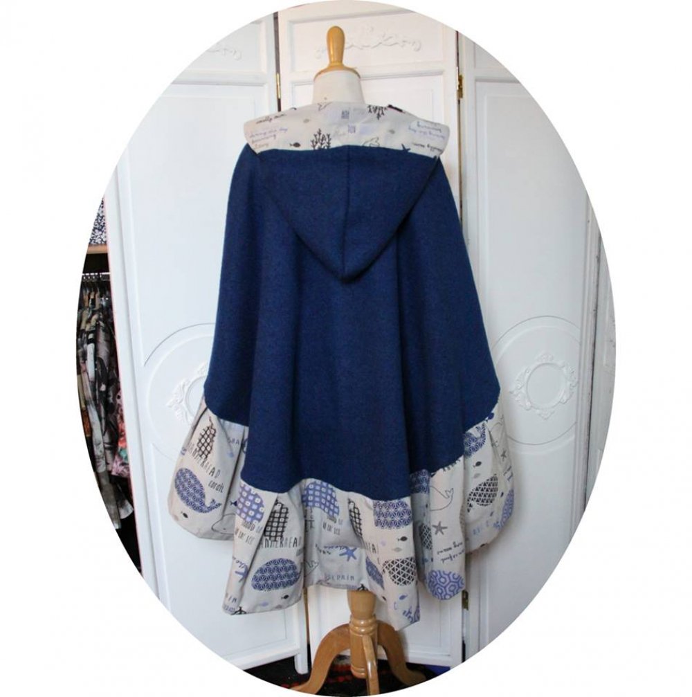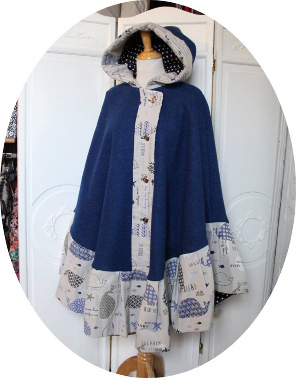 Pour cette cape j'ai choisi une belle laine bleue, souple et chaude avec un beau tombé. Pour la doublure, un superbe (oui, superbe, voire même magnifique) coton bleu marine a pois blancs. Le bas de la cape est entièrement orné d'une large bande de tissu jaquard gris a motifs de baleines et poissons bleus qu'on retrouche sur le tour de la capuche et l'avant de la cape.