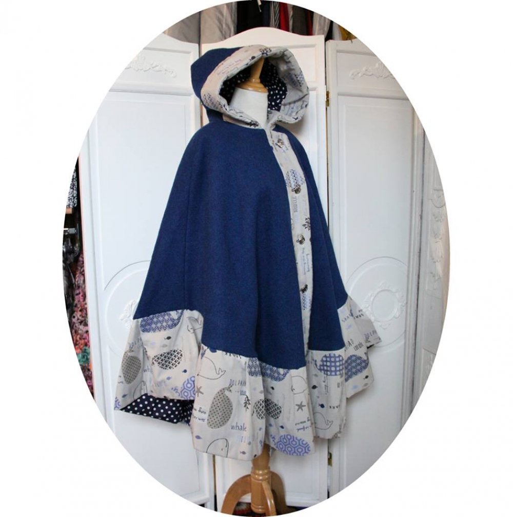 Grande cape ample a capuche pure laine bleu roi et tissu jaquard gris a motif de baleines bleues et grises.