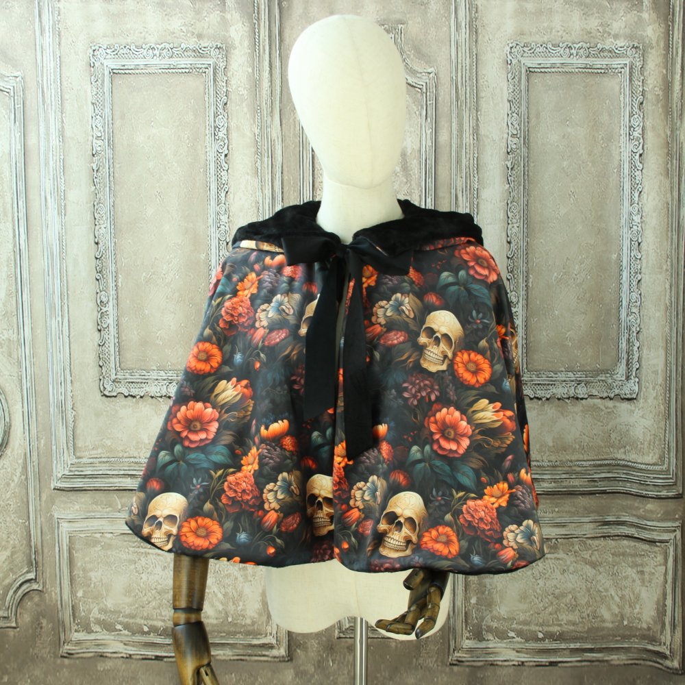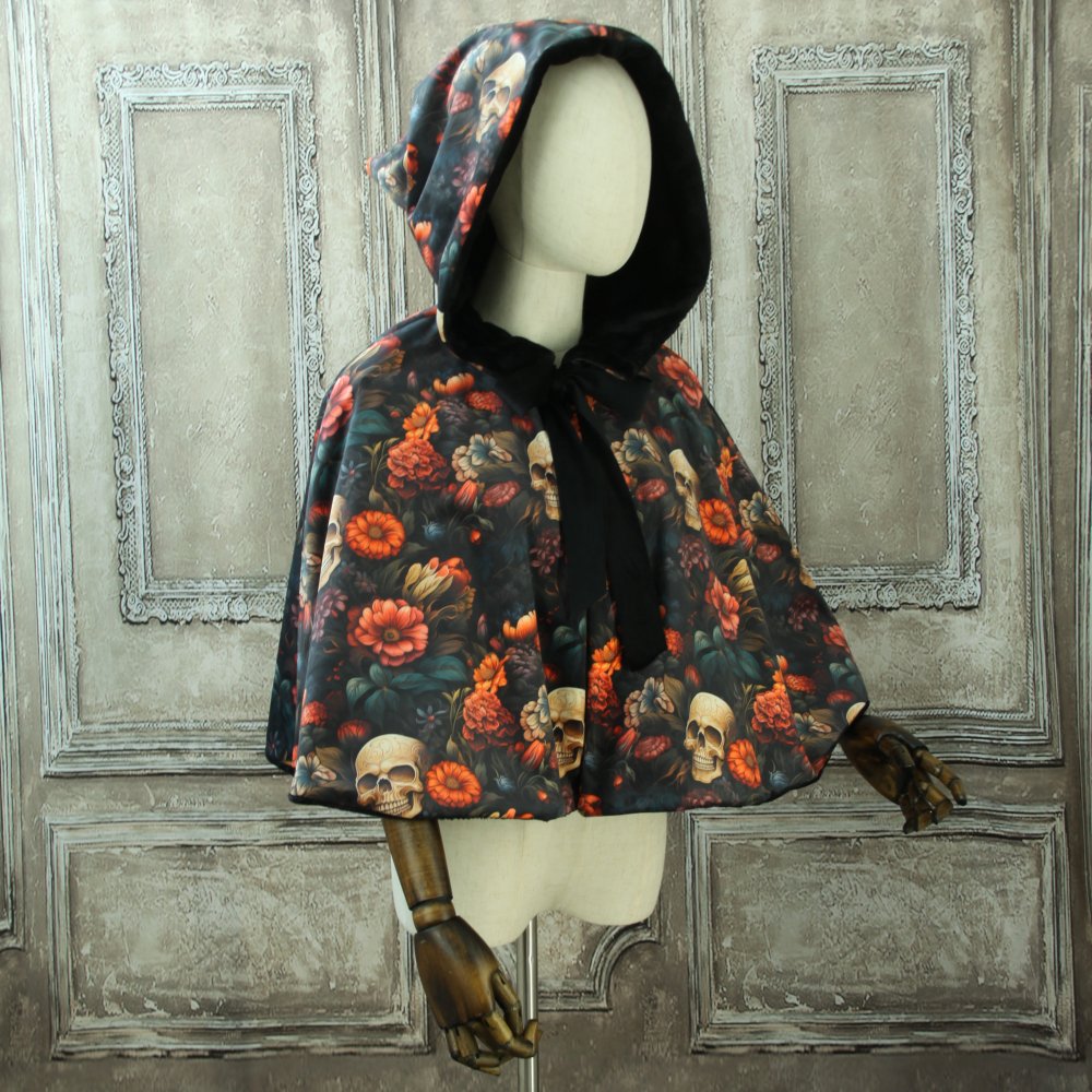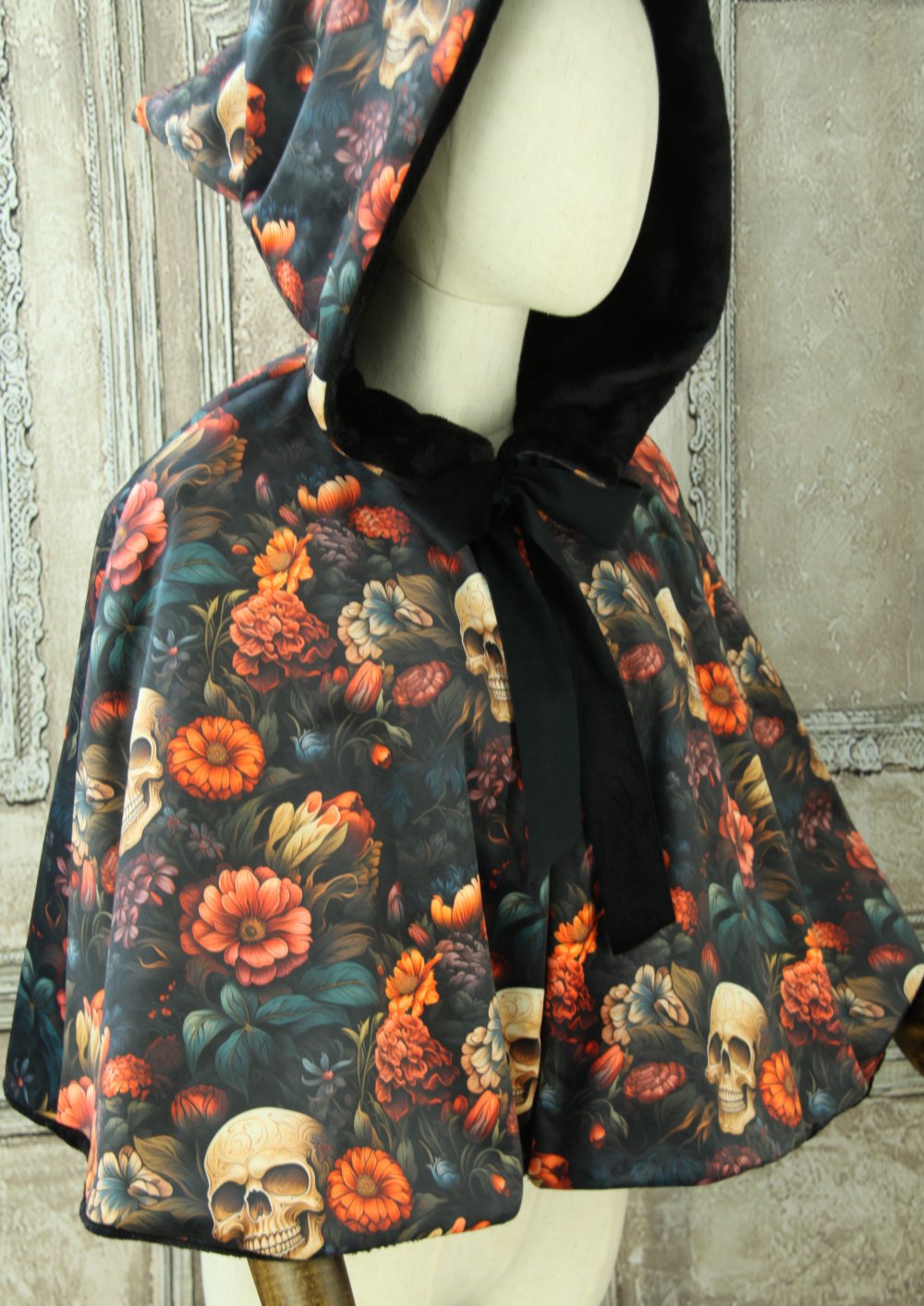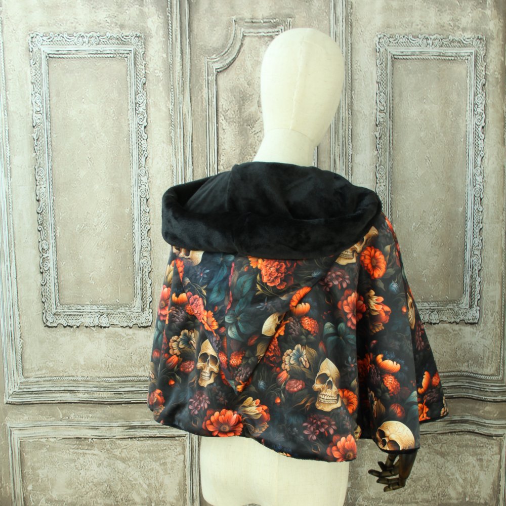 Cape noire à capuche en velours imprimé fleurs et crânes et polaire noire.