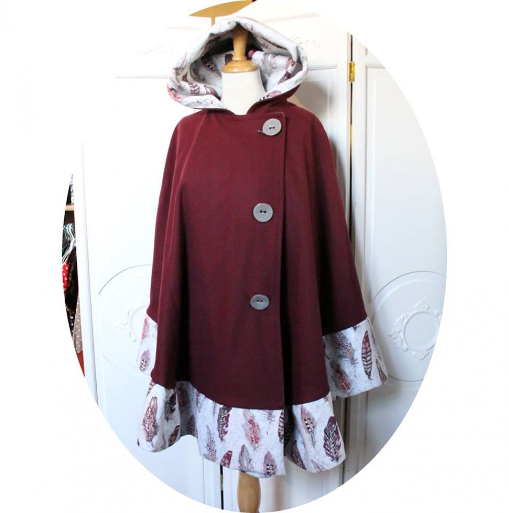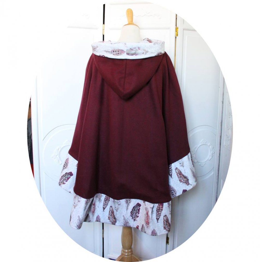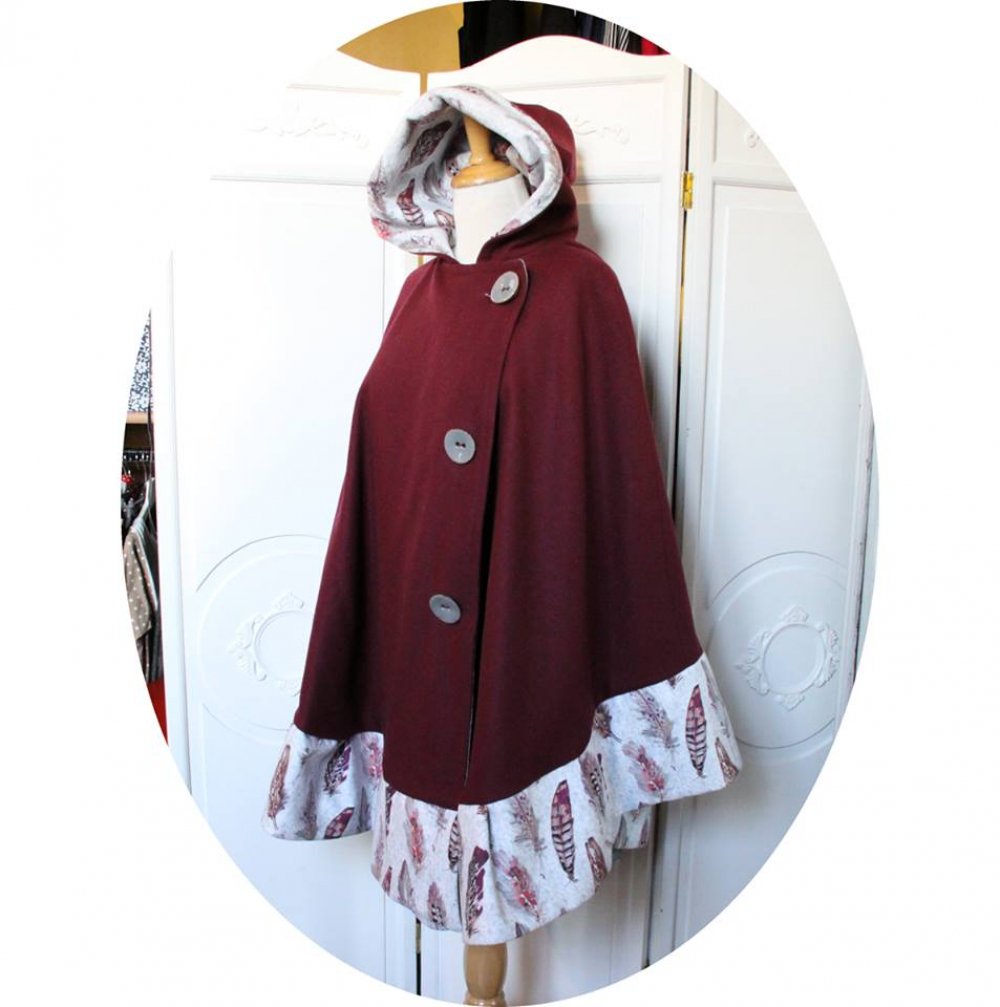 Grande cape ample a capuche en drap de laine violet prune et velours gris perle imprime plume.