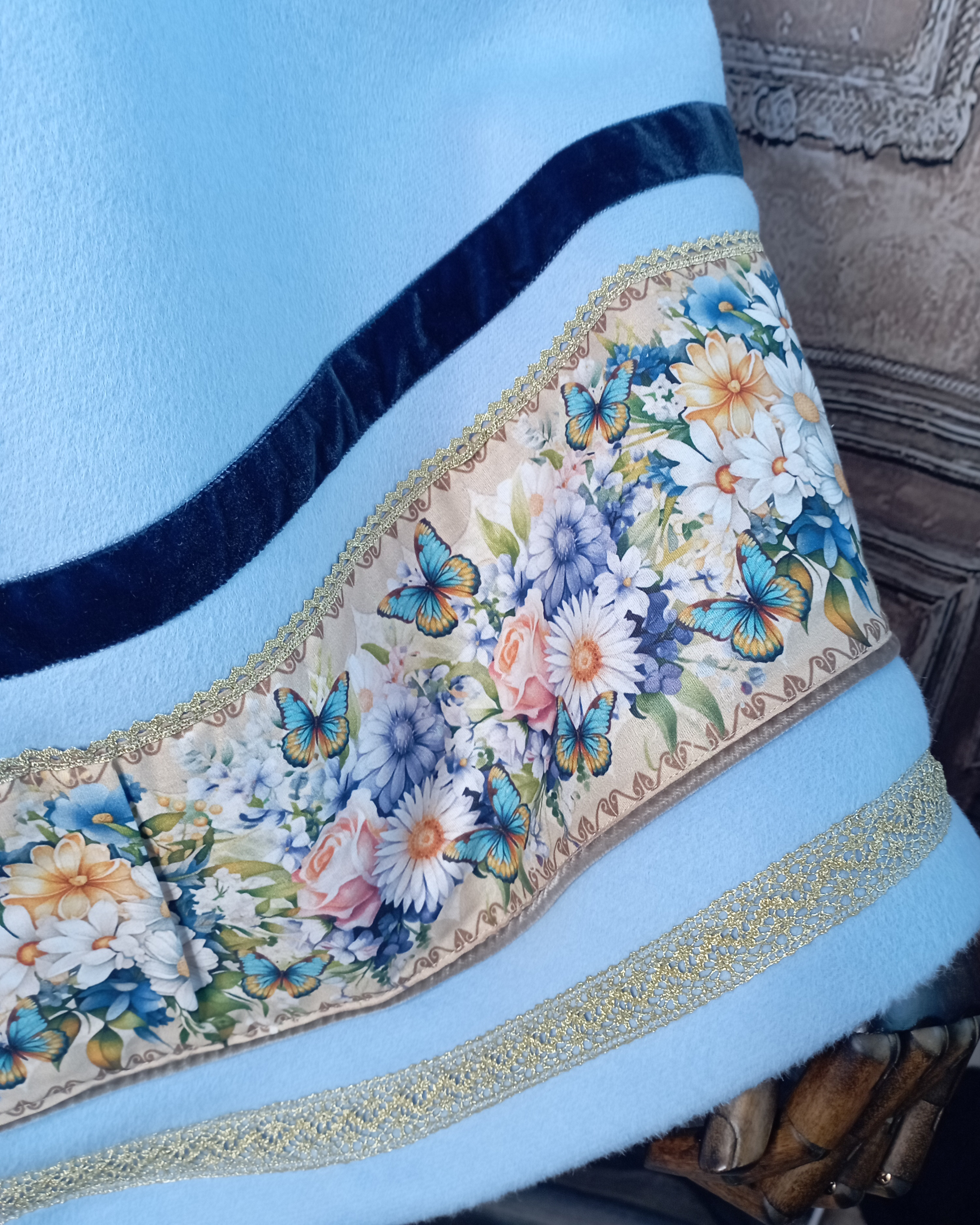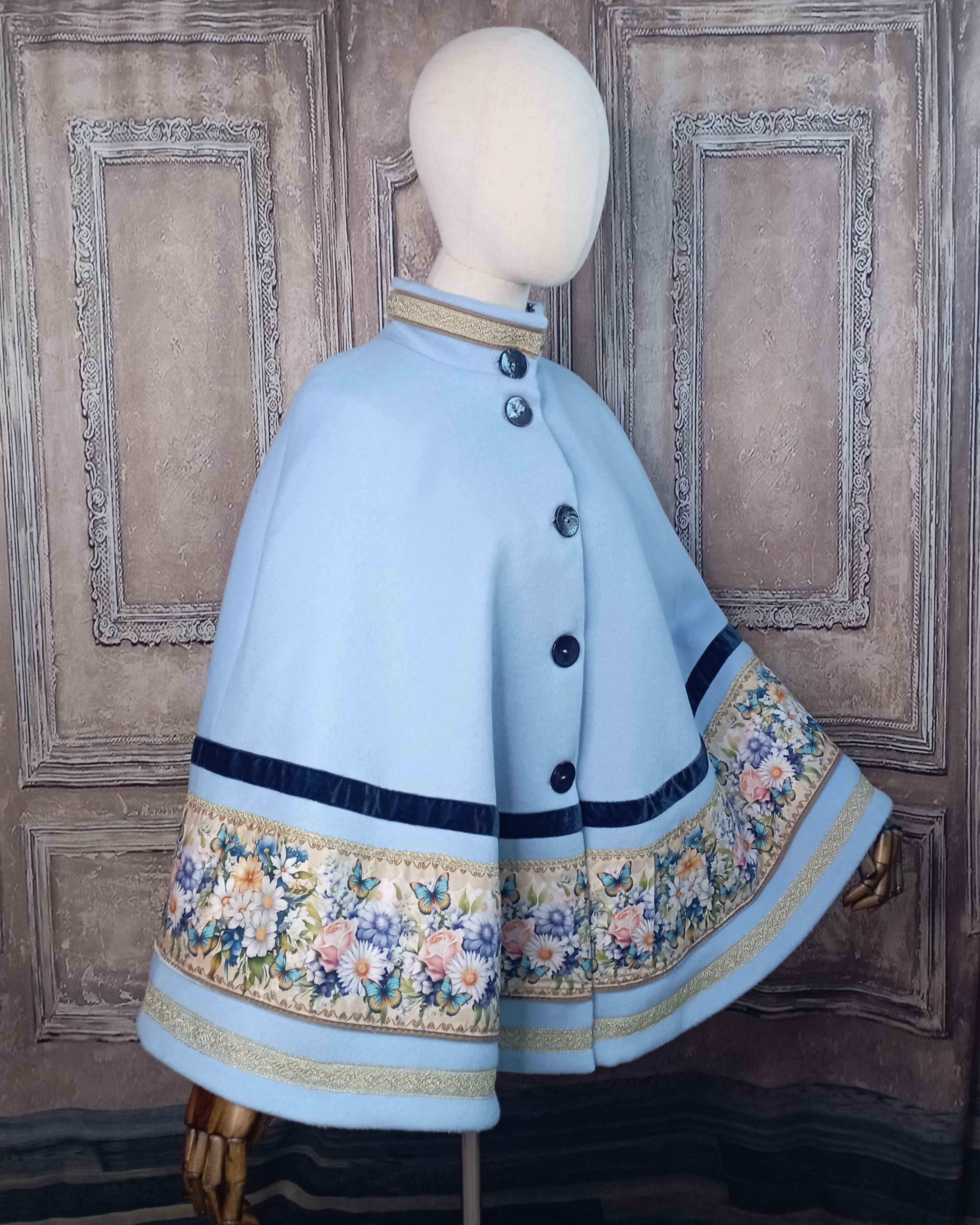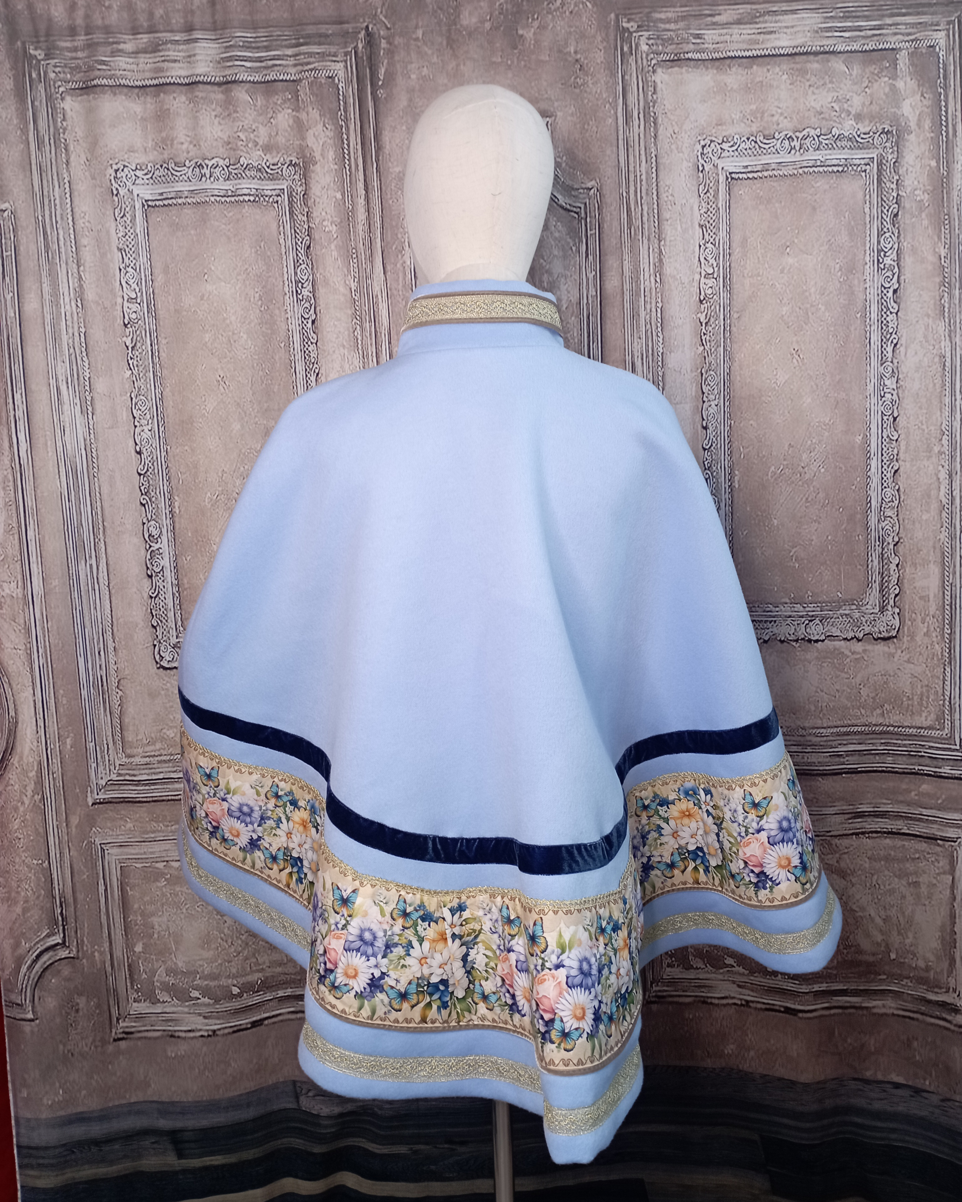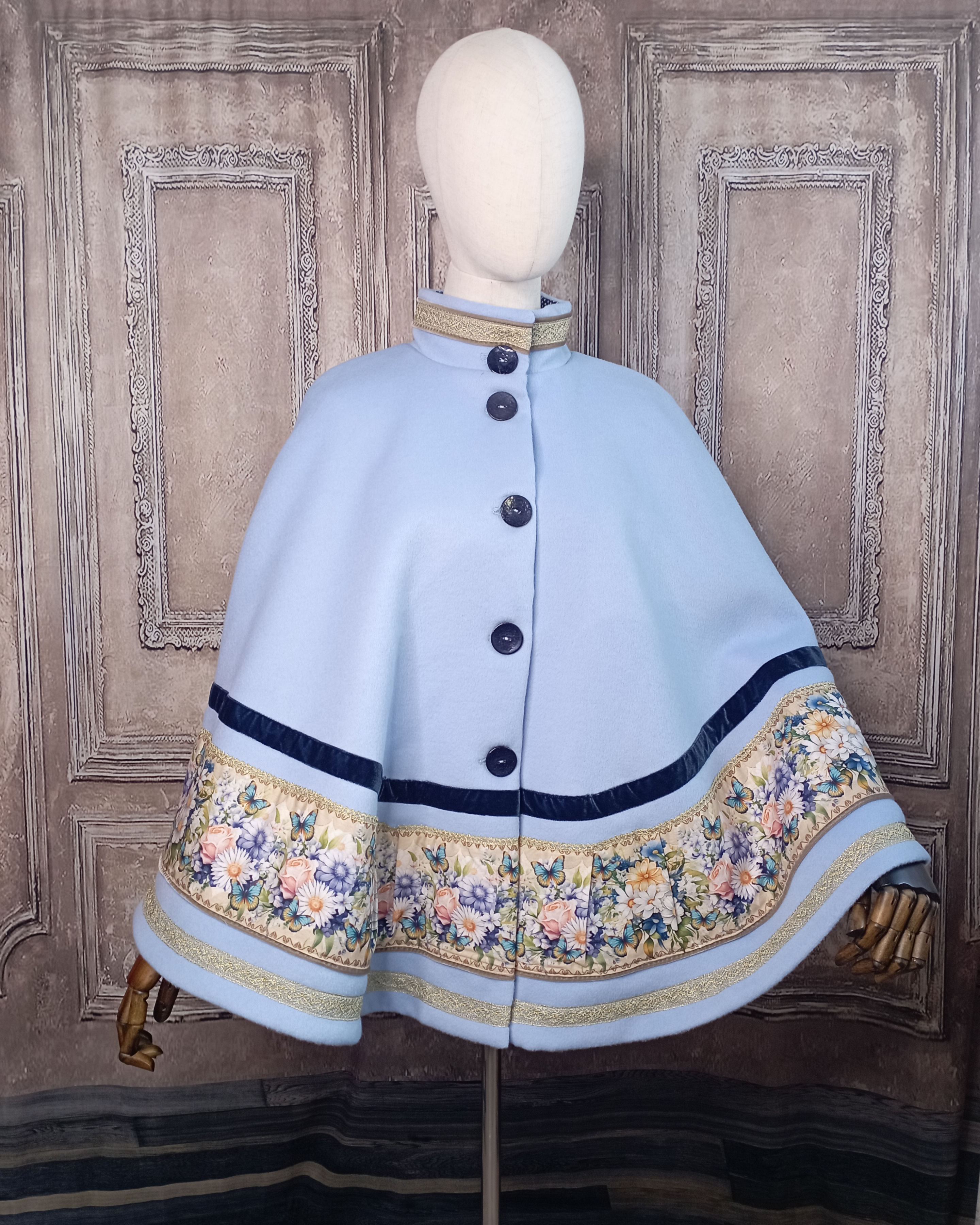 Cape en laine bleu pervenche et galon imprimé marguerite